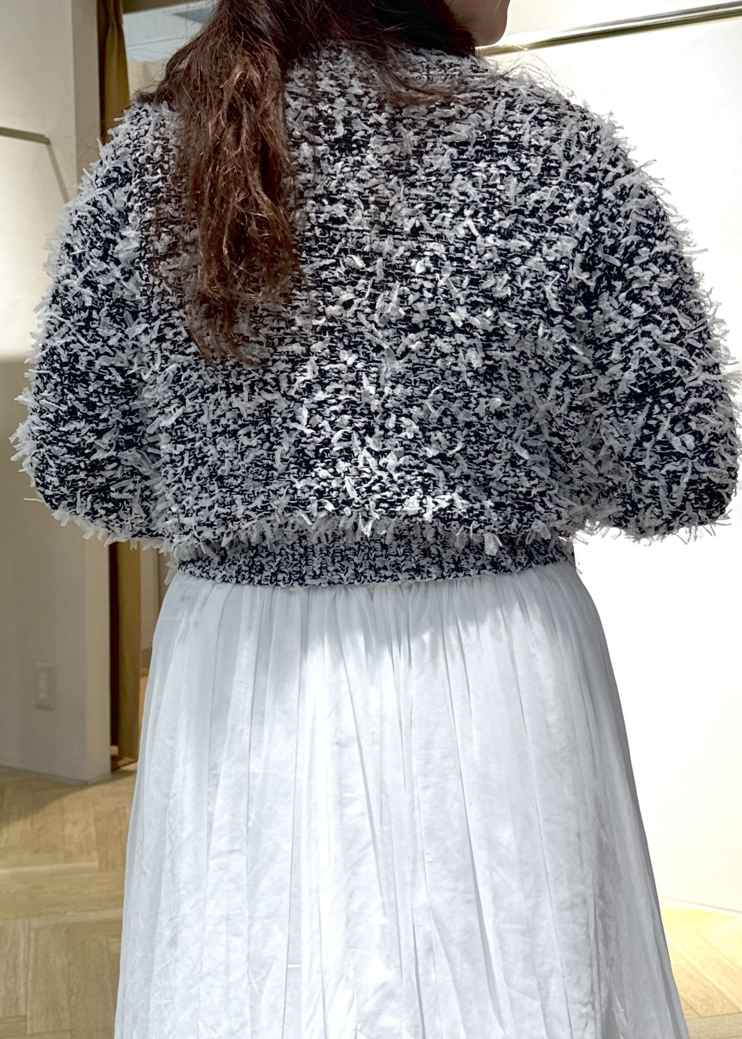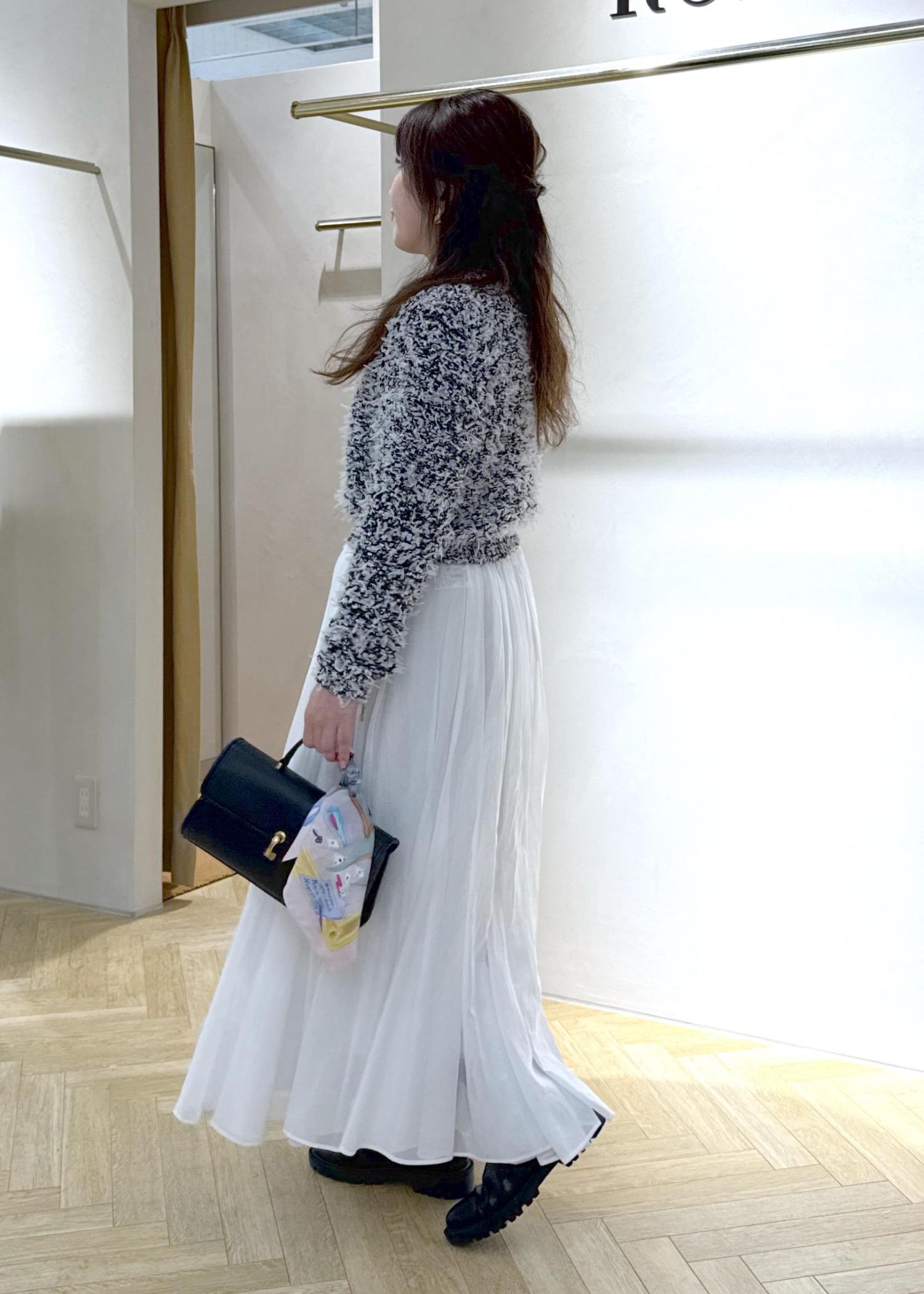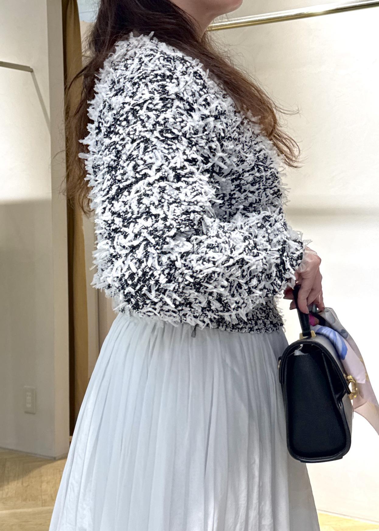 ツイードっぽい雰囲気のニットは今から着れる春アイテム。