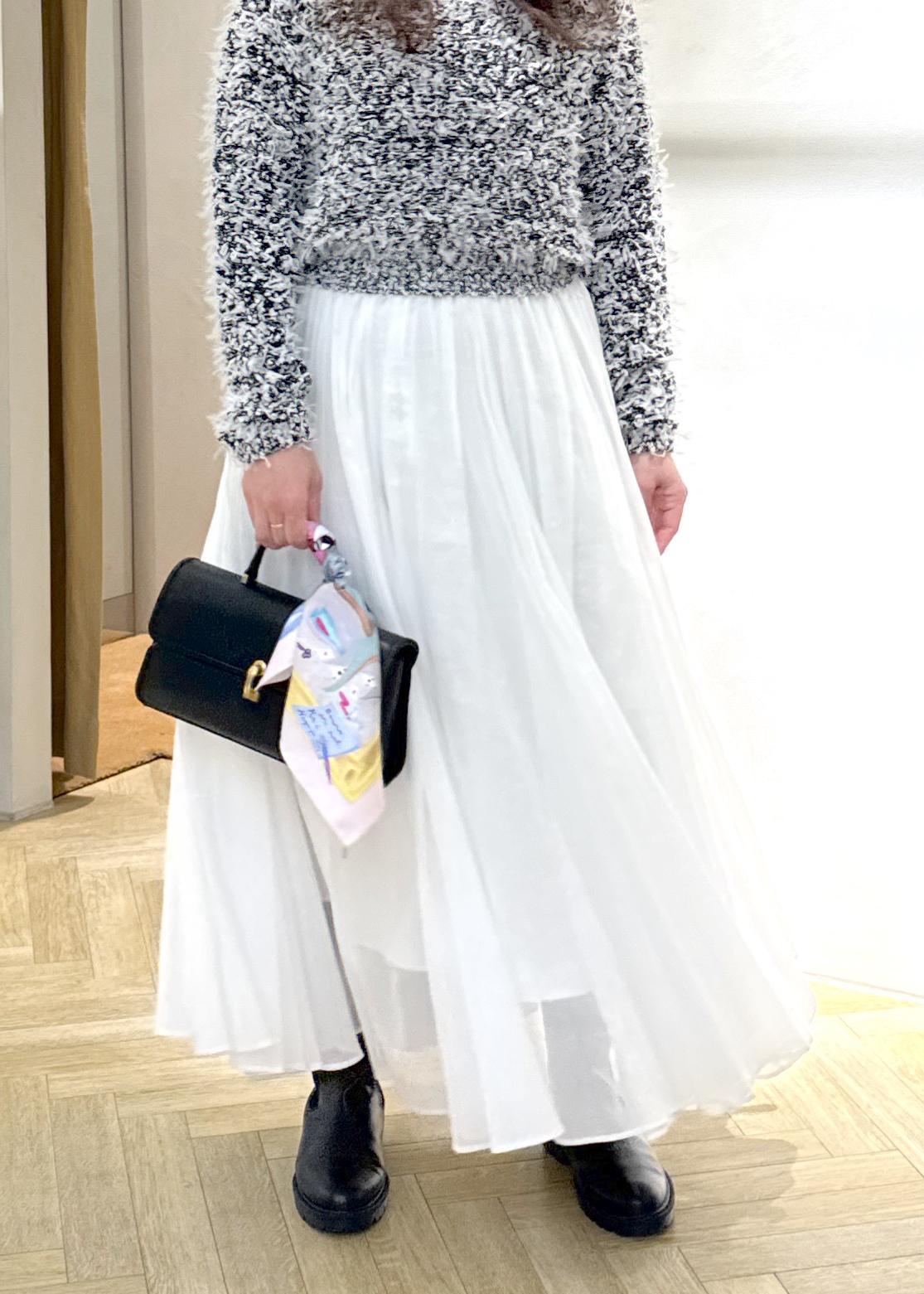 ふんわりボリューム感のあるスカートと短めな着丈のトップス合わせはスッキリ見えるオススメなコーデです。