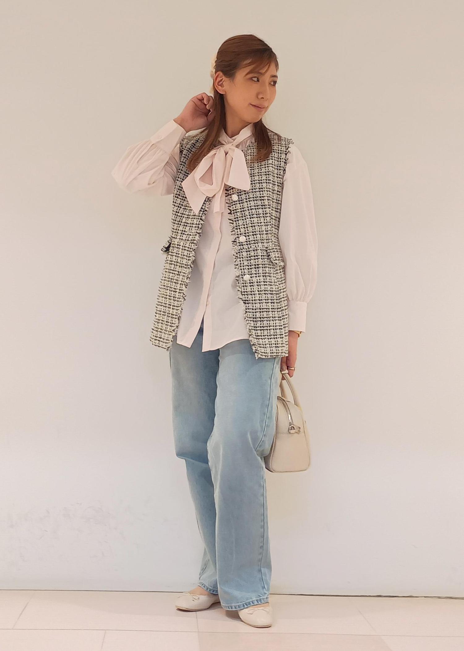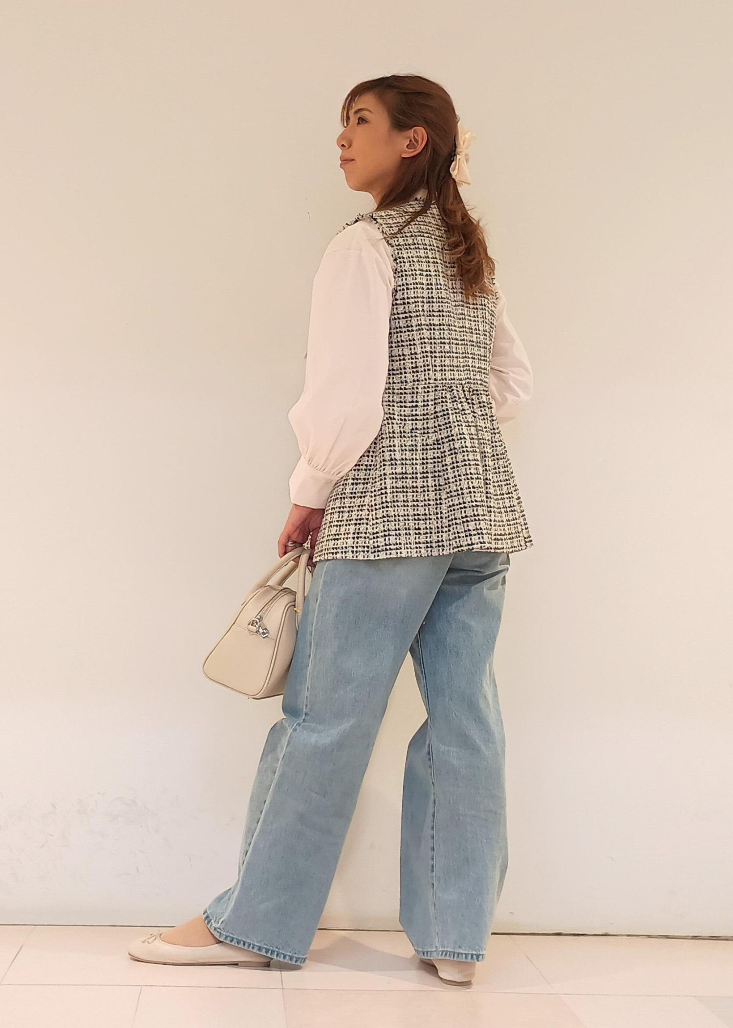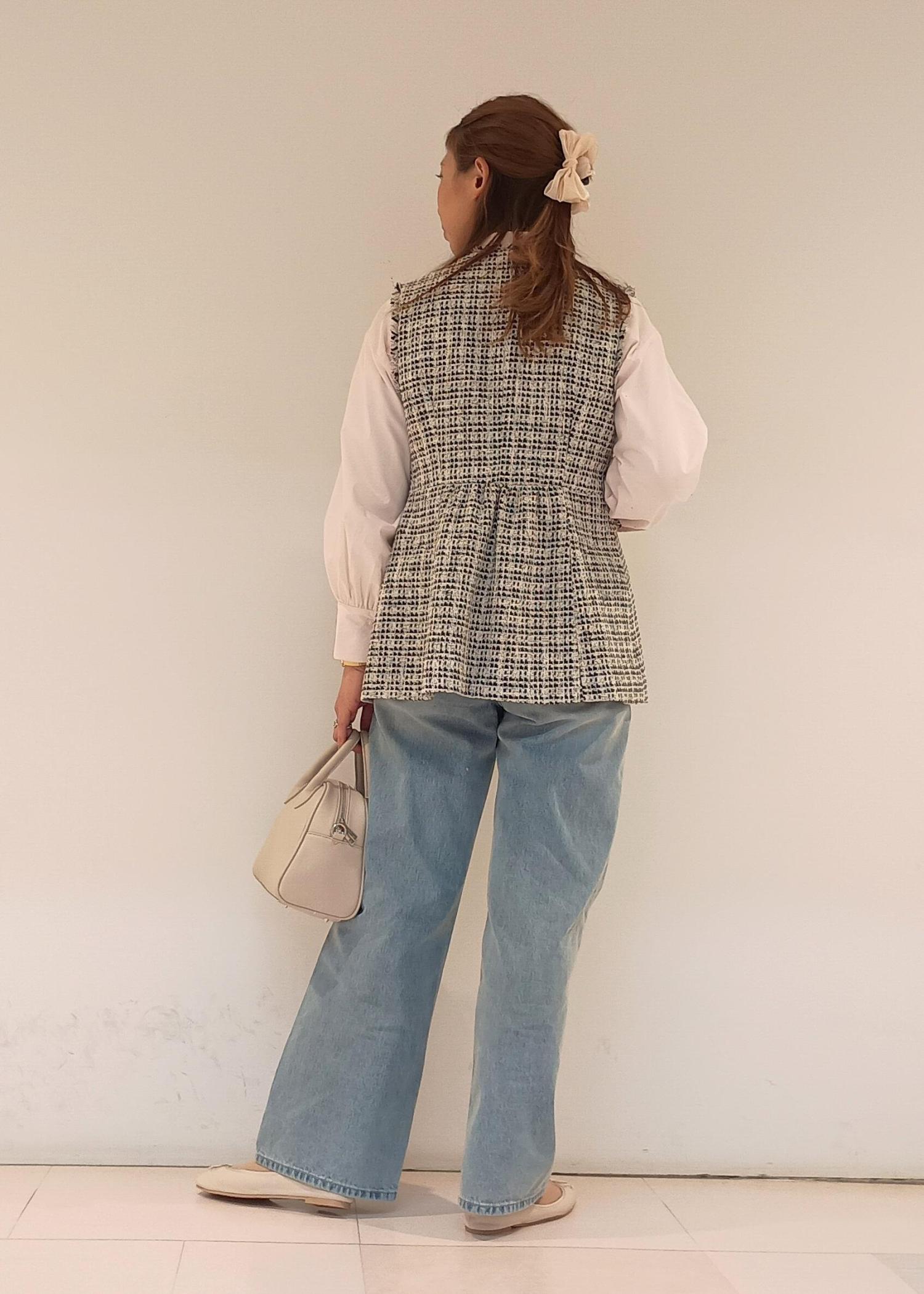 セレモニーで着たツイードジレを、普段使いにも着回したい!ということでデニムパンツでカジュアルダウンしてみました。オフィスカジュアルとしてもおすすめのスタイルです。