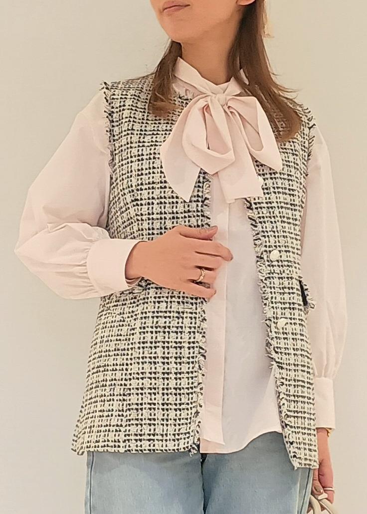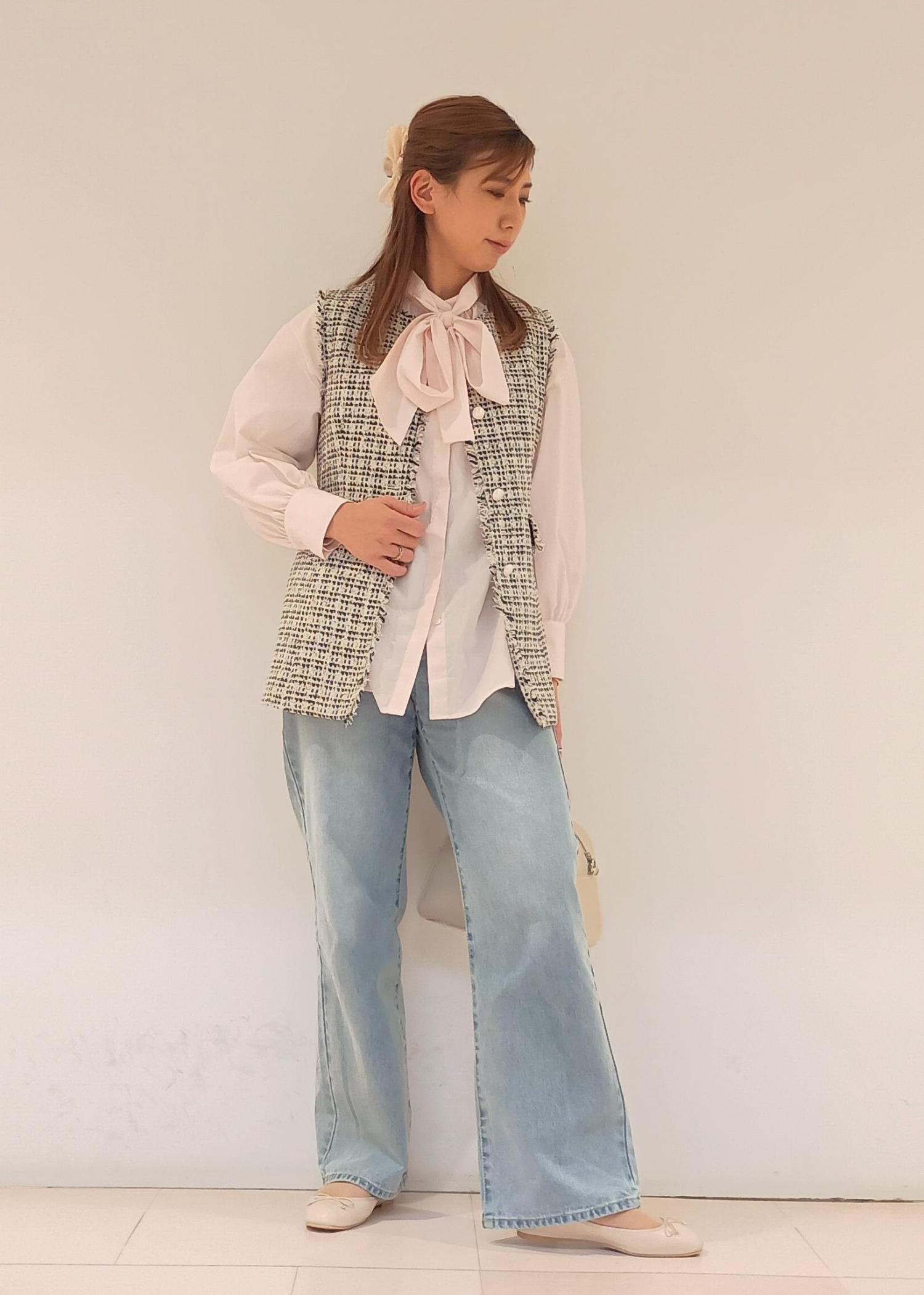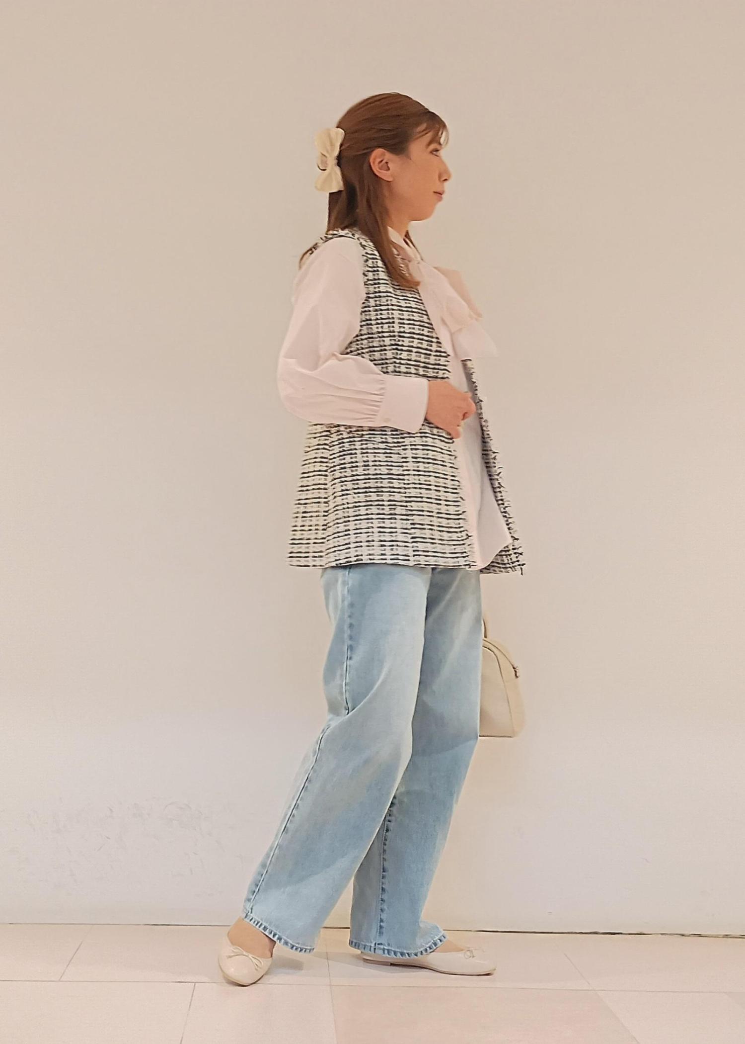 セレモニーで着たツイードジレを、普段使いにも着回したい!ということでデニムパンツでカジュアルダウンしてみました。オフィスカジュアルとしてもおすすめのスタイルです。