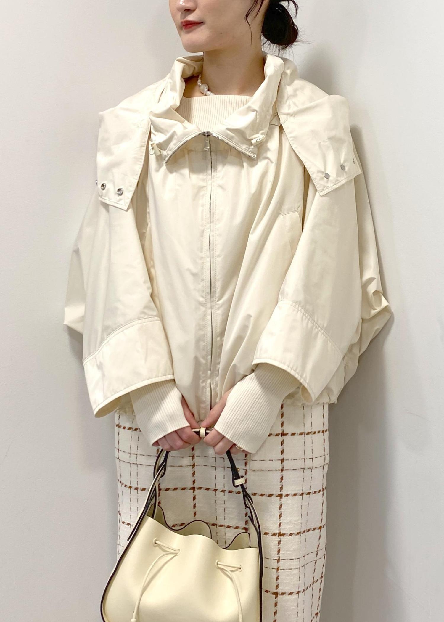 マウンテンパーカーといえば、カジュアル要素が強いイメージですが、素材の上品な光沢や三角形のシルエットから、フェミニンなお洋服やキレイめカジュアルなお洋服にも合わせていただけます♪