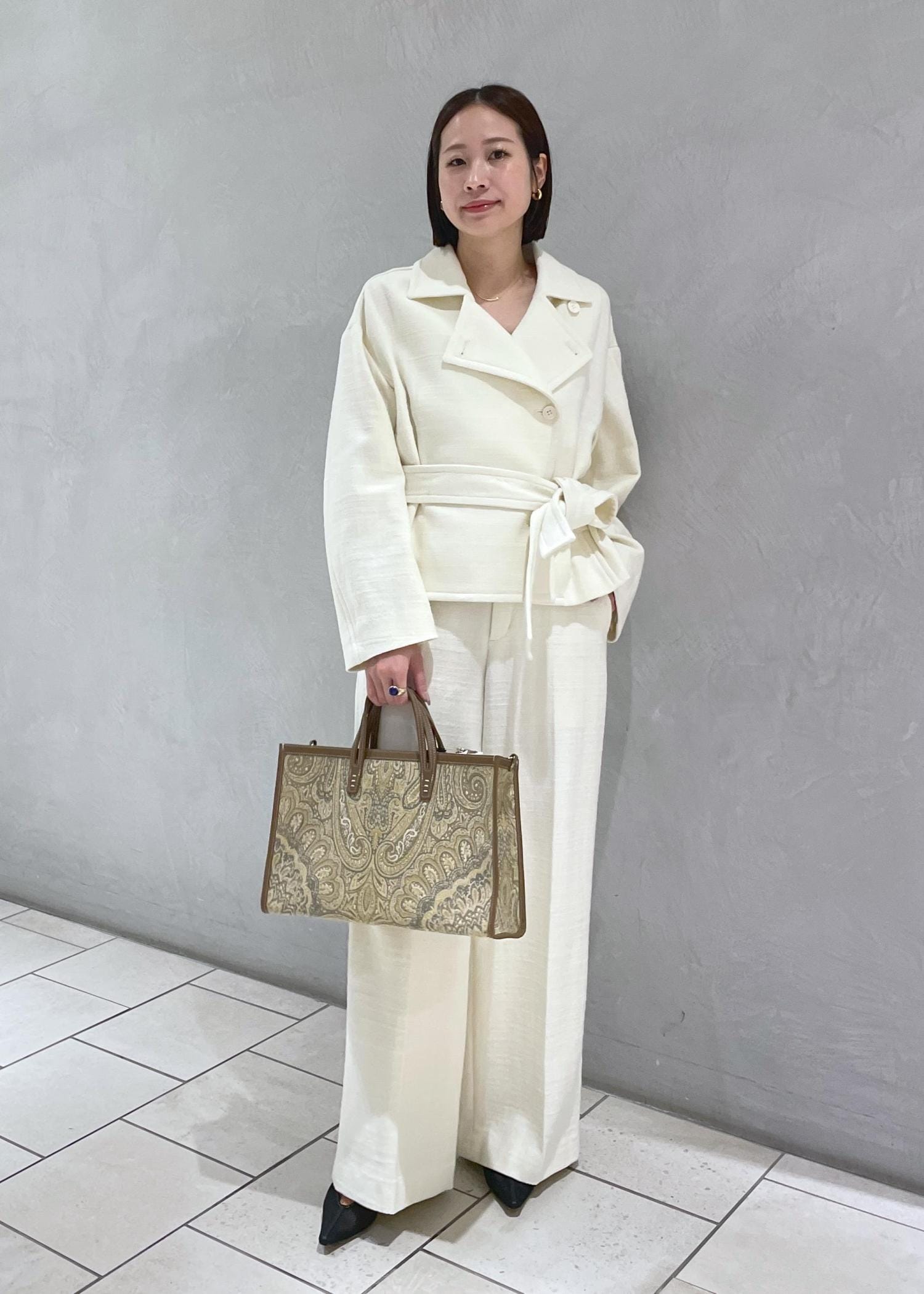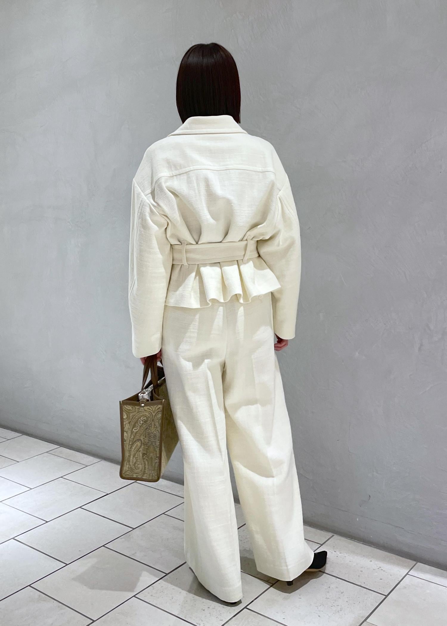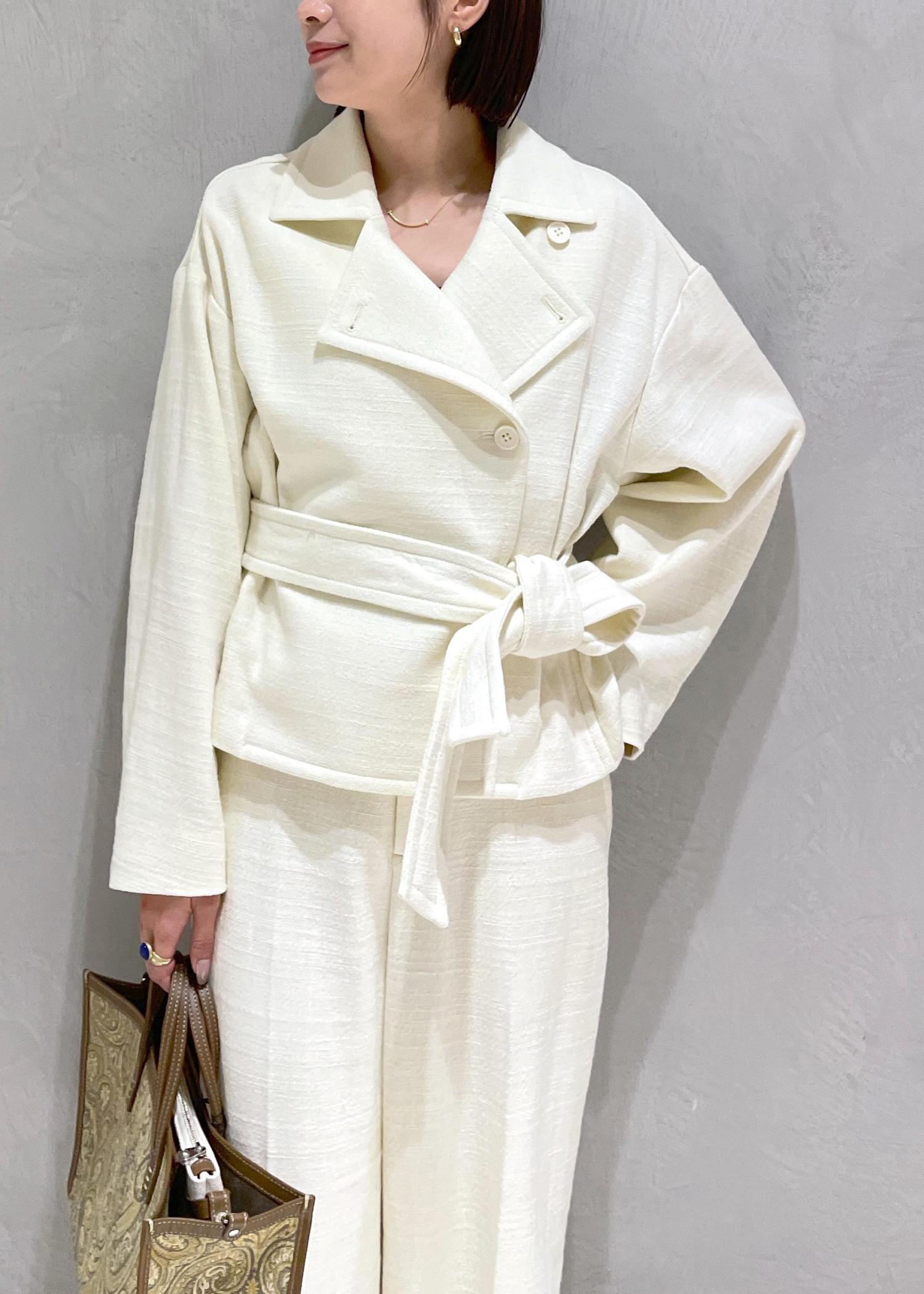 オールホワイトでもウエストマークがあり着丈コンパクトなショートトレンチ型なのでスッキリ見えが叶います♡