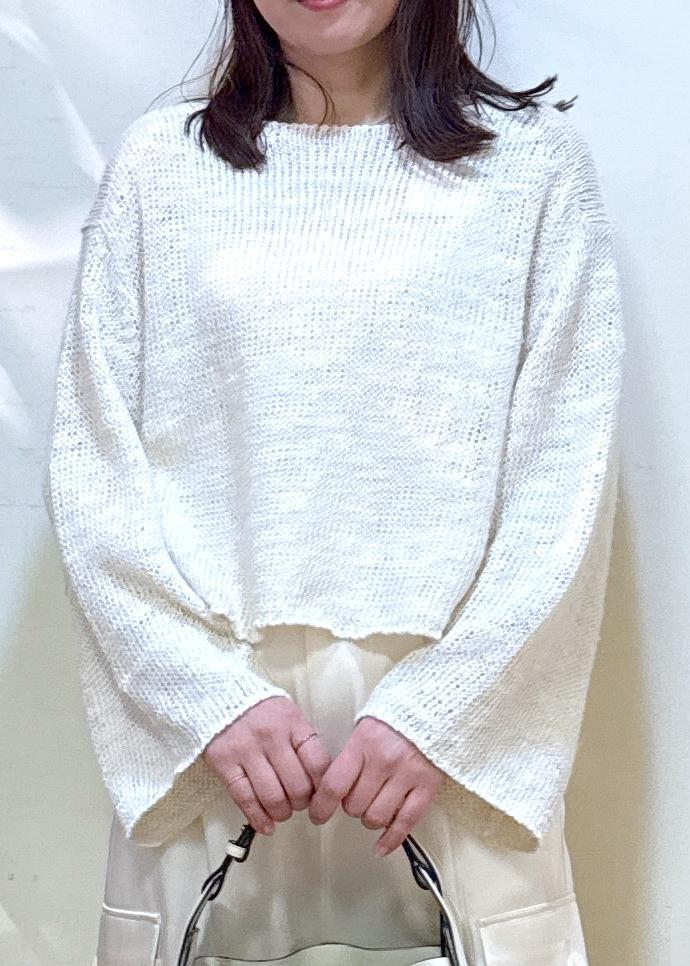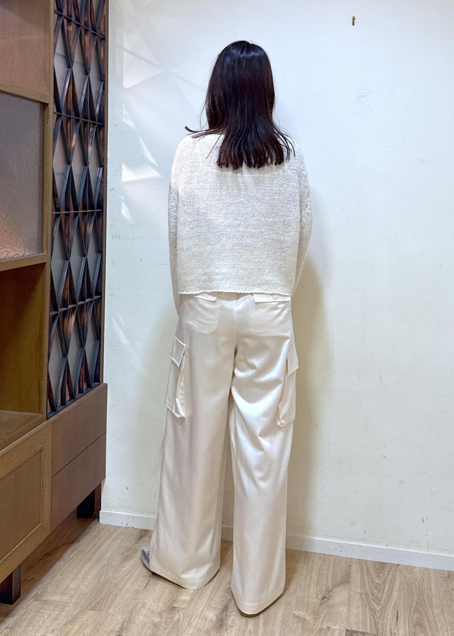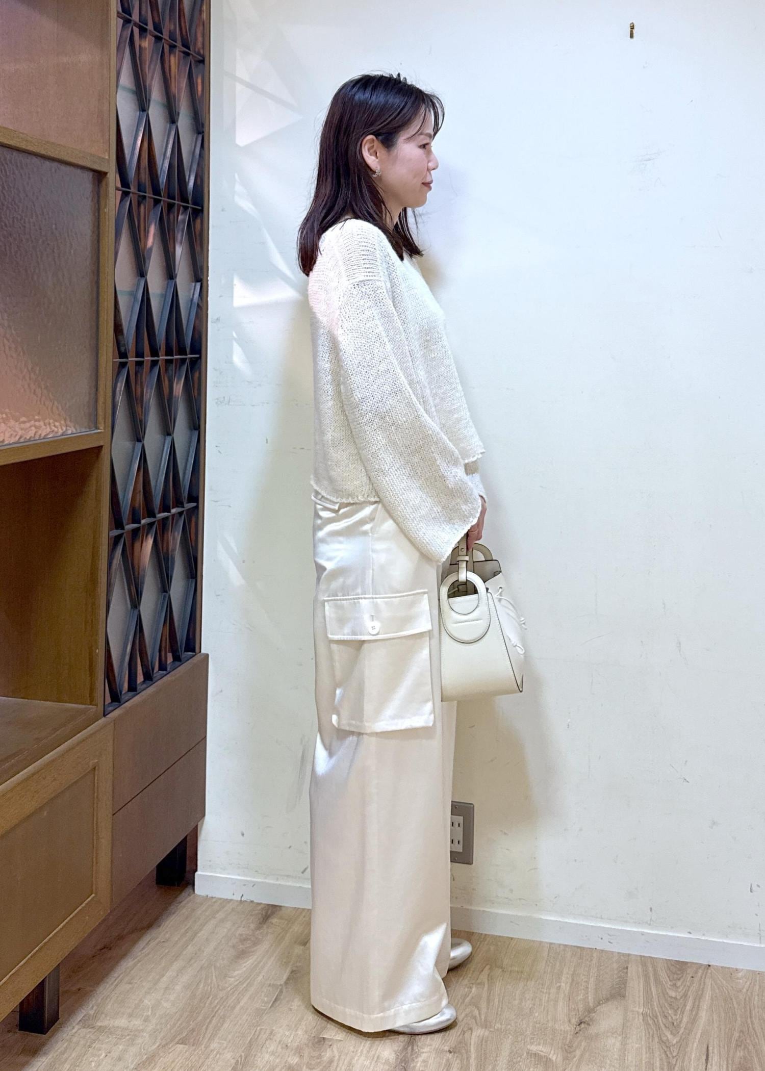 麻素材のゆったりしたニットとシャイニーサテンのパンツをコーディネート♪