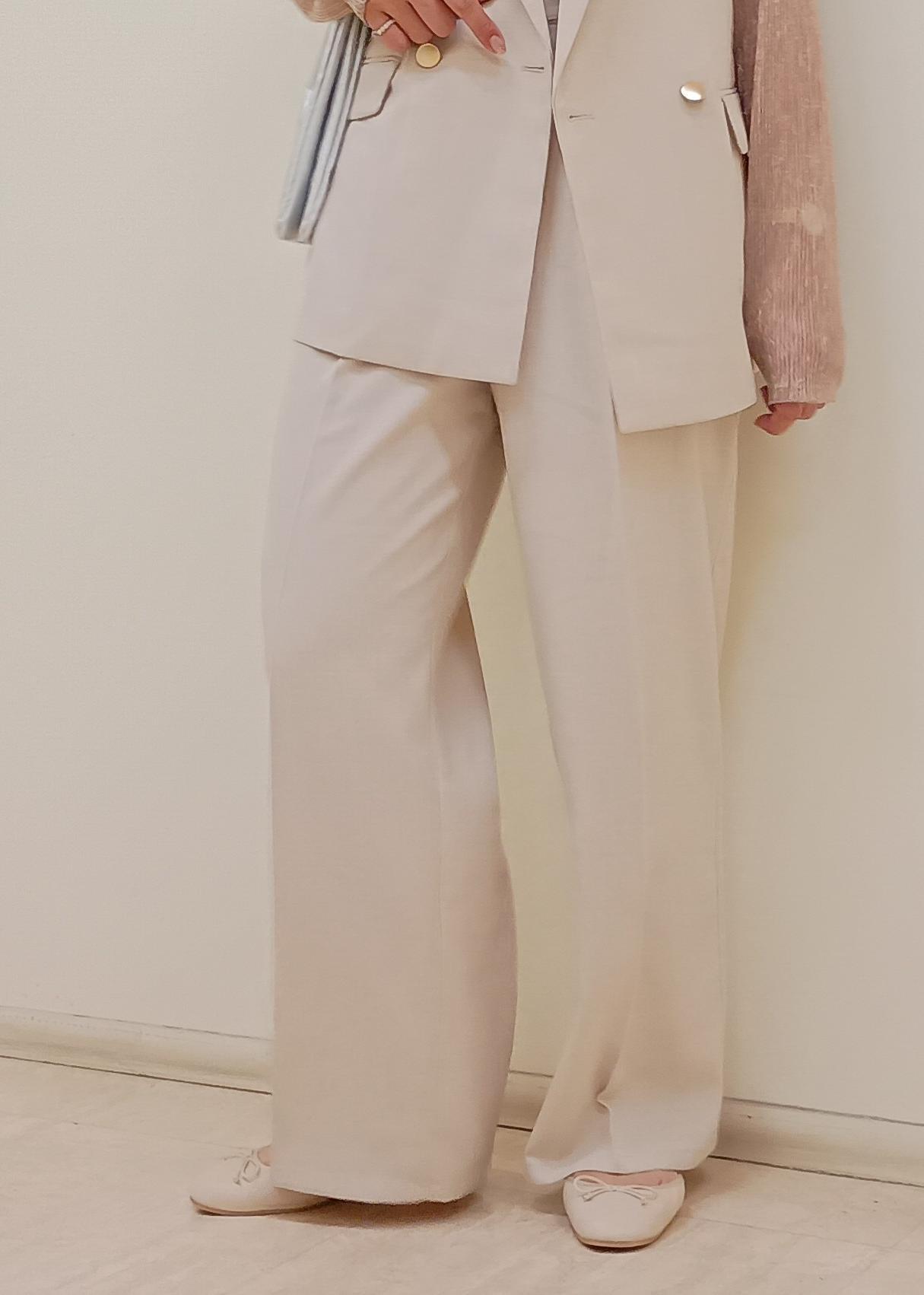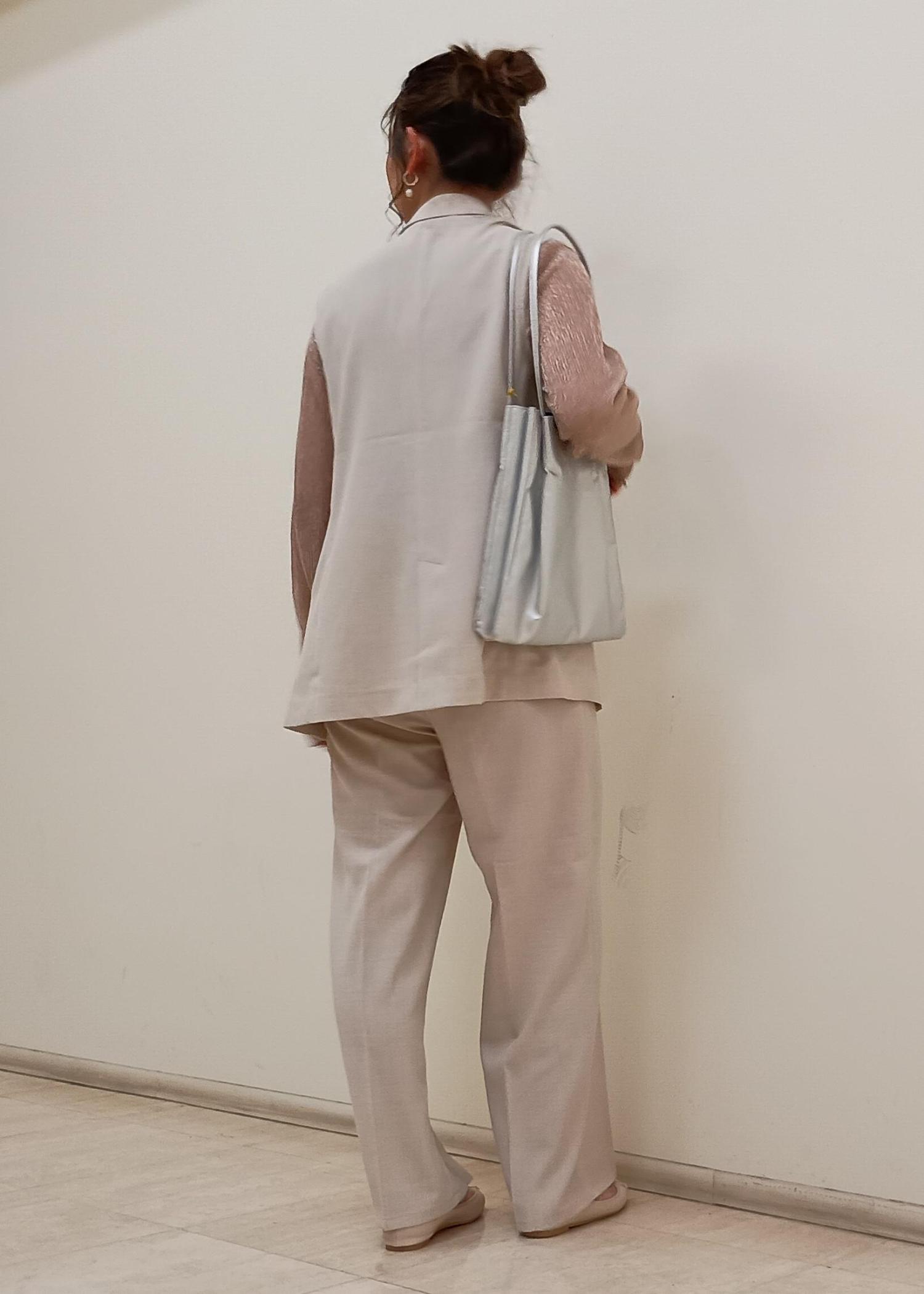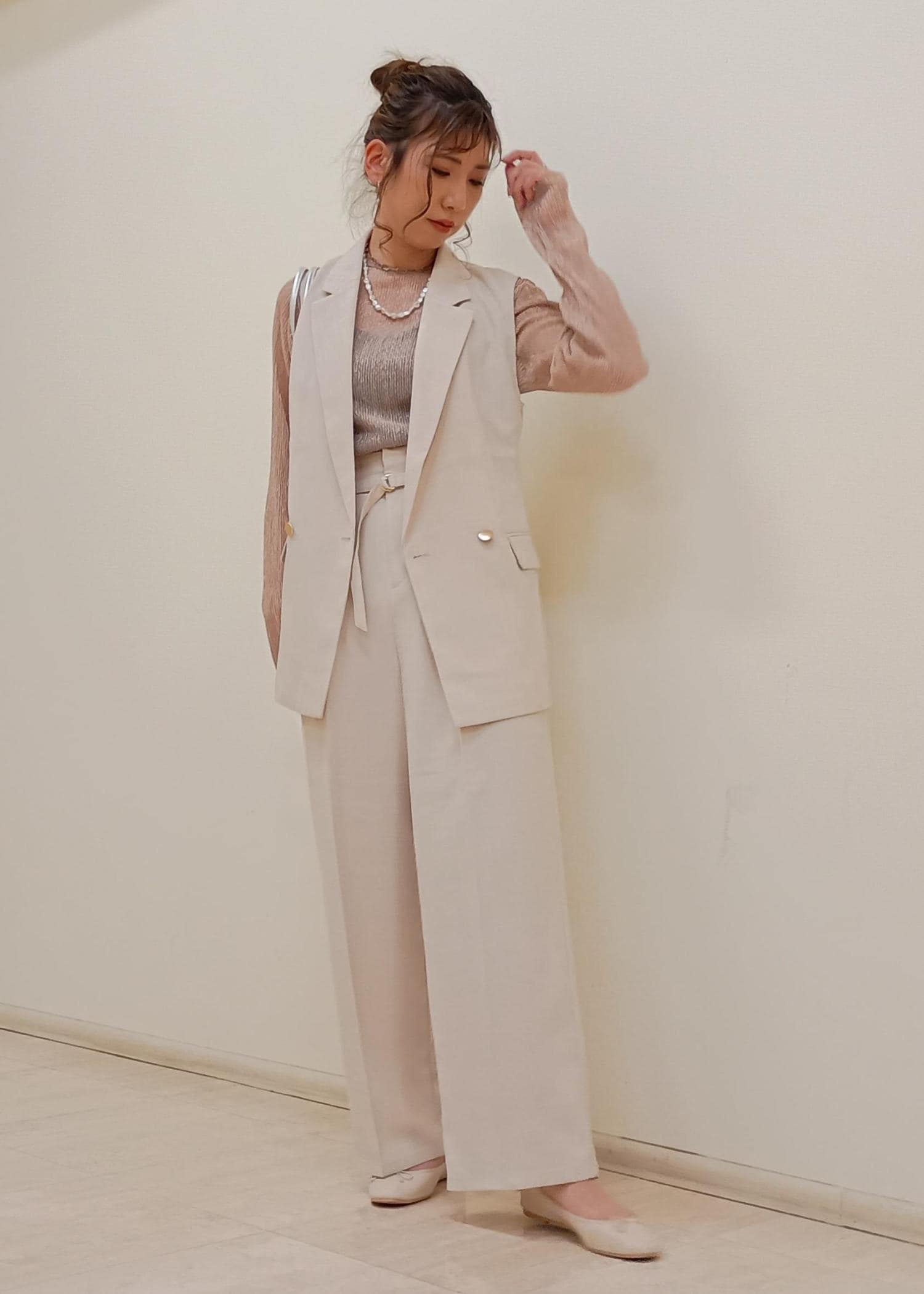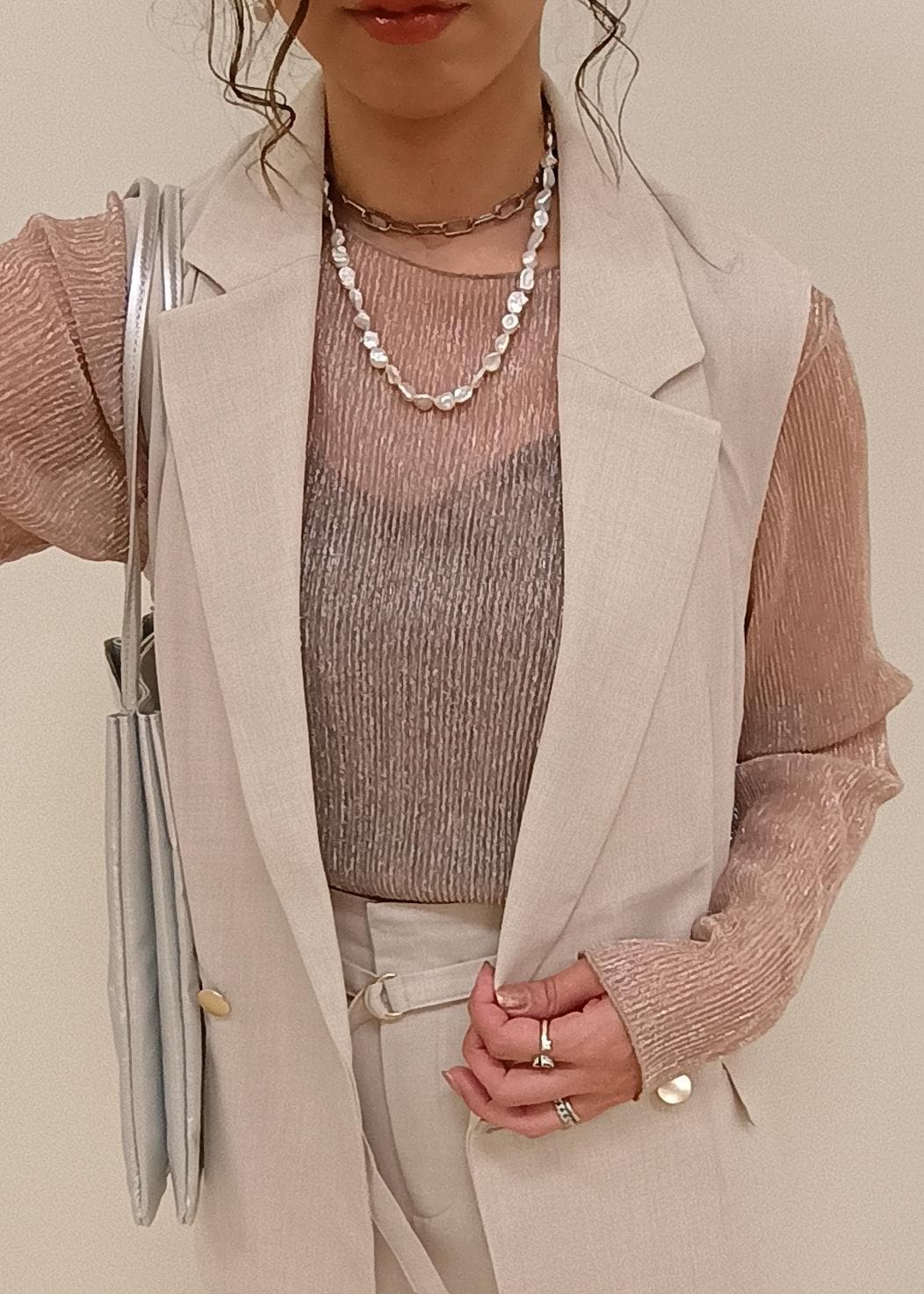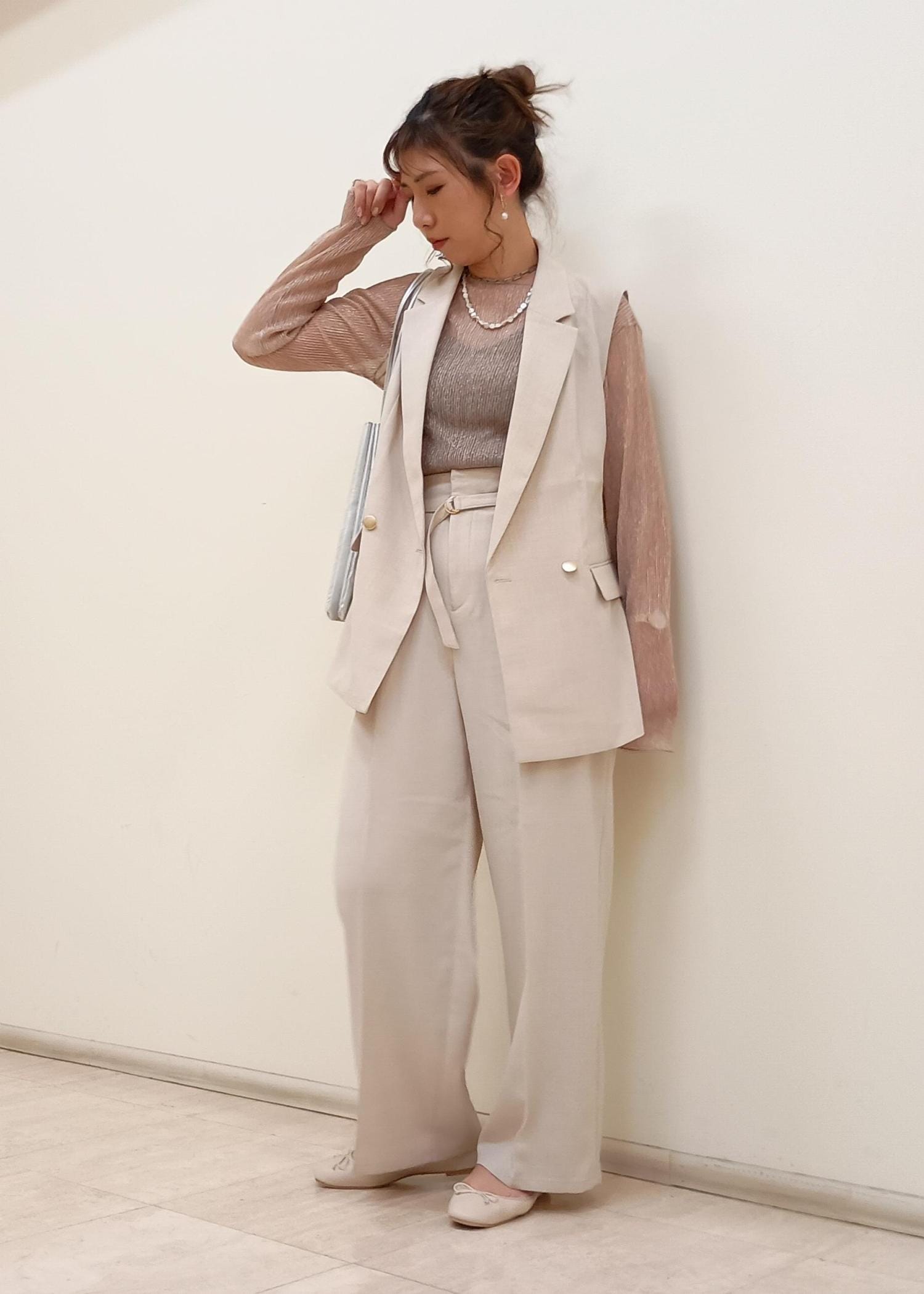 お仕事のシーンでも使えるキレイめセットアップに、シアー感のあるラメトップスを合わせてカジュアルダウンした着こなしに。キラキラとしたラメ素材がトレンド感をプラスしてくれます。強すぎないシアー感はアラフォー世代でも挑戦しやすく、簡単にこなれ感が出せるのでオススメです!
