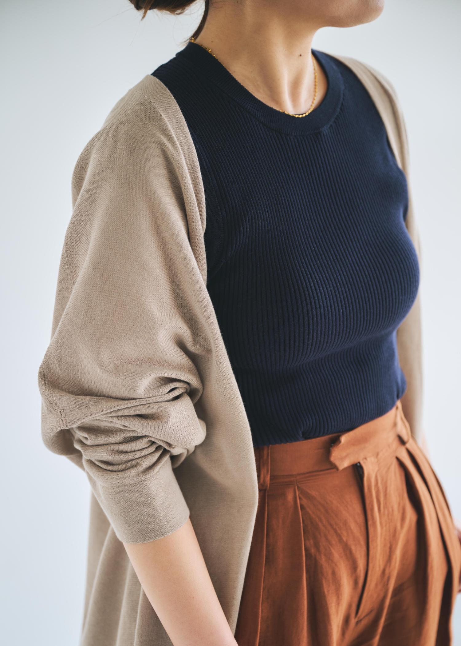 柔らかないリブなので窮屈感なので、夏に一枚でもインナーにも活躍するアイテムです!