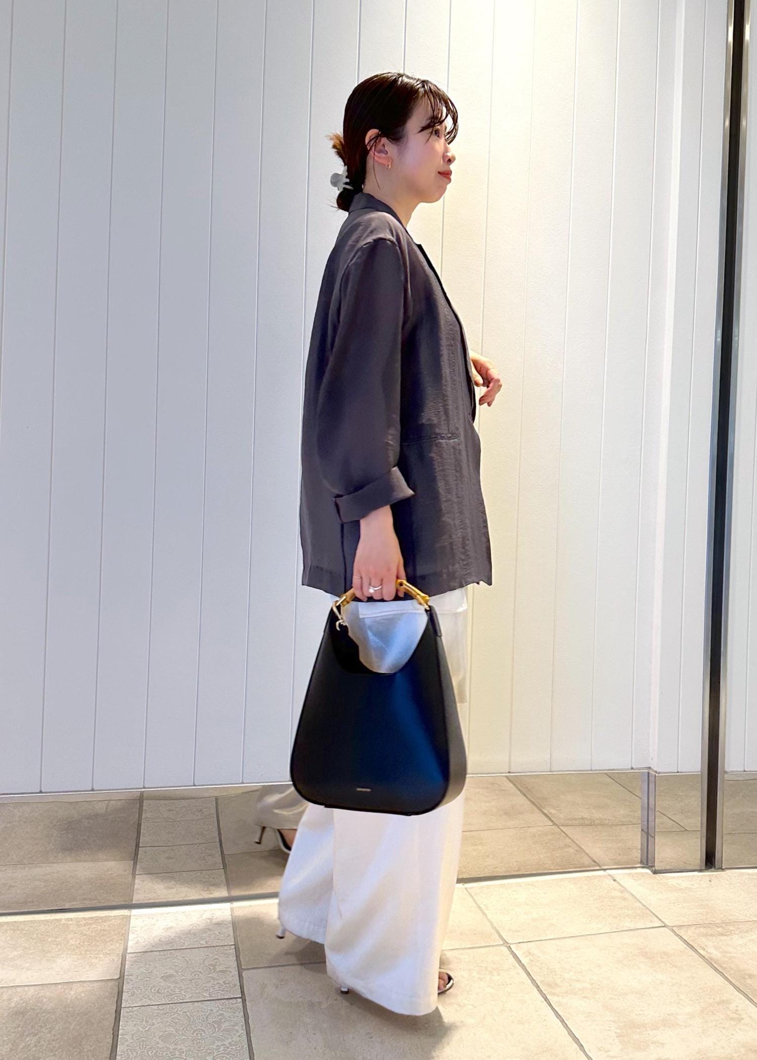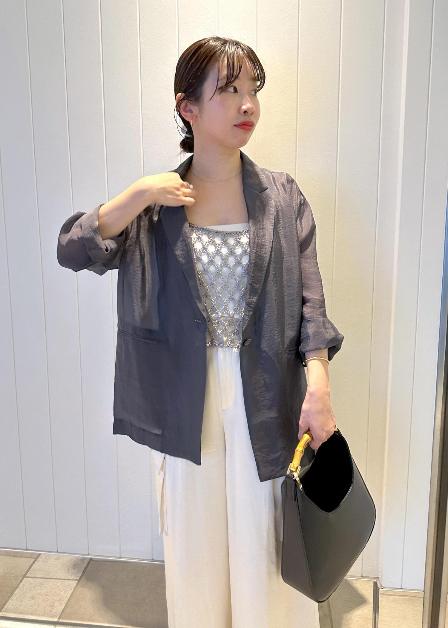 ROPÉ【洗える・新色追加】シアーライトジャケットグレー / 36¥29,700レビュー身幅はややゆとりがあり、ほんのり抜け感はありますが、ルーズ過ぎず品よく見えるサイズ感です。