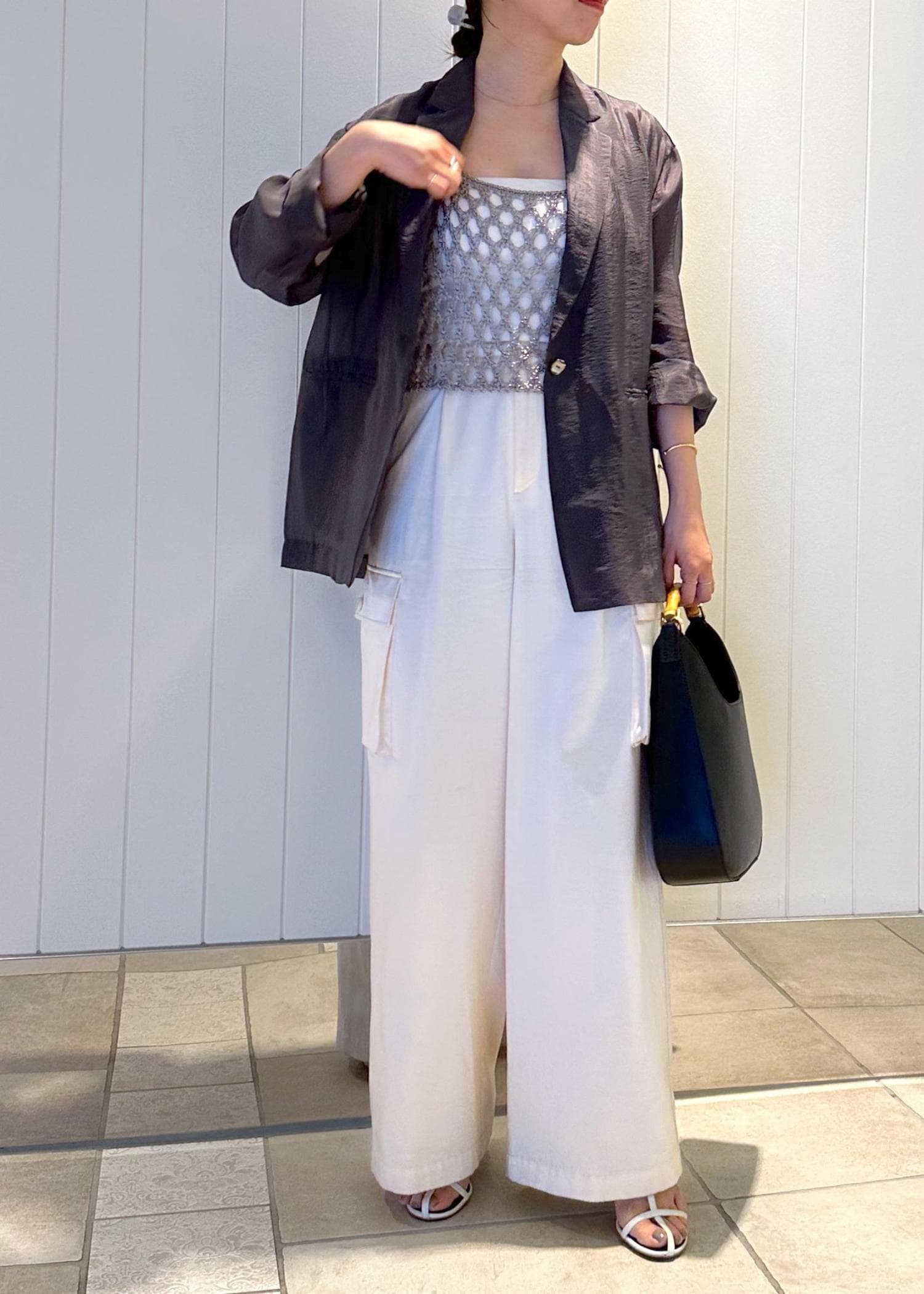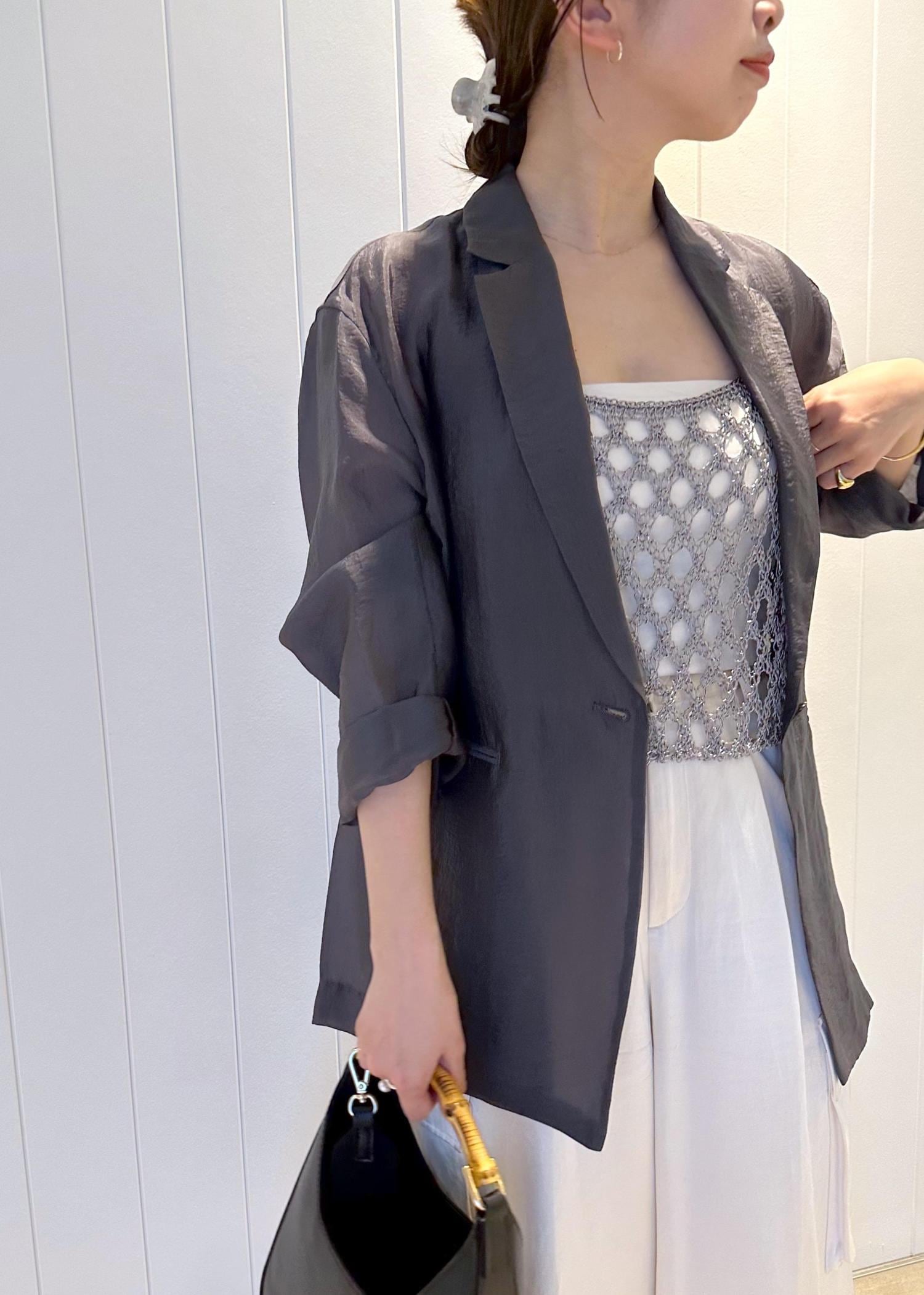 シアージャケットにラメコードキャミソールを合わせて