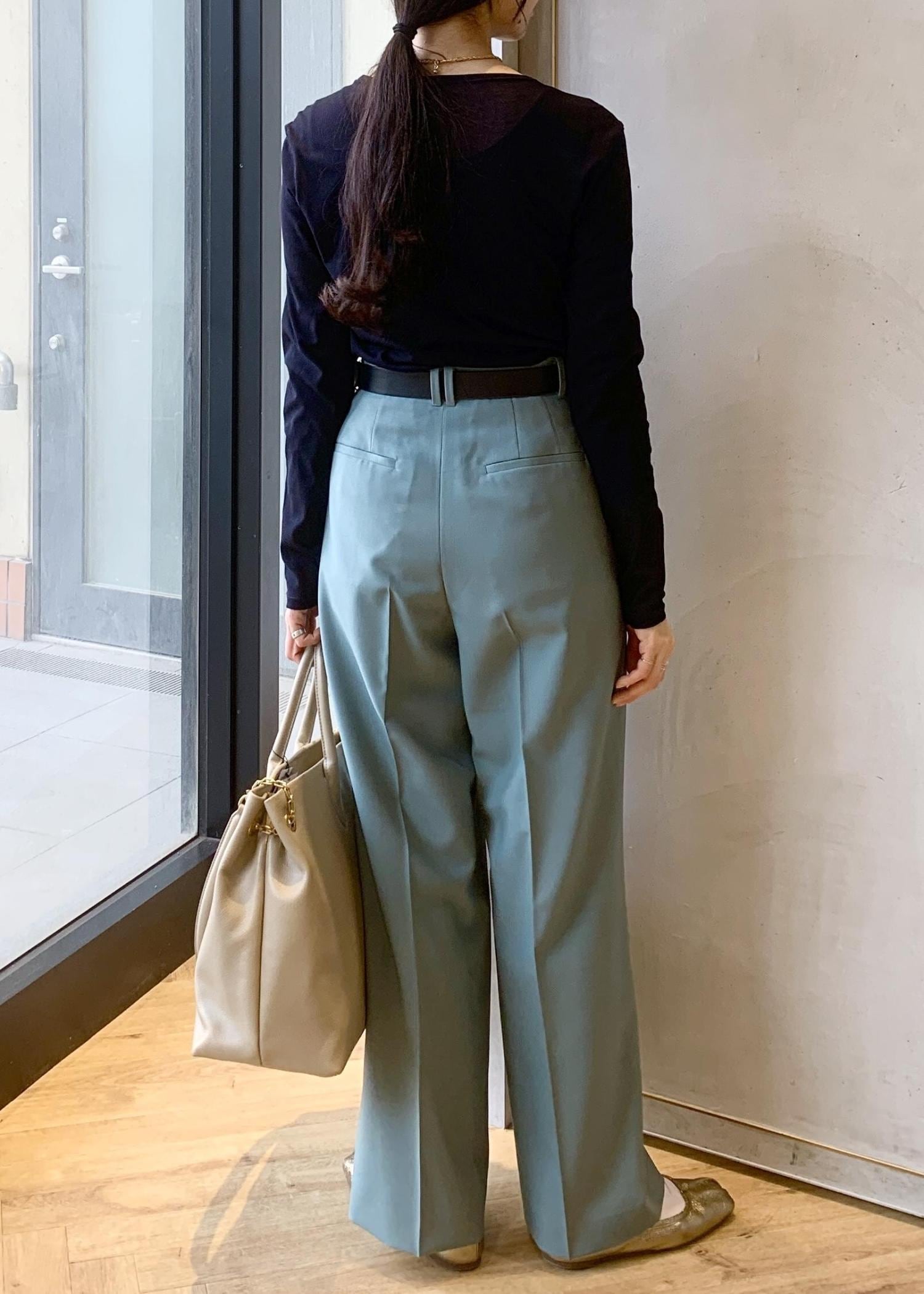 フロントにタックが入っていますが、ボリューム感が出過ぎず落ち感のあるパンツなのですっきりしたシルエットでお召しいただけます。