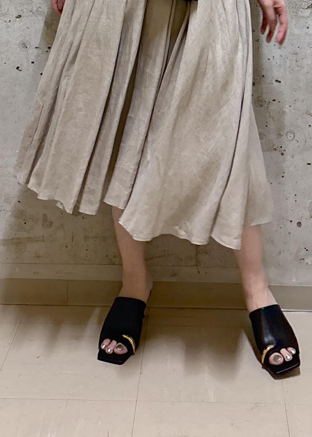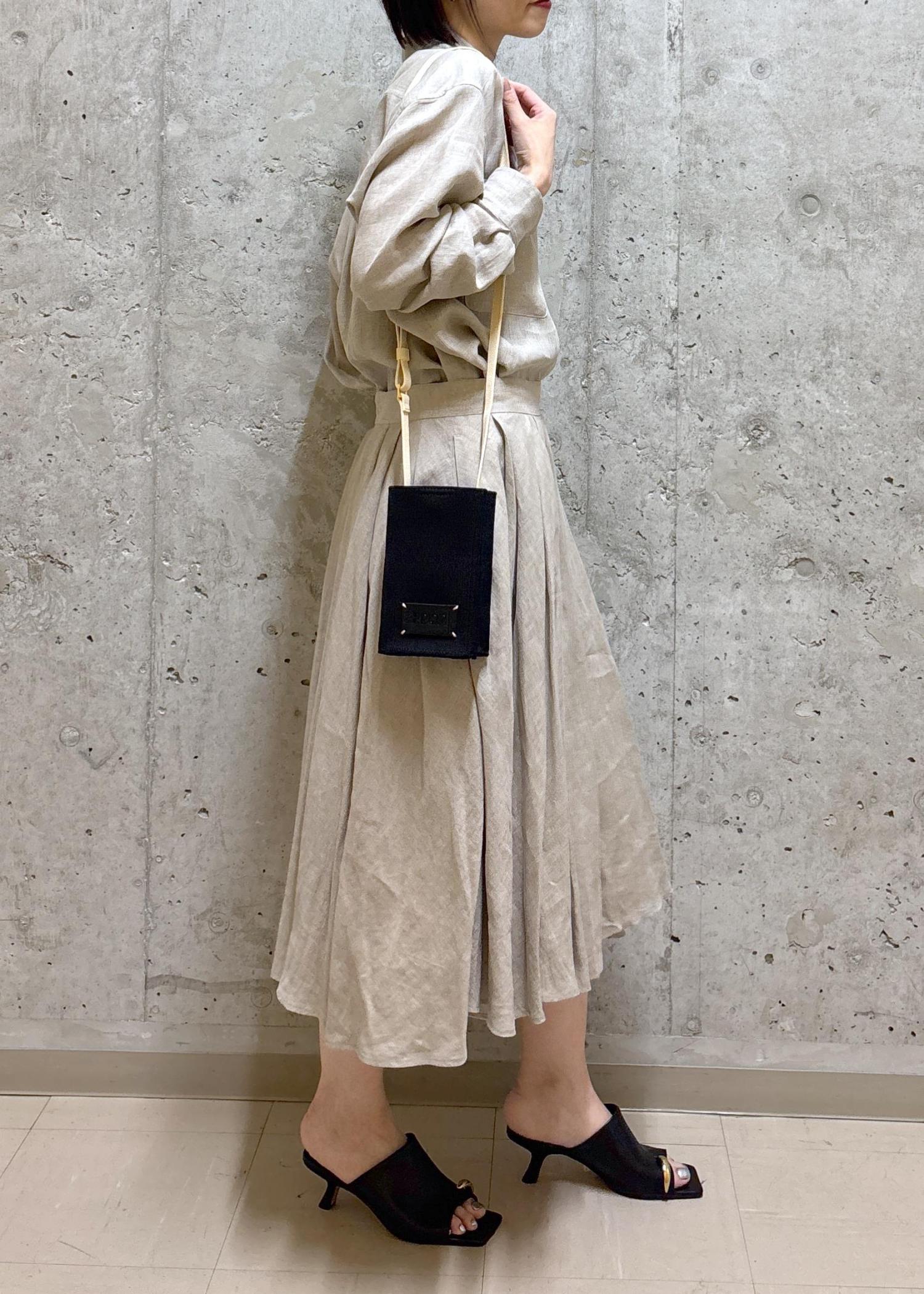 着丈はふくらはぎにかかるくらいで、個人的にはフラットシューズよりはヒールで合わせたい長さです。
