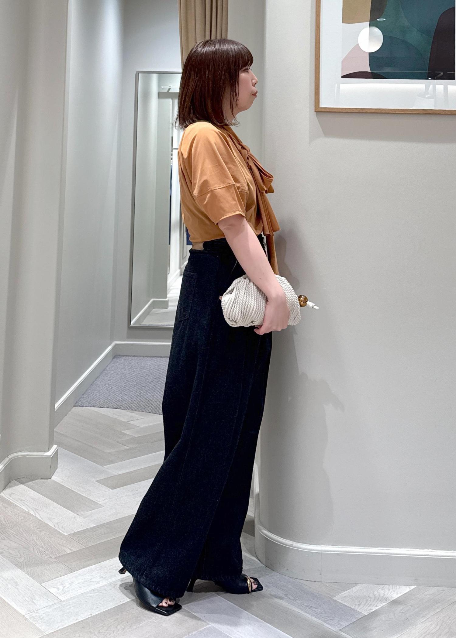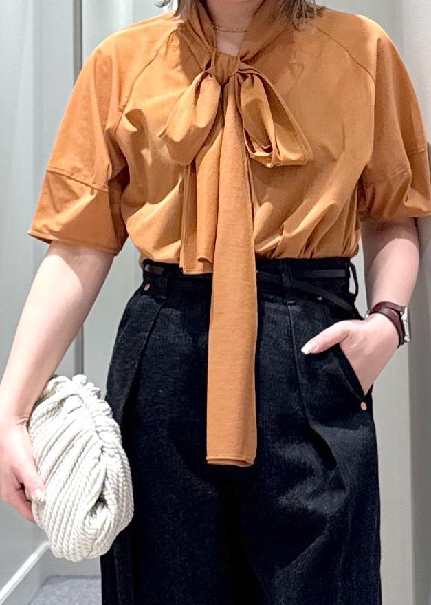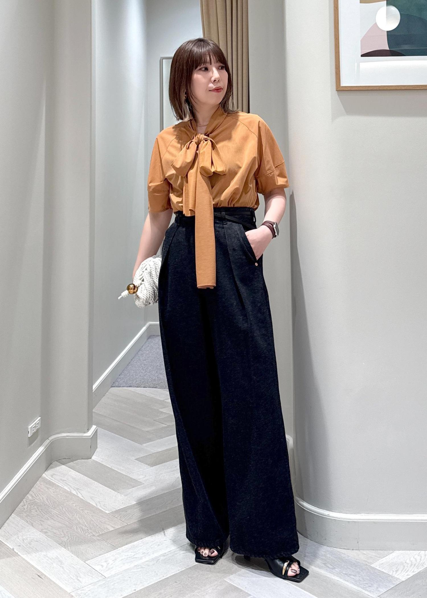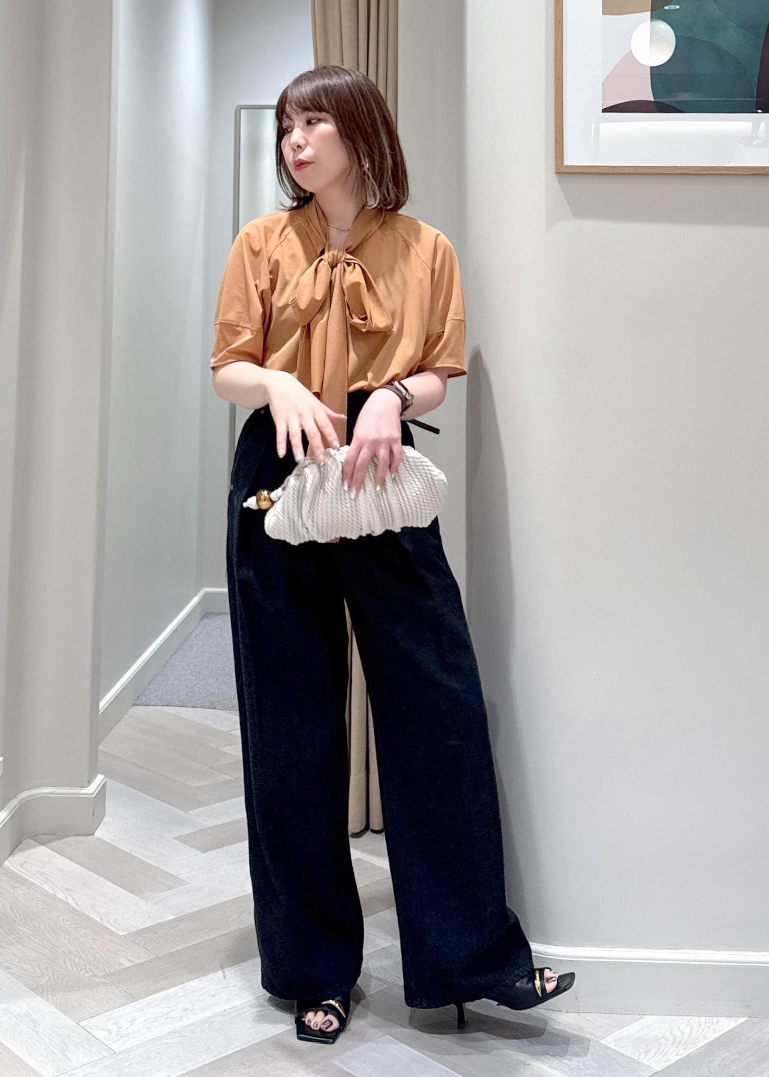 フェミニンな印象のボウタイブラウスをデニムで合わせました♪