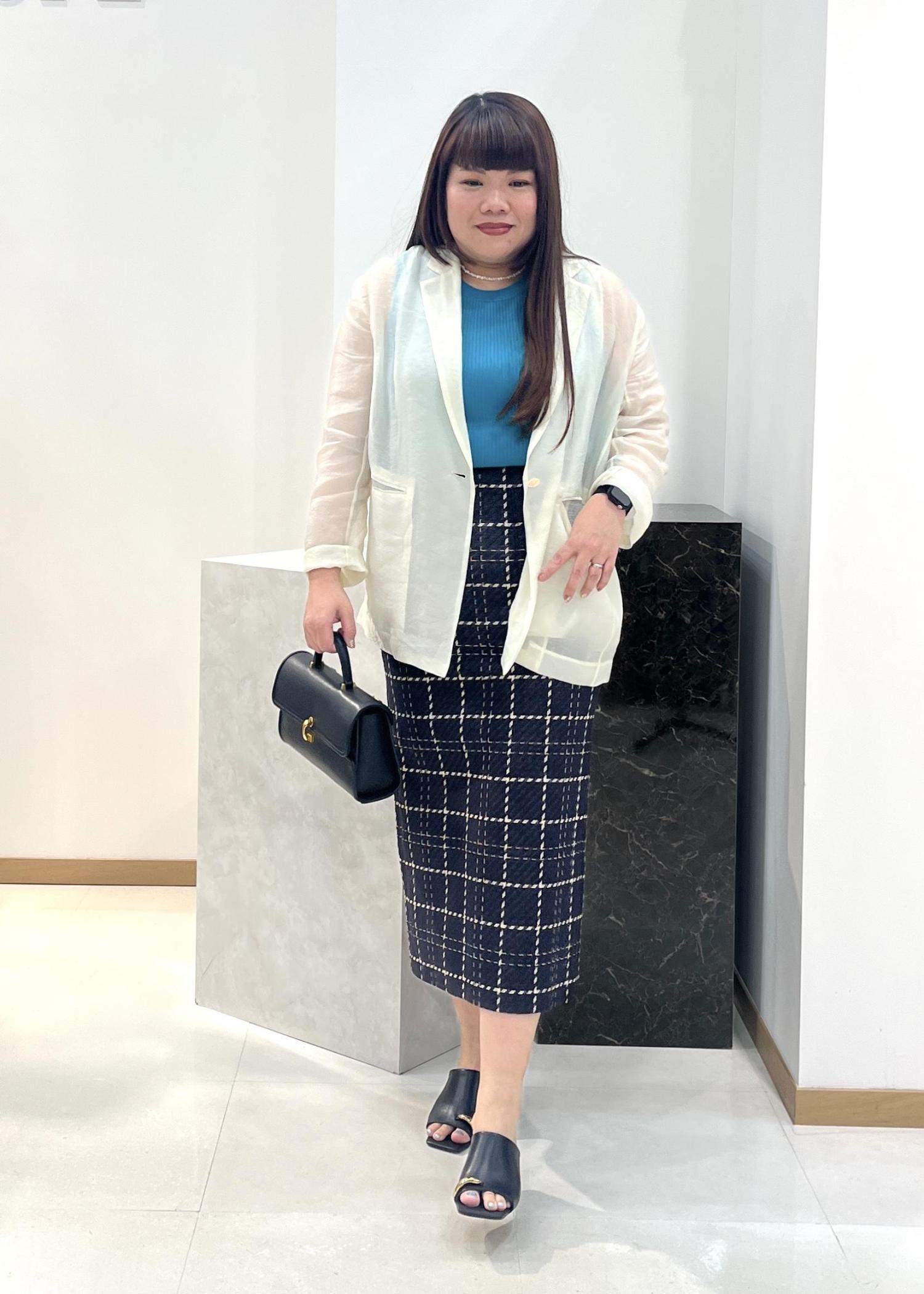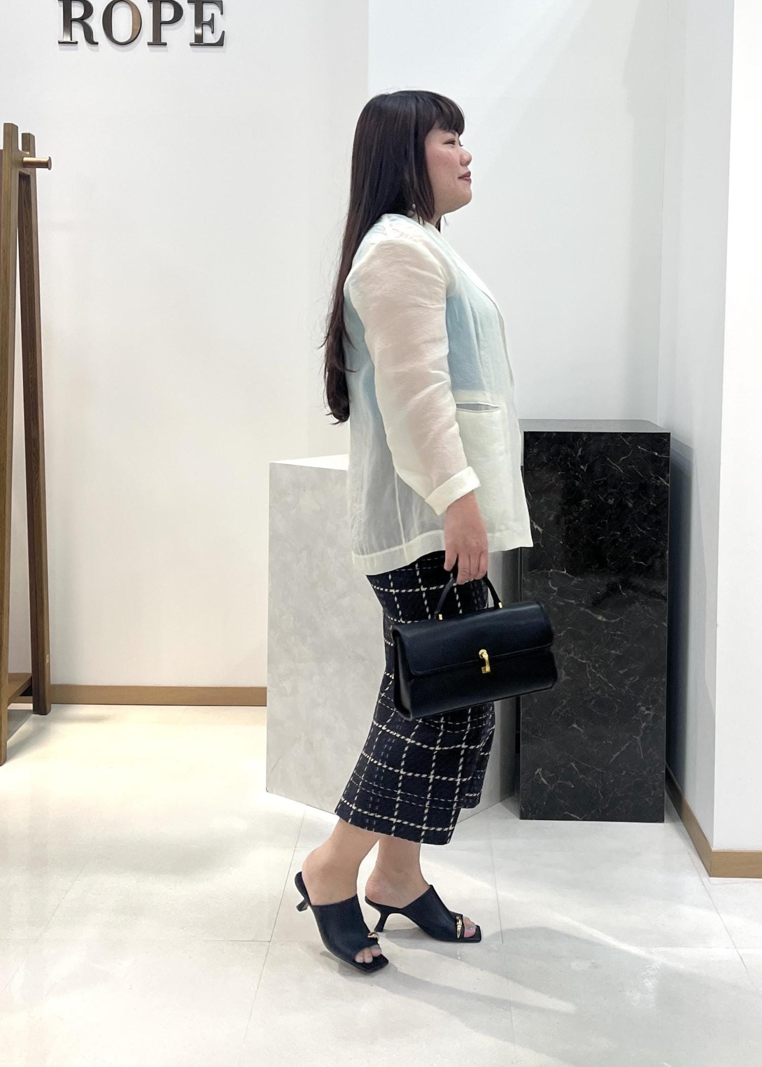 スカートはツイード調で、ストレッチが効いたROPÉ定番の形です。