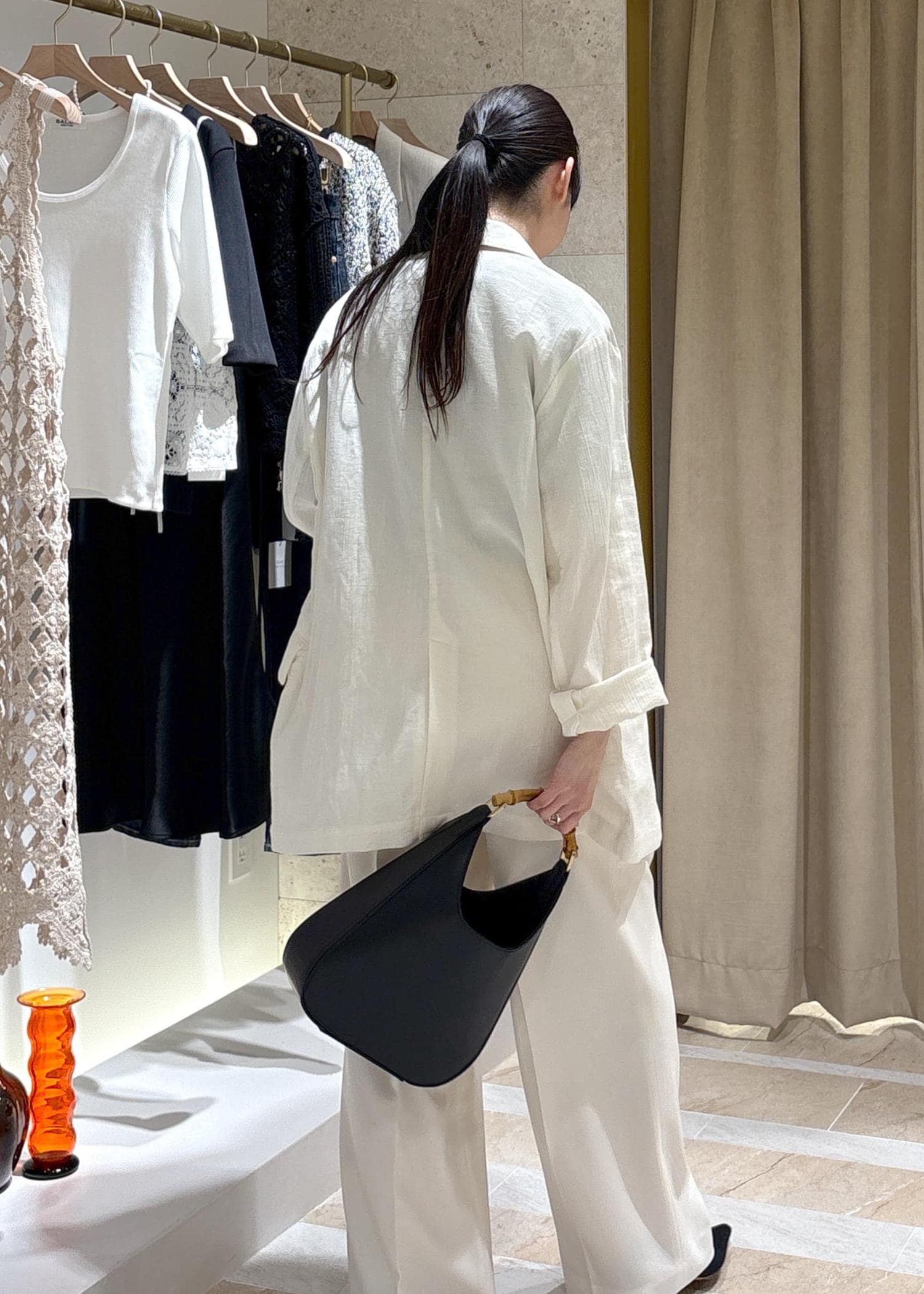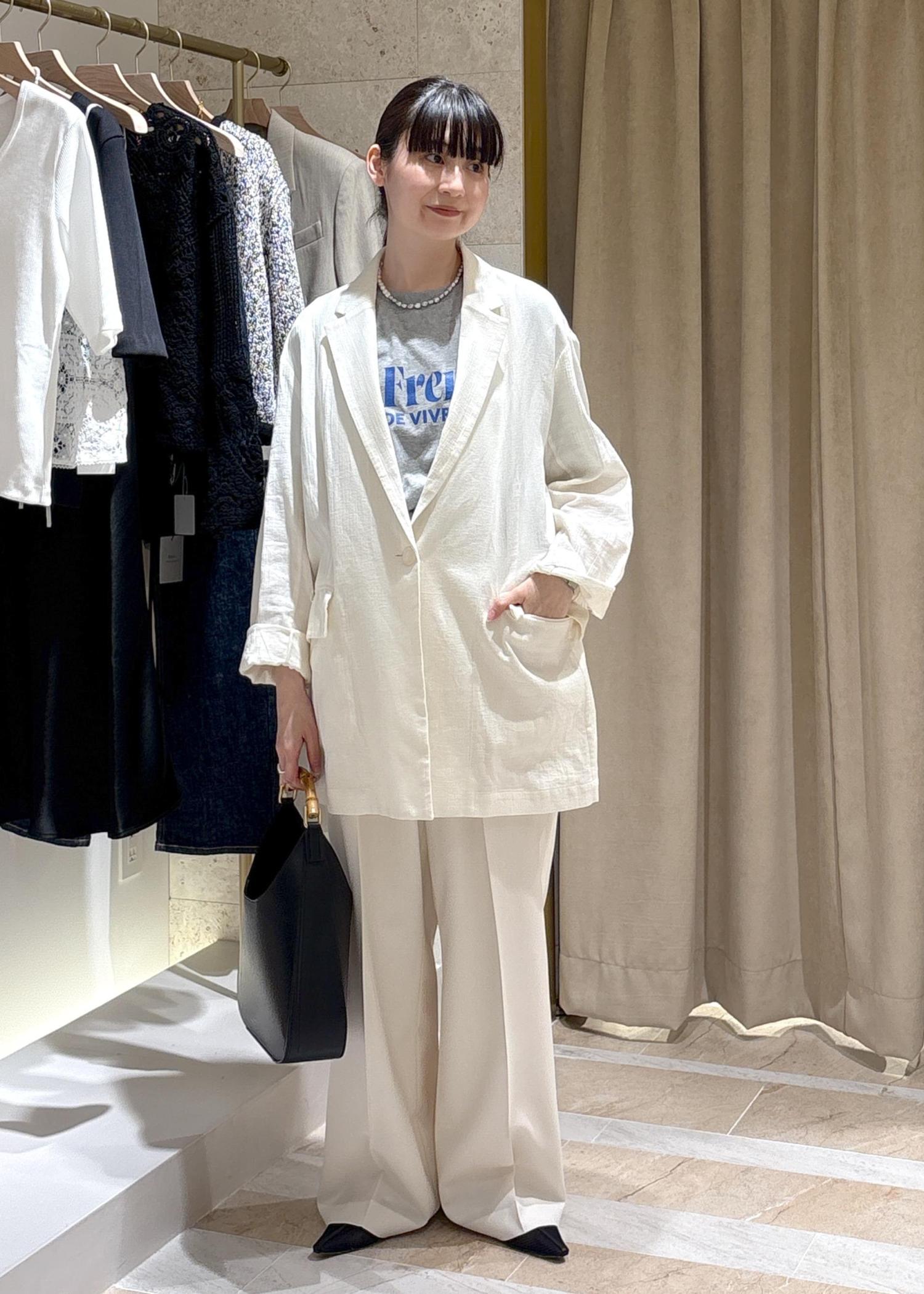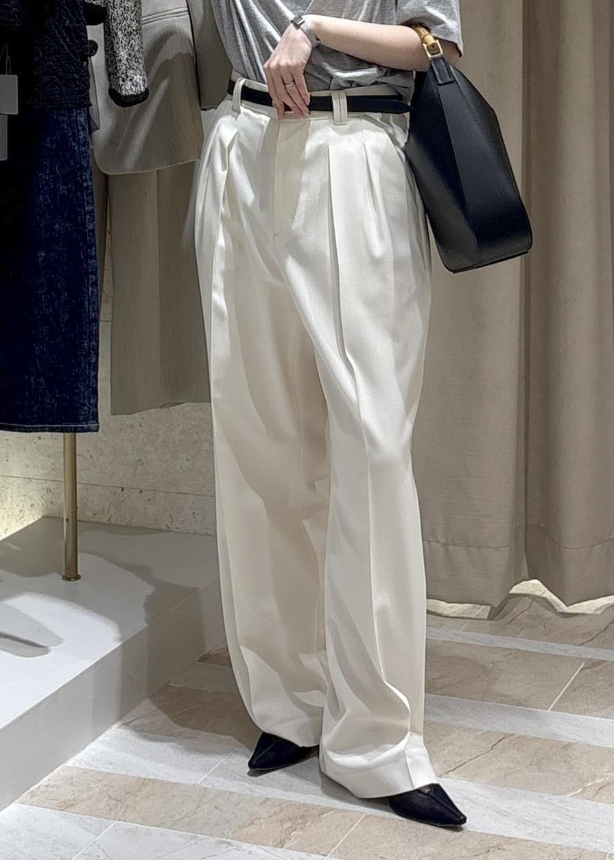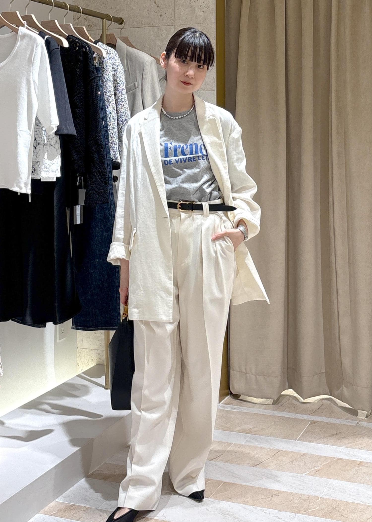 今回は綺麗めパンツと合わせて、レザーのベルトで全体の印象を引き締めて、パールネックレスでエレガントさを出してみました。