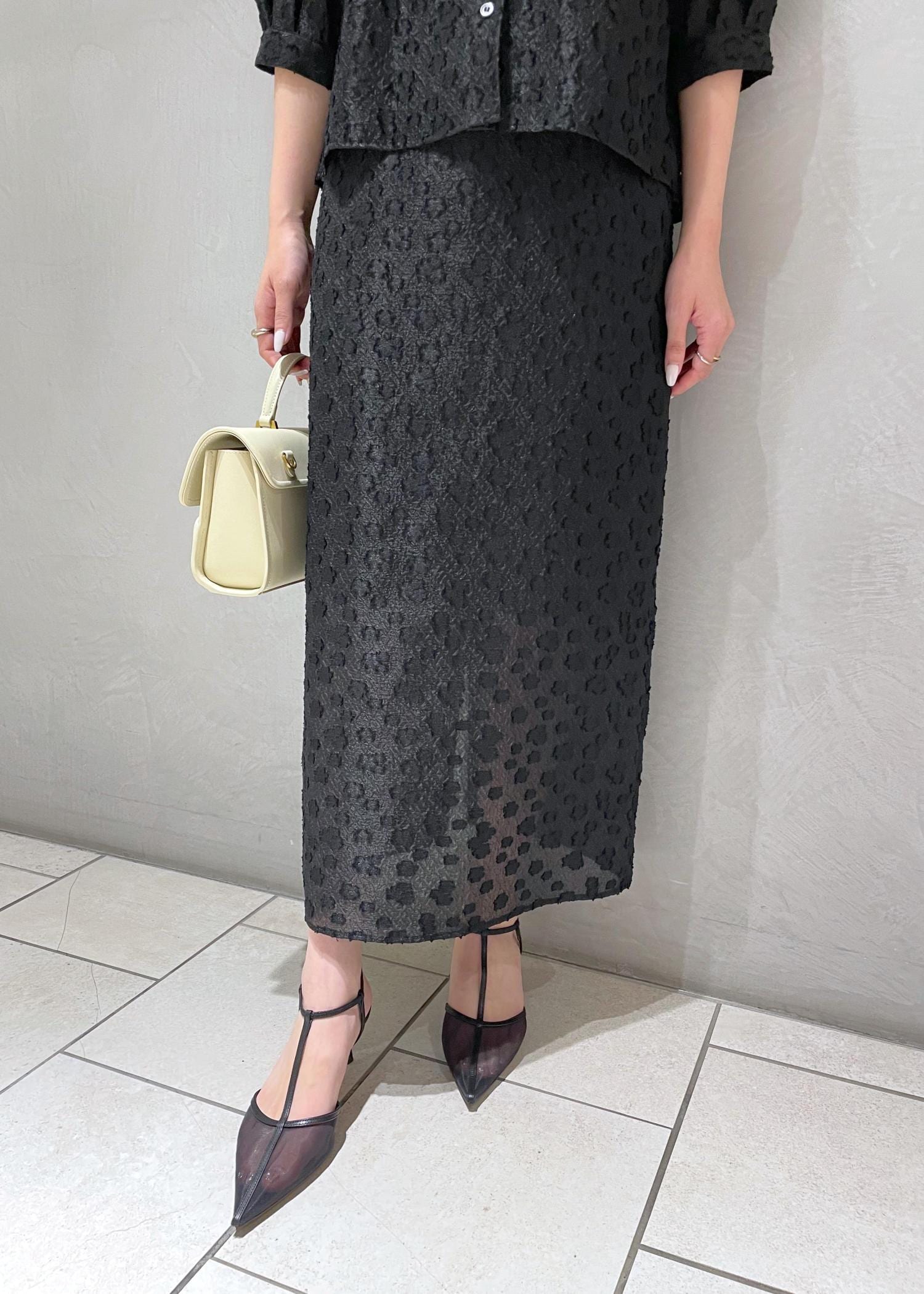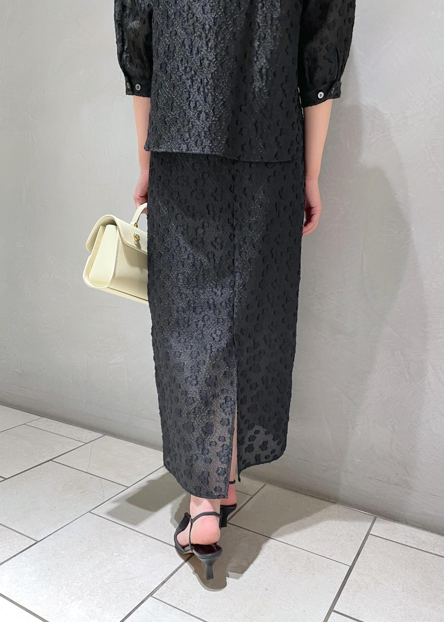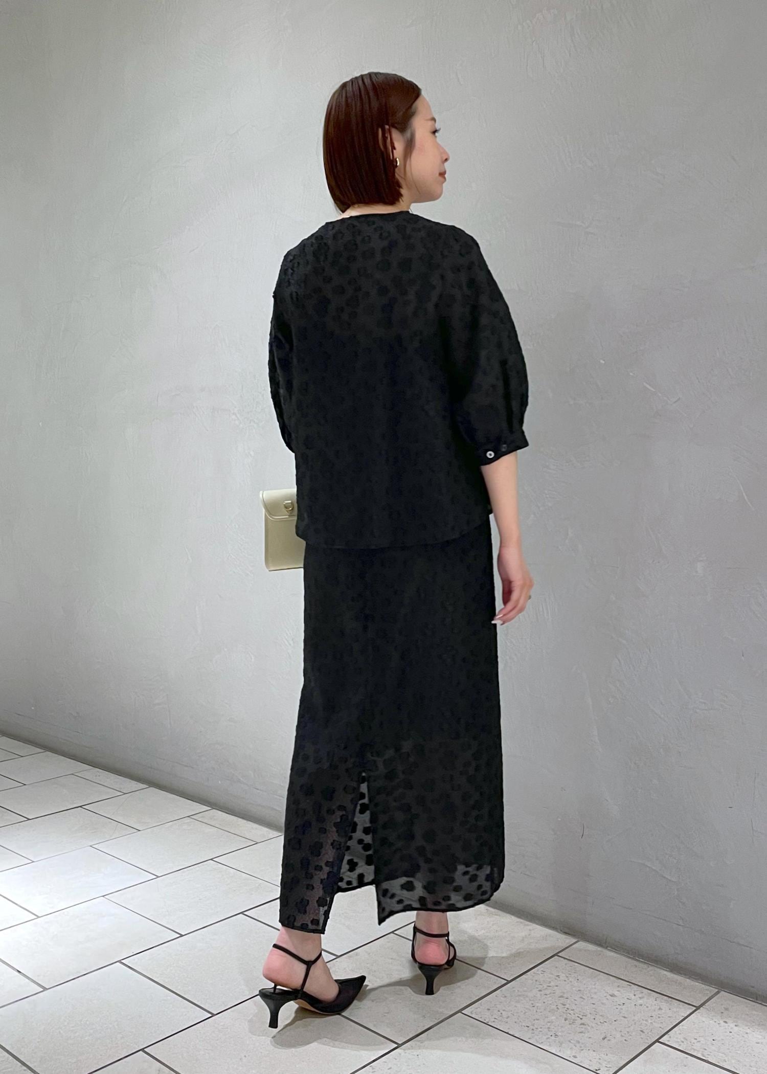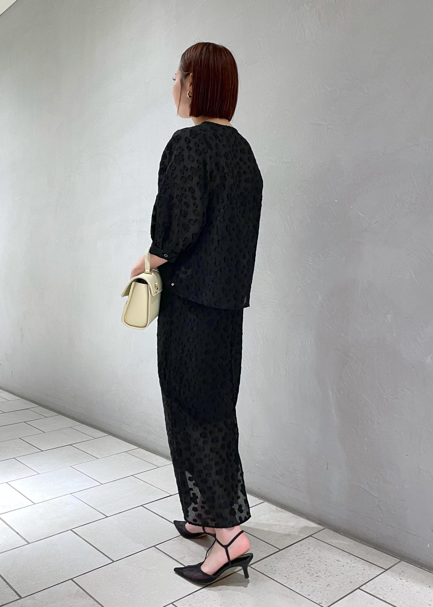 アウトレットROPÉ【洗える】【WEB・一部店舗限定】フラワージャガードスカート/セットアップ対応ブラック / 38¥12,650レビュー161cmで38サイズを着用。着丈は少し長めでくるぶしが見えるほどですがシアー感があるため軽やかさがあります。