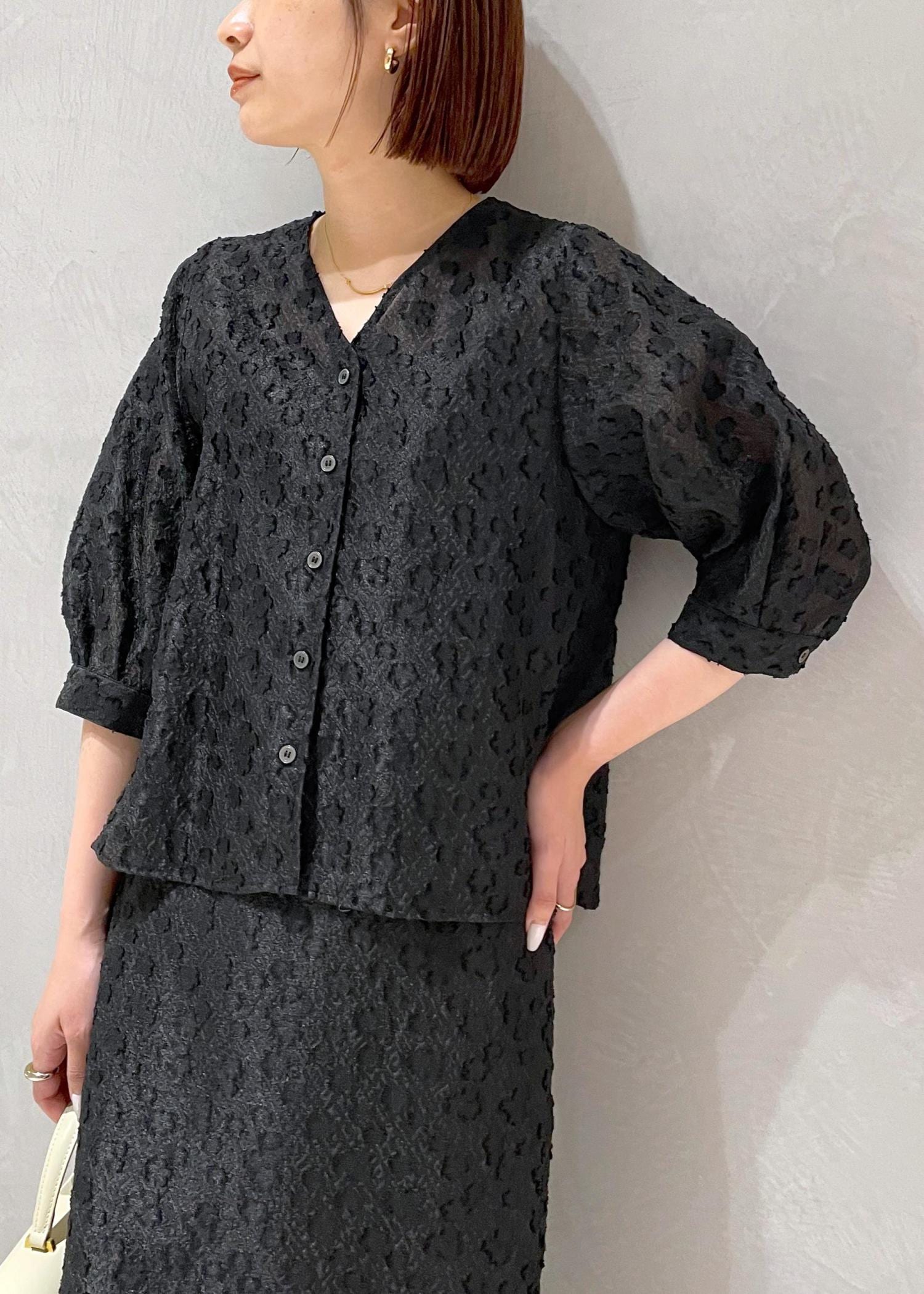 アウトレットROPÉ【WEB・一部店舗限定】フラワージャガードブラウス【セットアップ対応】/洗えるブラック / F¥17,710レビュー衿ぐりはスッキリとしたVネックで、袖はふんわり袖下パフスリーブ。スッキリさと女性らしさ両方を叶えてくれるブラウスです。安心の同色サテンキャミソール(アジャストあり)付き。