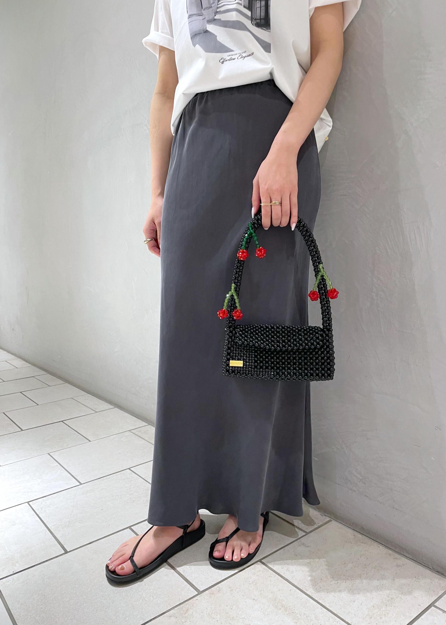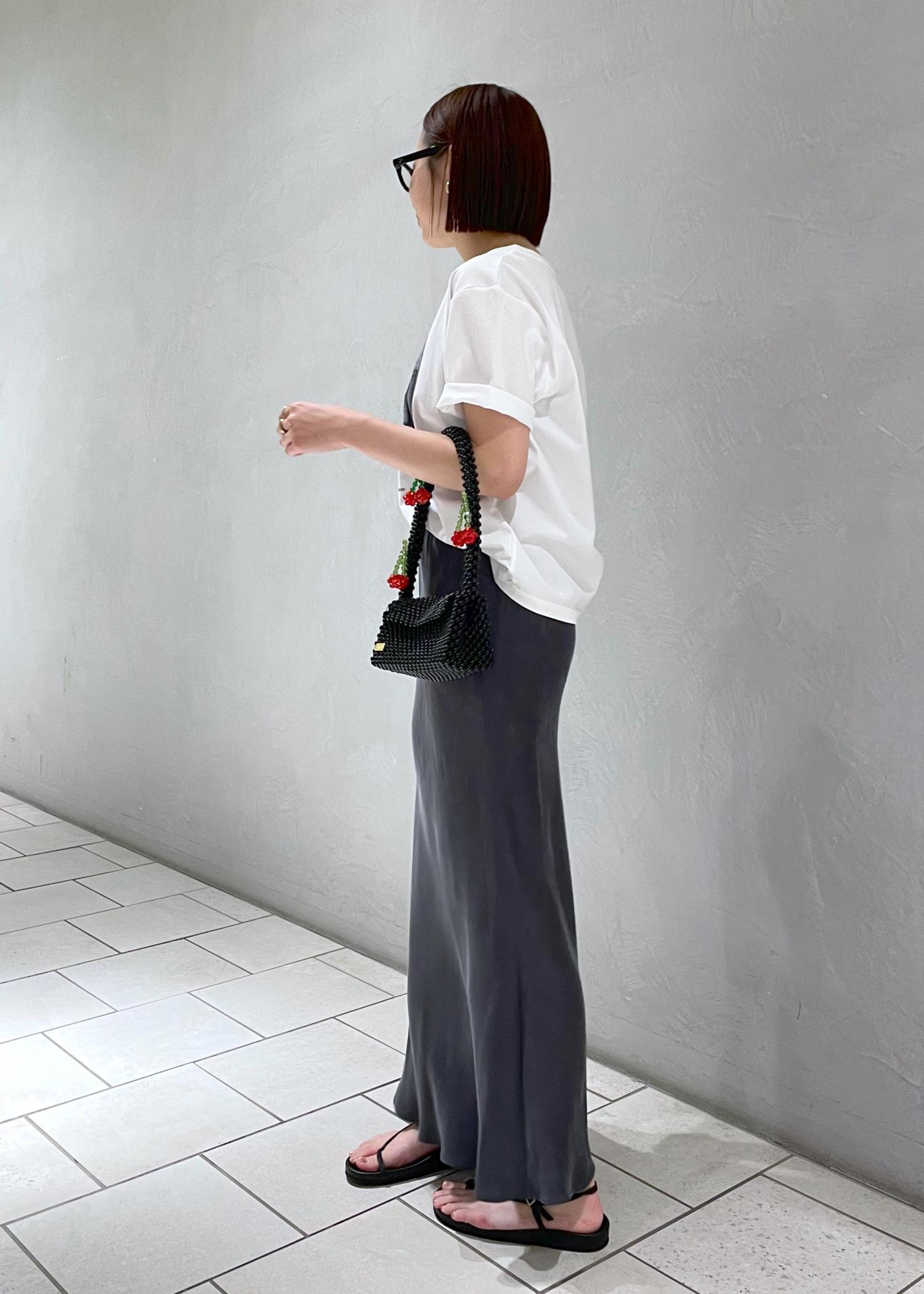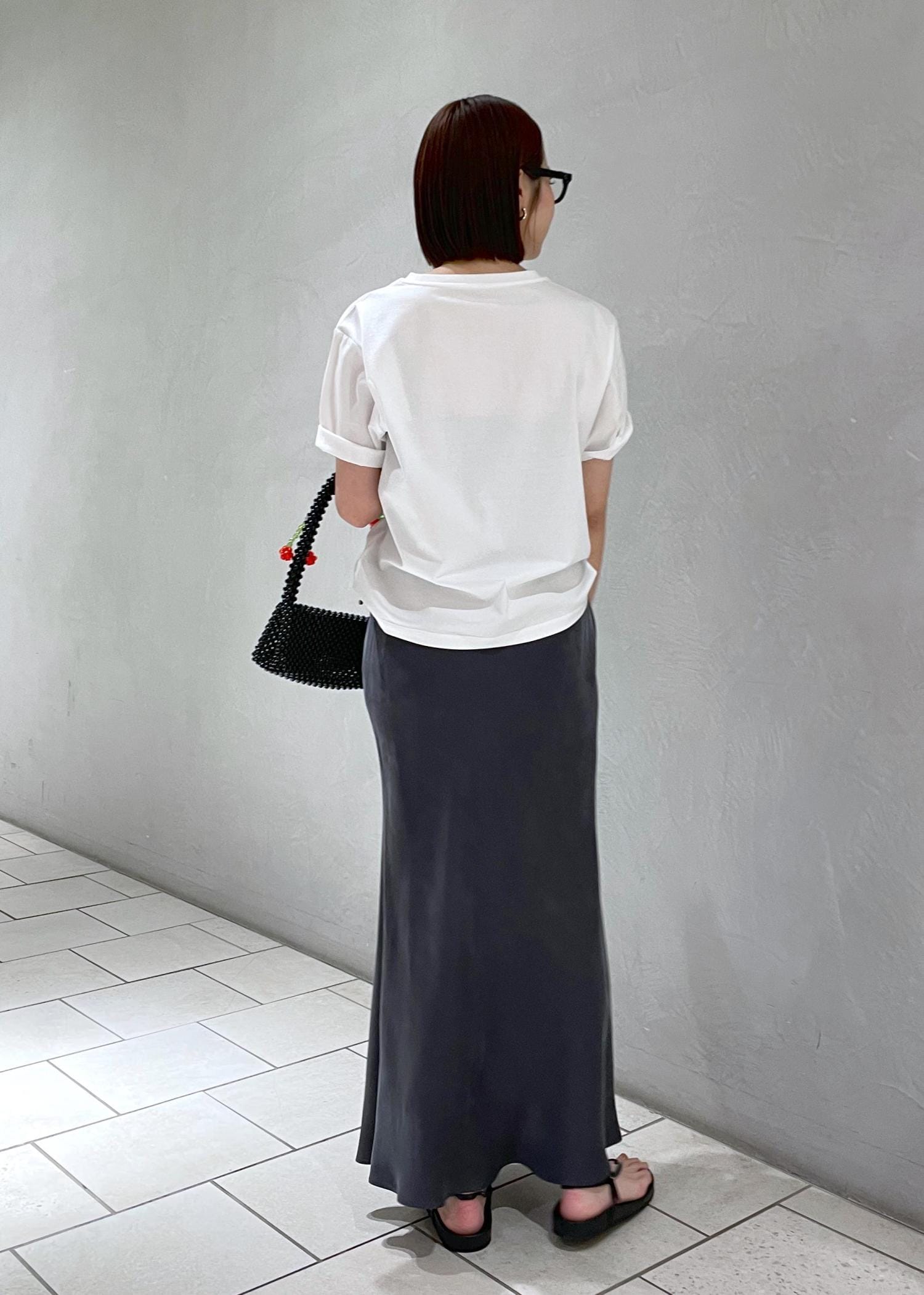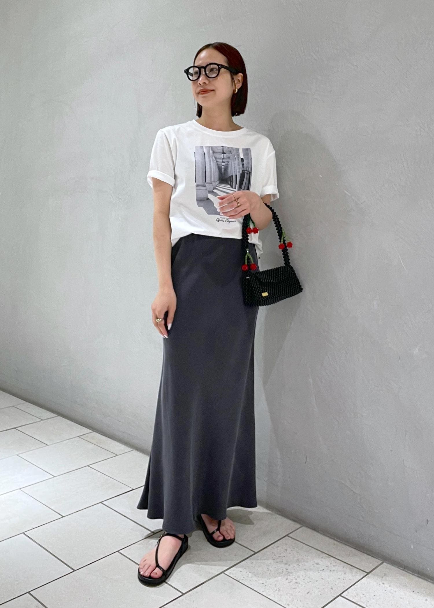 Tシャツにマーメイドスカートを合わせたフェミニンカジュアルスタイル