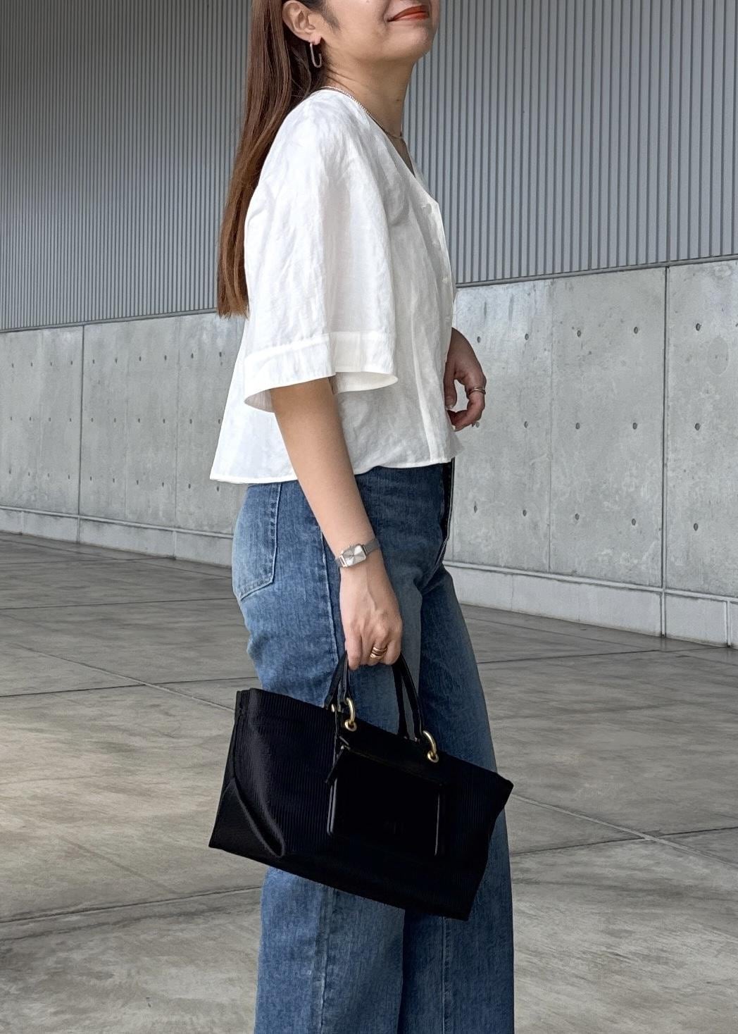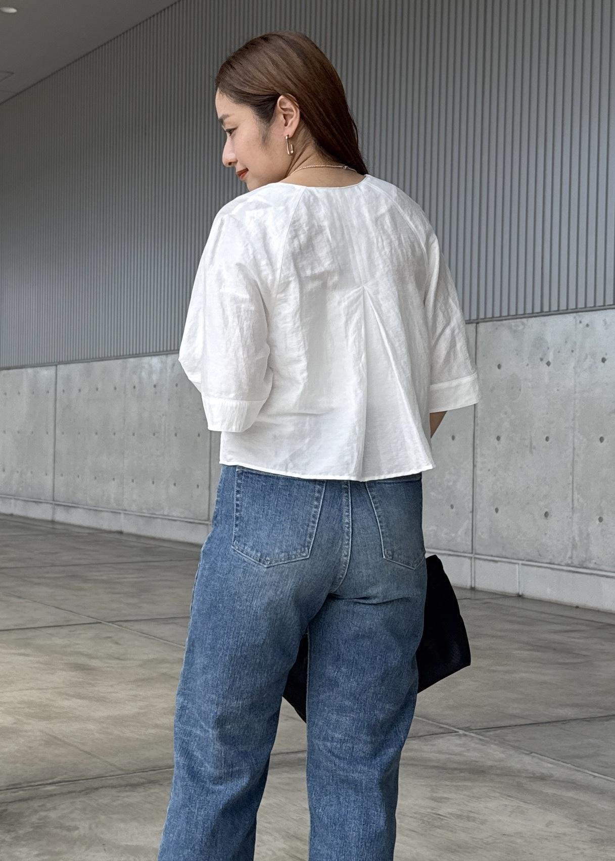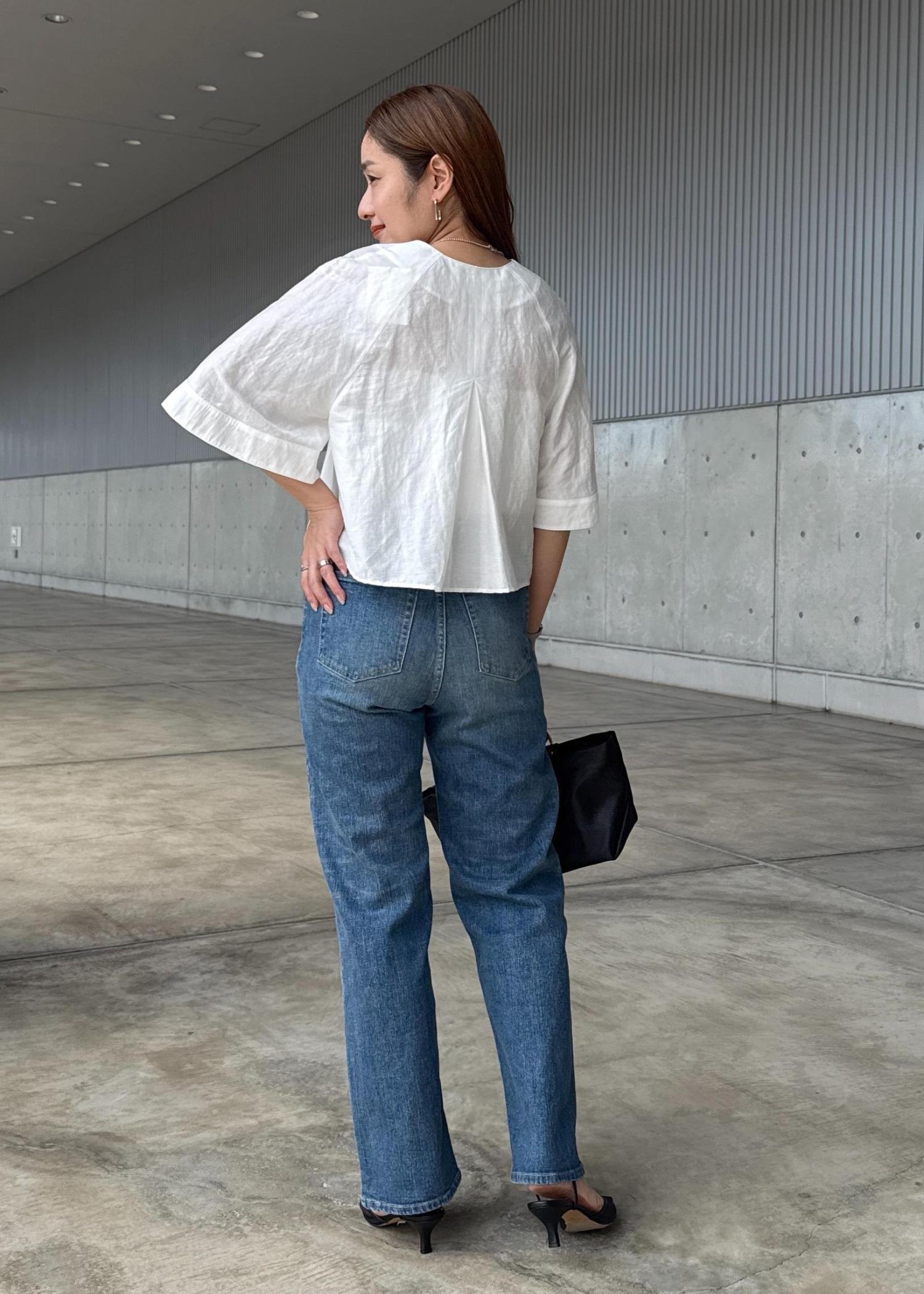 程よいデコルテラインと、ベルスリーブ調の五分丈が着痩せして見せてくる賢いブラウスです!