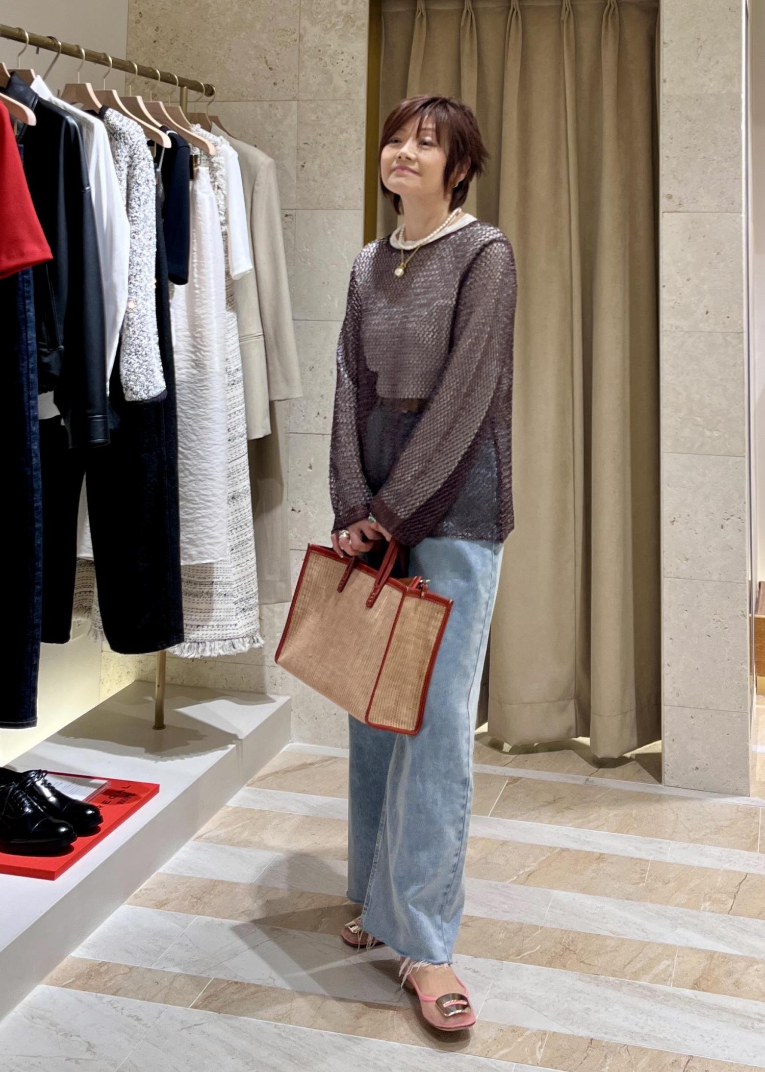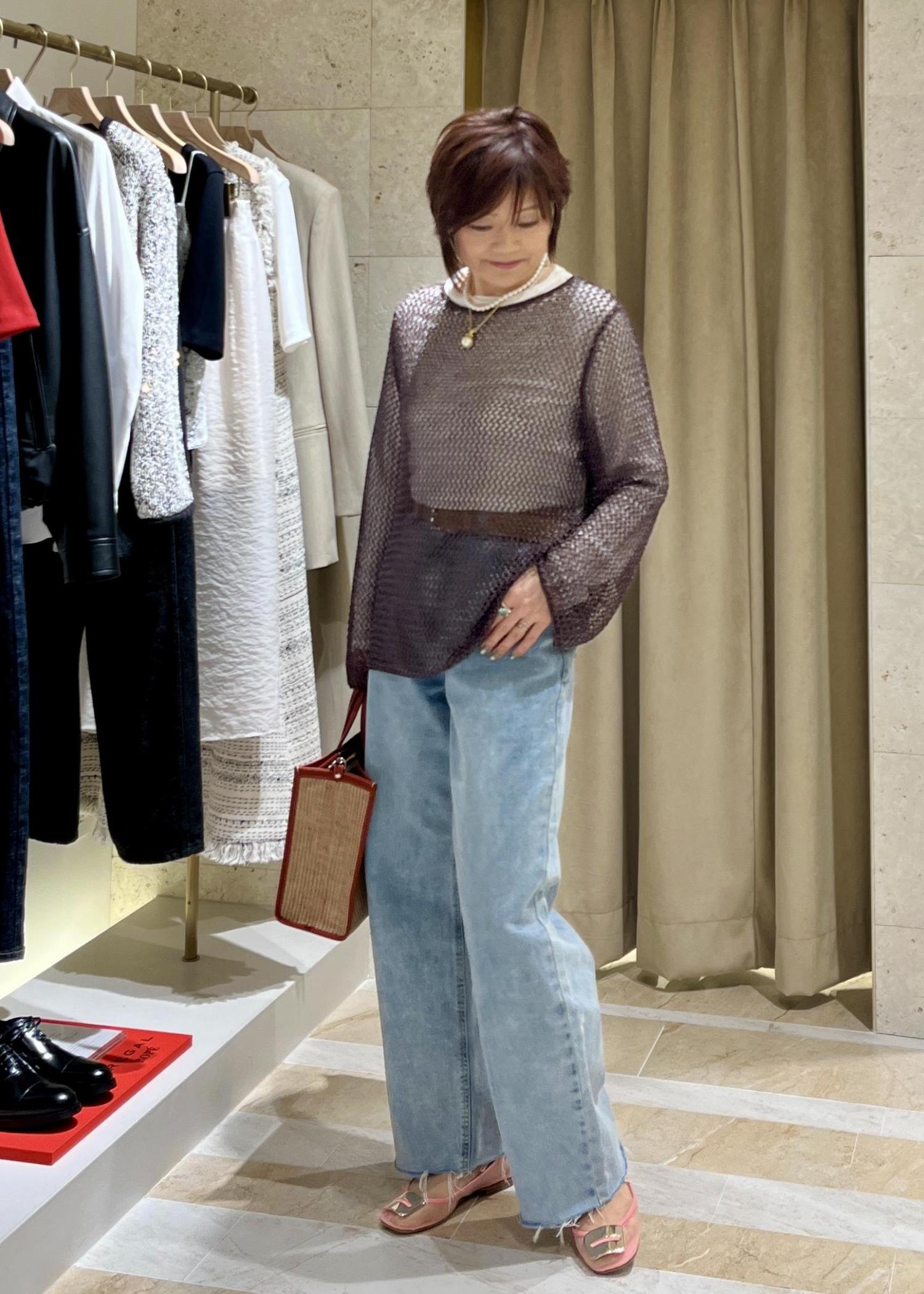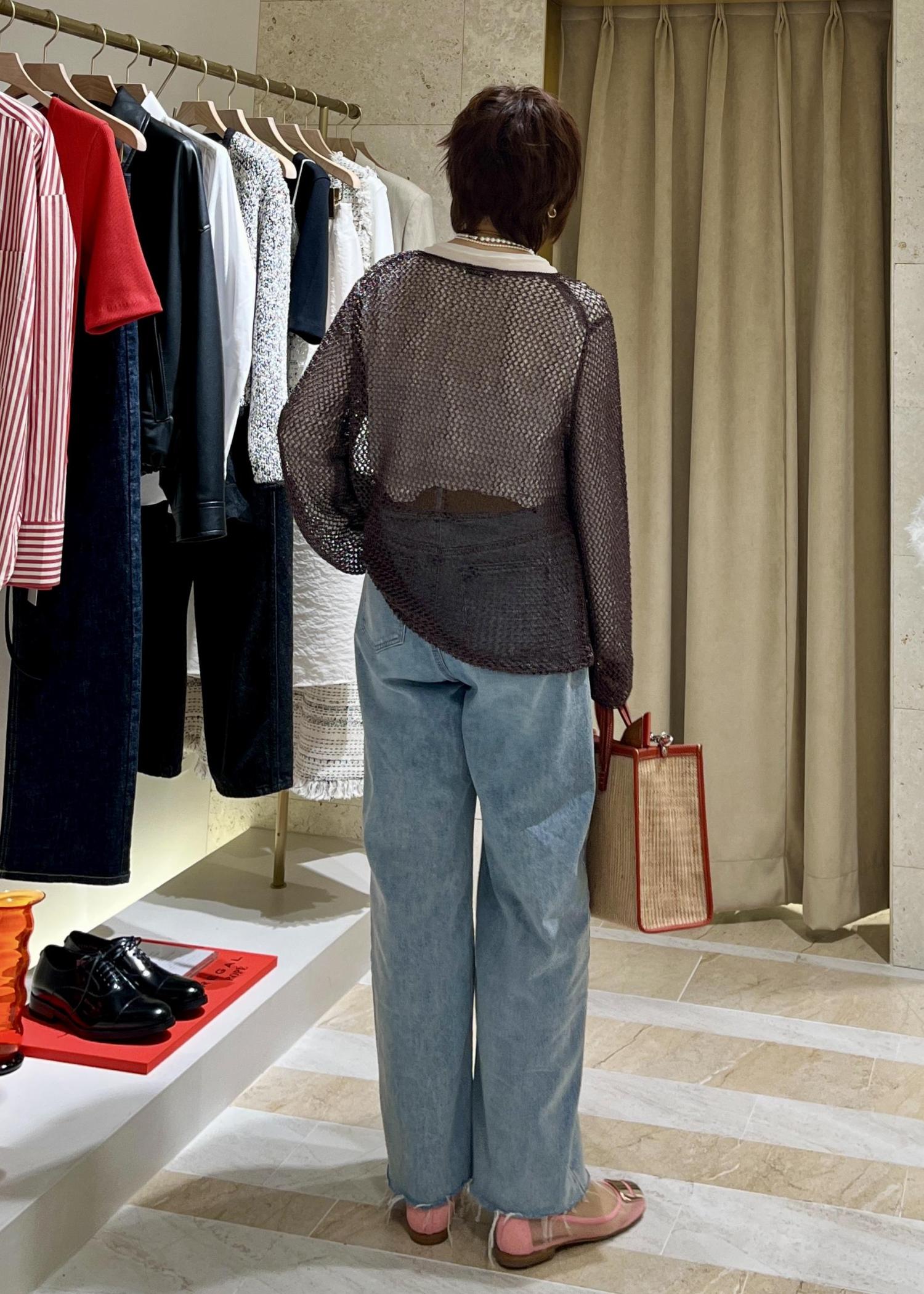 一見、重そうに見えますがメッシュの軽やかさとラメの光沢感が大人っぽいのでワイドデニムを合わせてリラクシーに仕上げました。