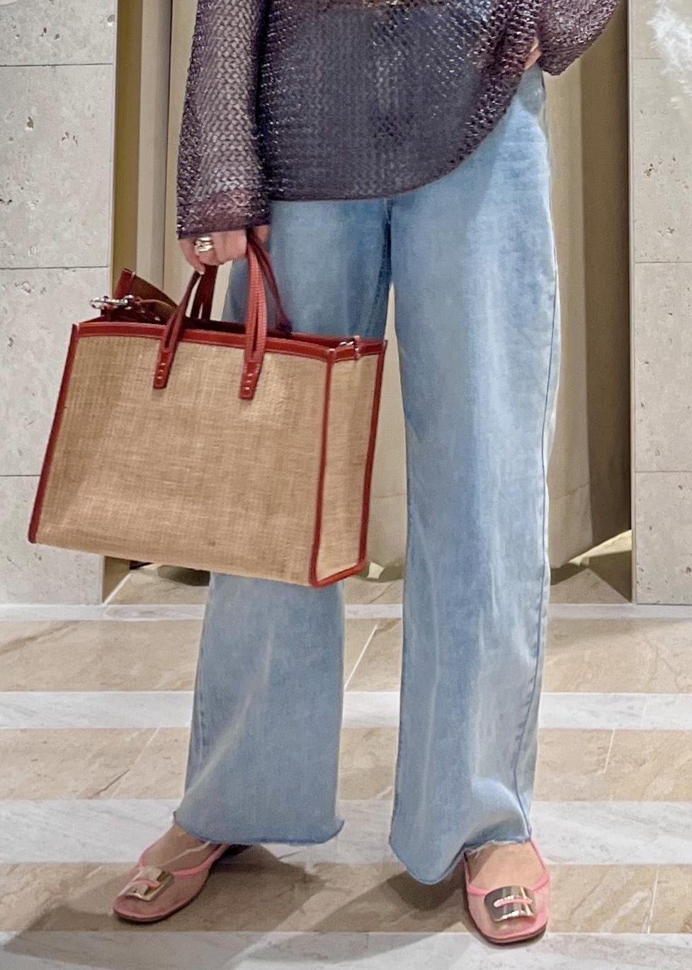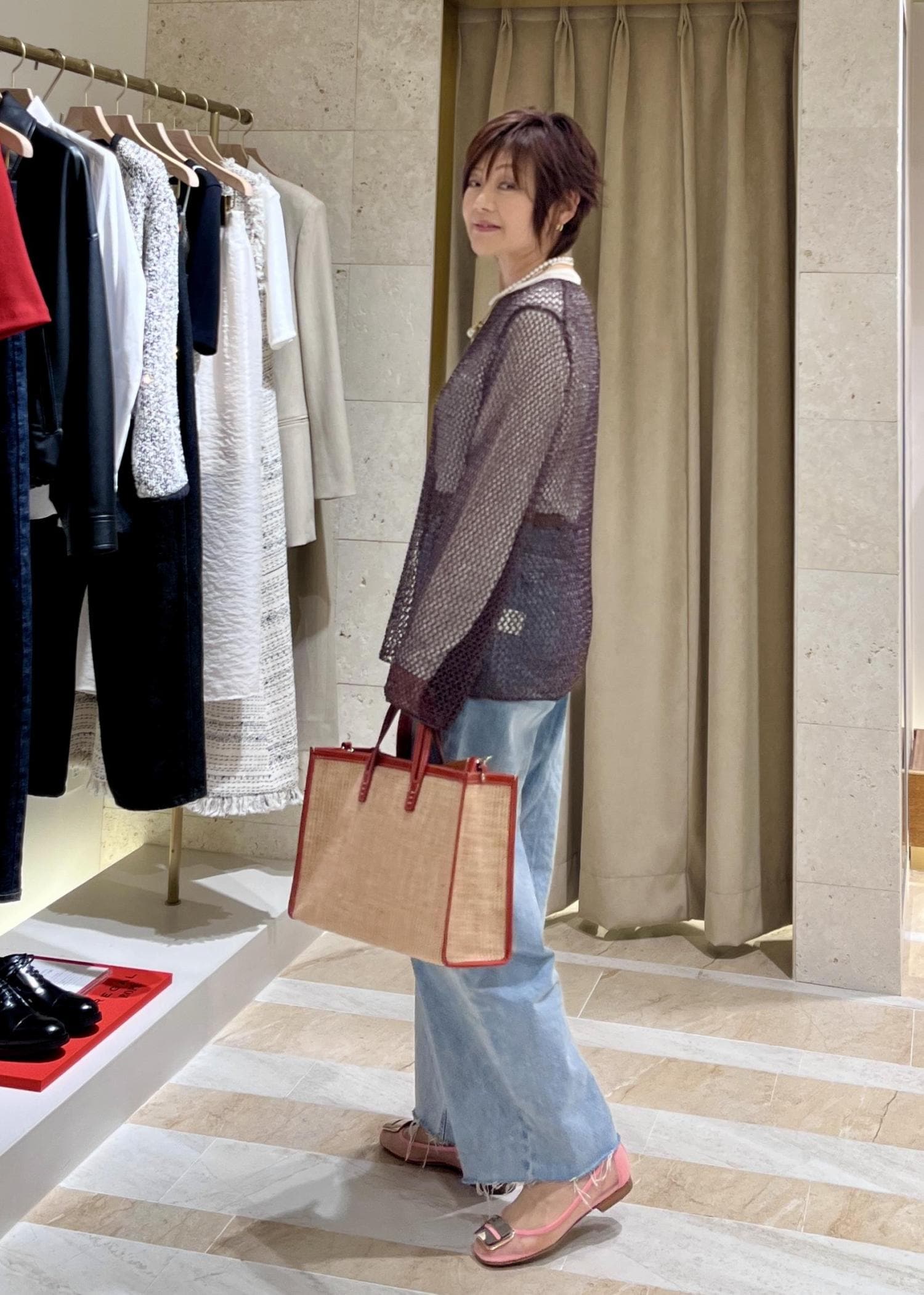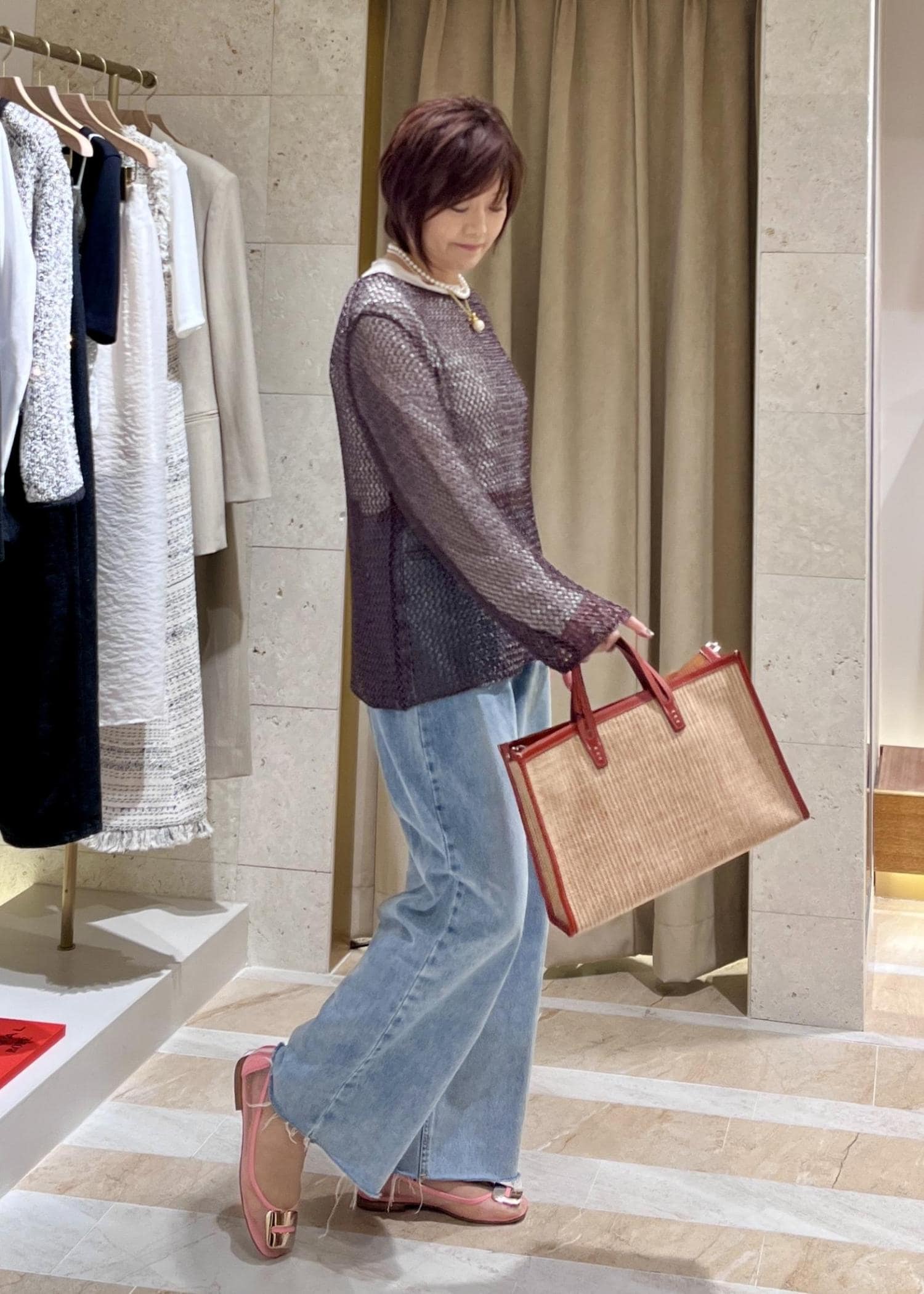 一見、重そうに見えますがメッシュの軽やかさとラメの光沢感が大人っぽいのでワイドデニムを合わせてリラクシーに仕上げました。