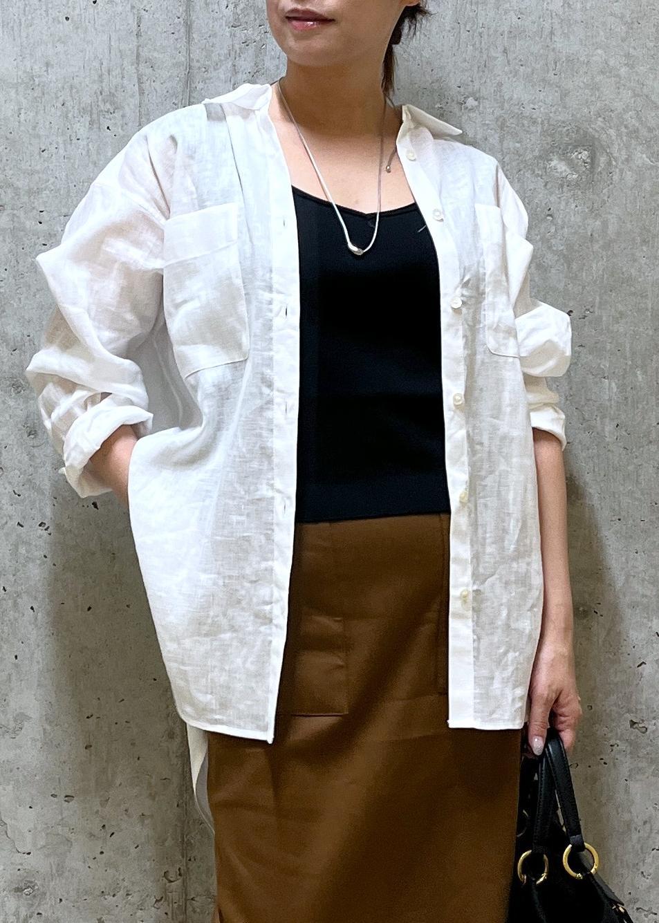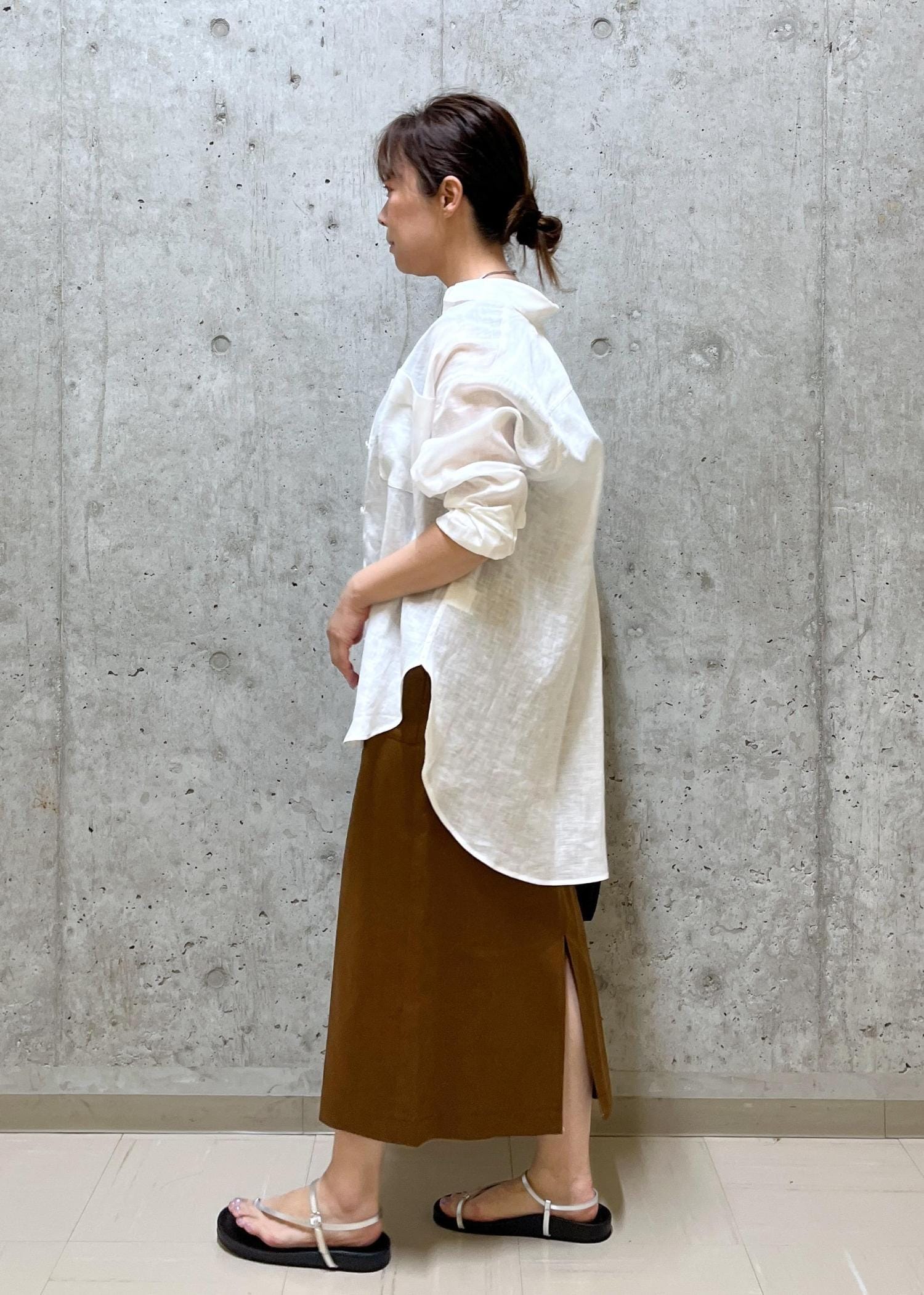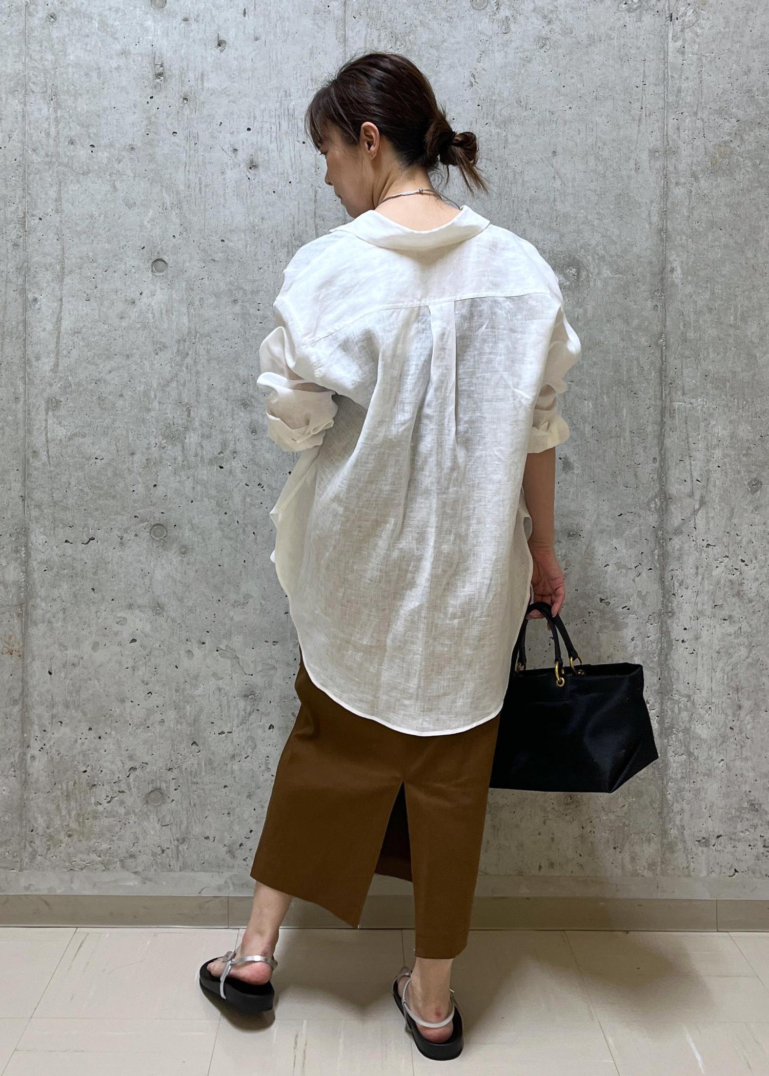 キッチリ感の出てしまうタイトスカートは、リネンのシャツとナローサンダルで少し崩したスタイルにしました。