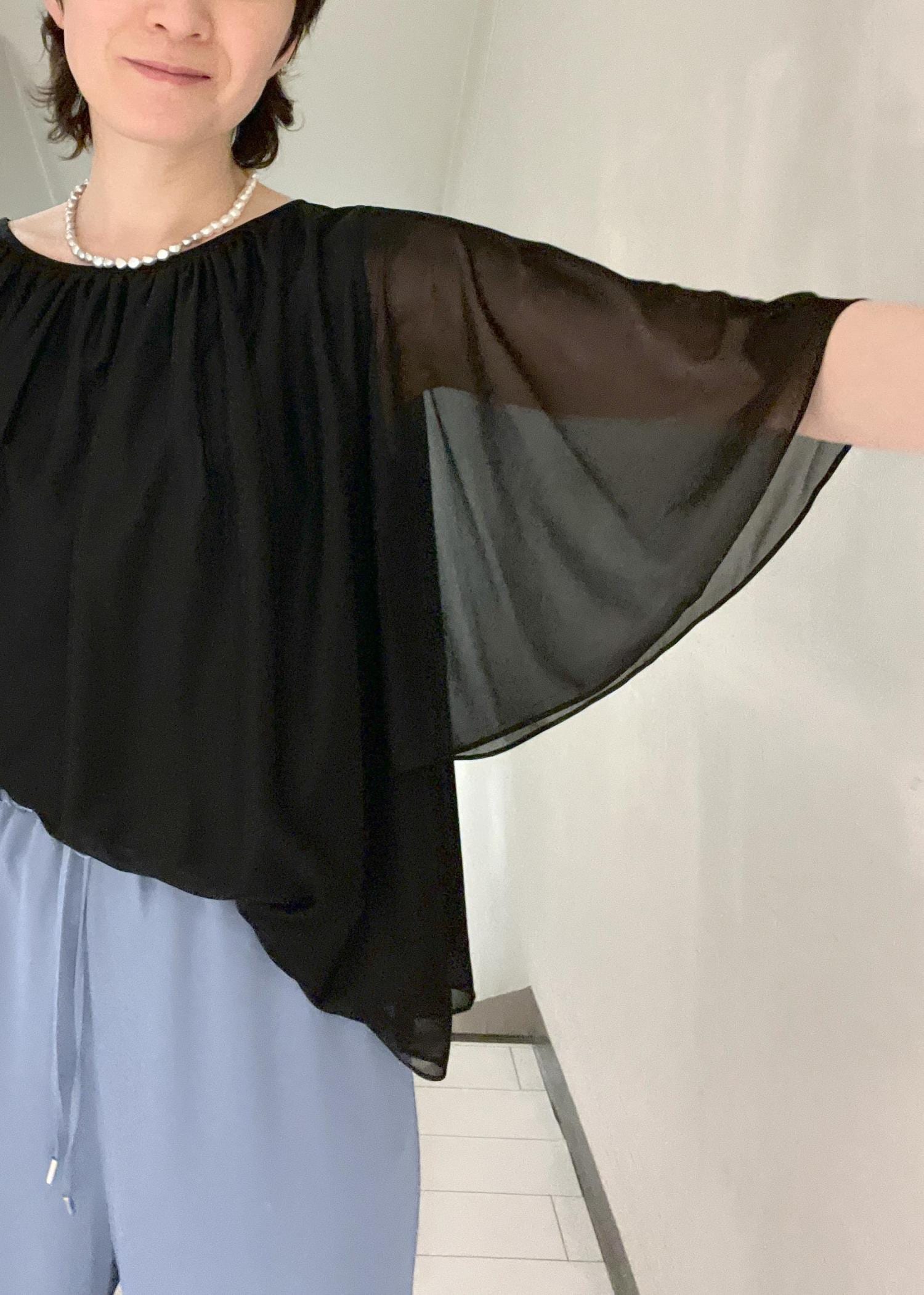 袖は肘下くらいで、しっかり二の腕が隠れます。また、身ごろには裏地があるのでインナーを気にせずお召しいただけます。