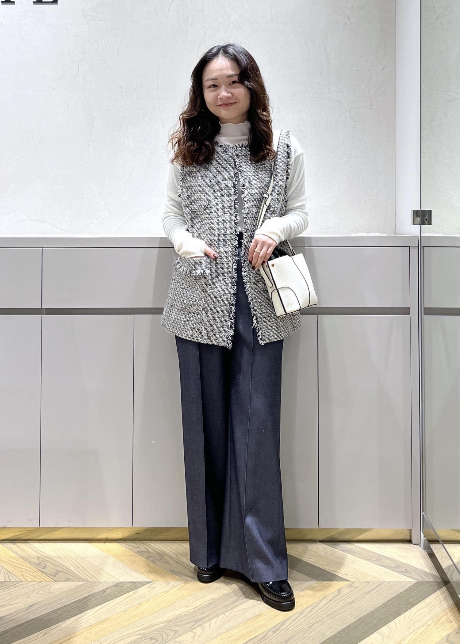通年着用可能な素材感で、柔らかさとシワになりにくい点が特徴。ワンタックで裾にかけてゆるやかなワイド、落ち感があり動きやすいです。全体的なサイズ感は少しゆったり感じました。着丈は私の身長でぎりぎりフラットシューズが履ける長さ。