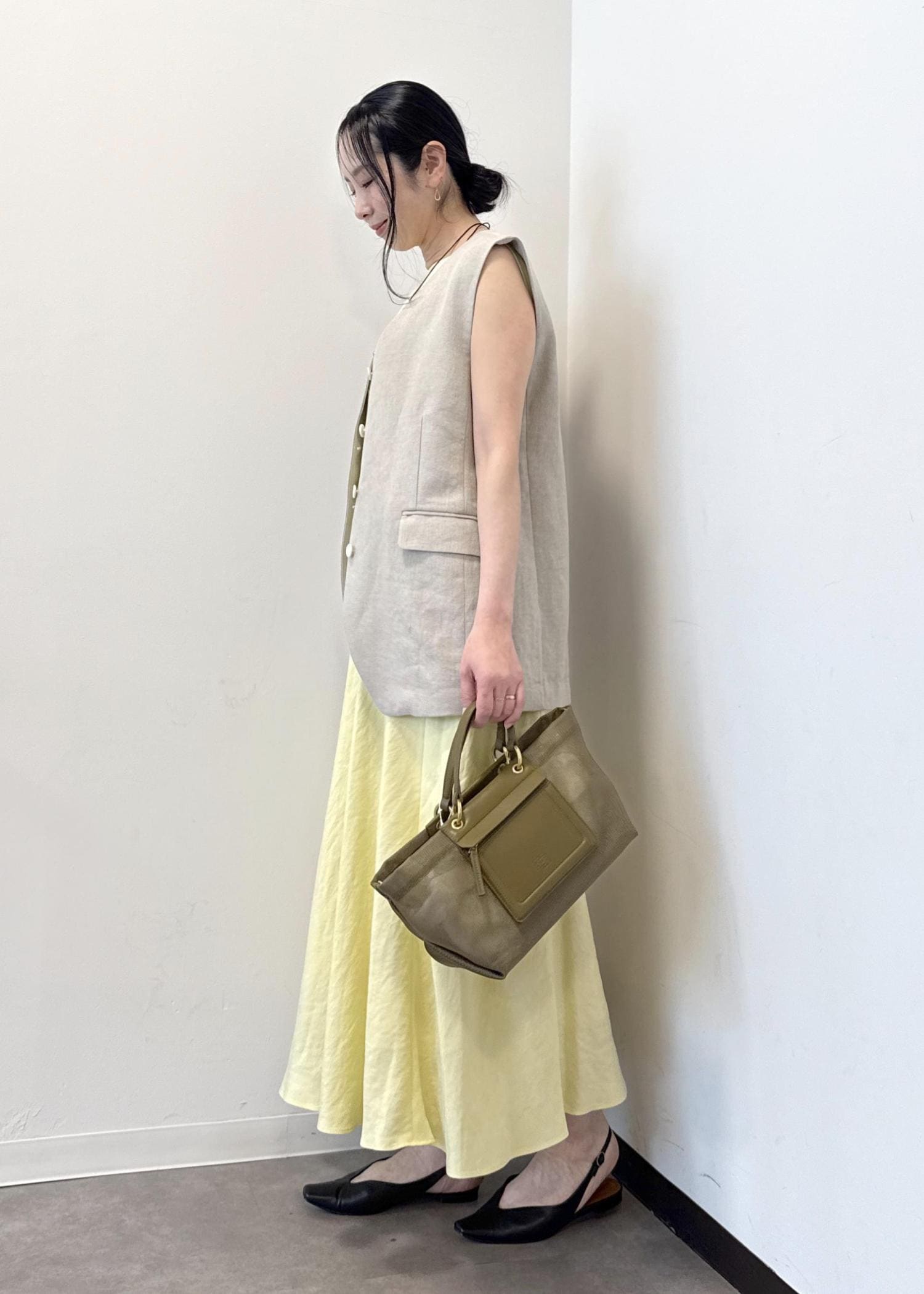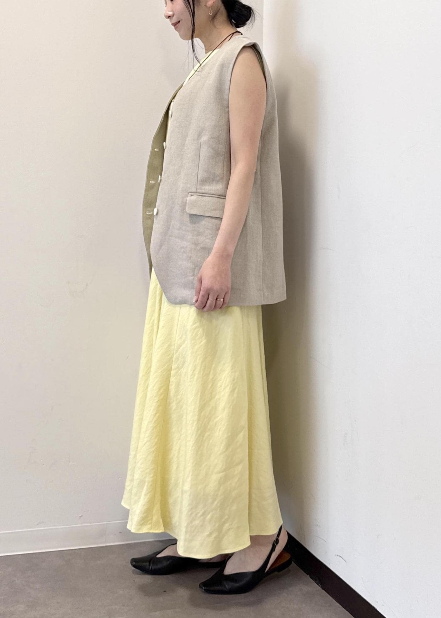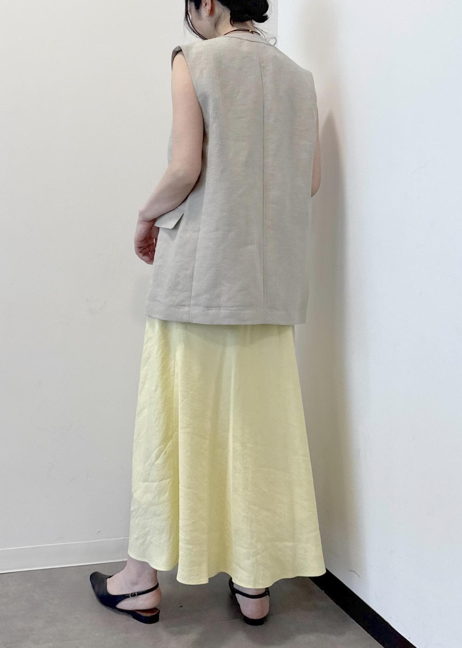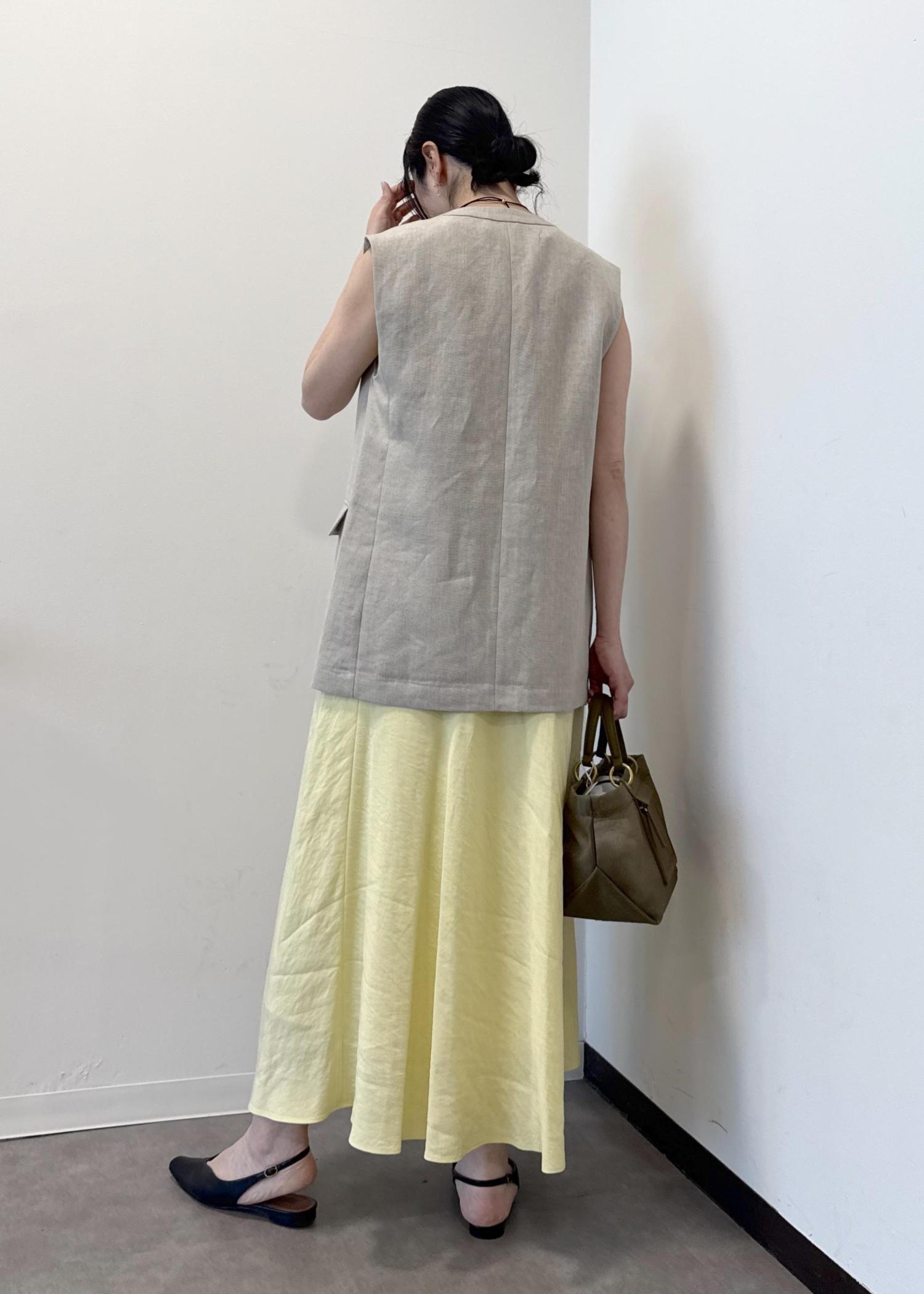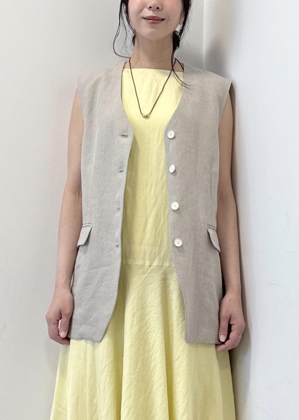 リネン100%素材のジレ。ゆとりのあるサイズ感でヒップもすっぽりと隠れる着丈です。