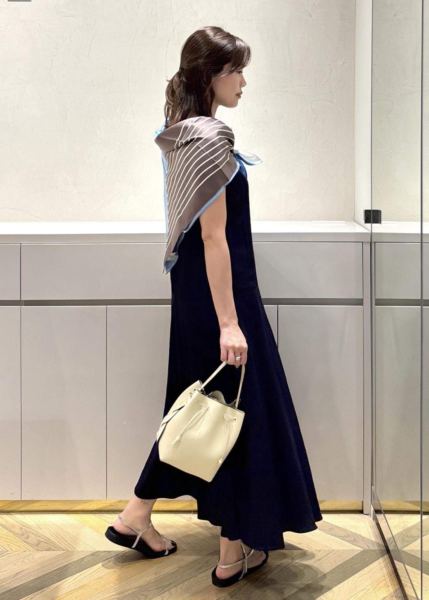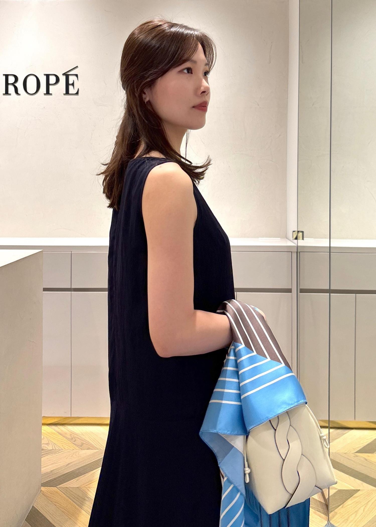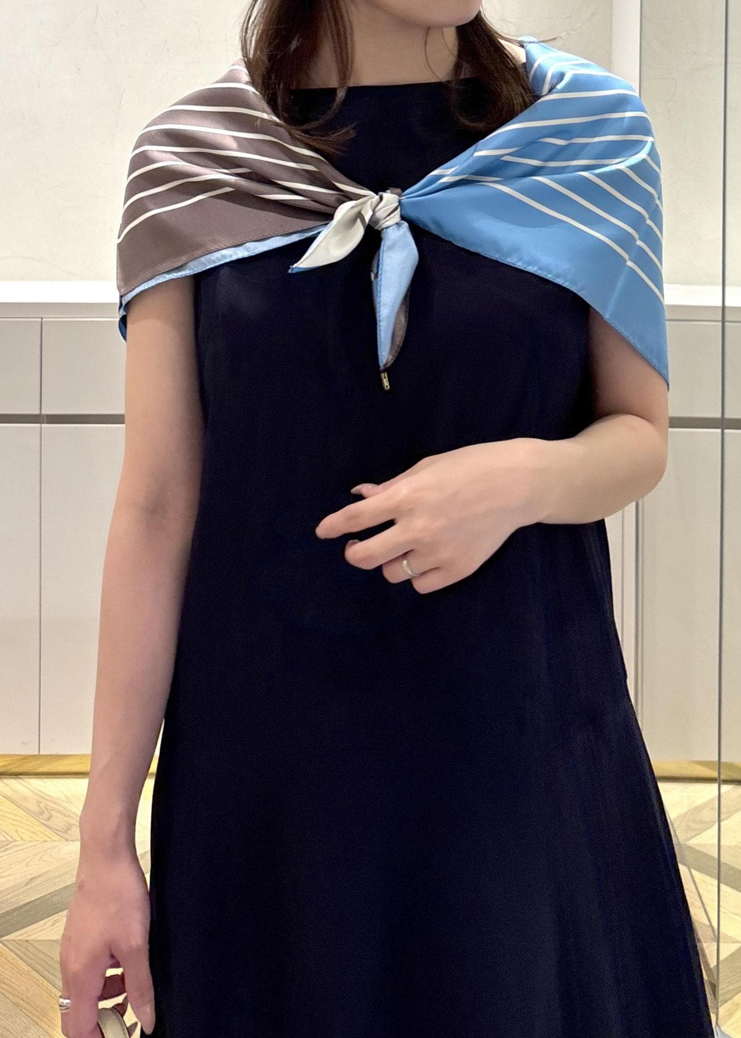 ロペで毎年取扱いしている大判サイズ。肩にかけたり、頭や腰に巻いたりとアレンジしやすいサイズです。シルク素材の艶感と、映えるストライプ柄でコーディネイトのアクセントに。