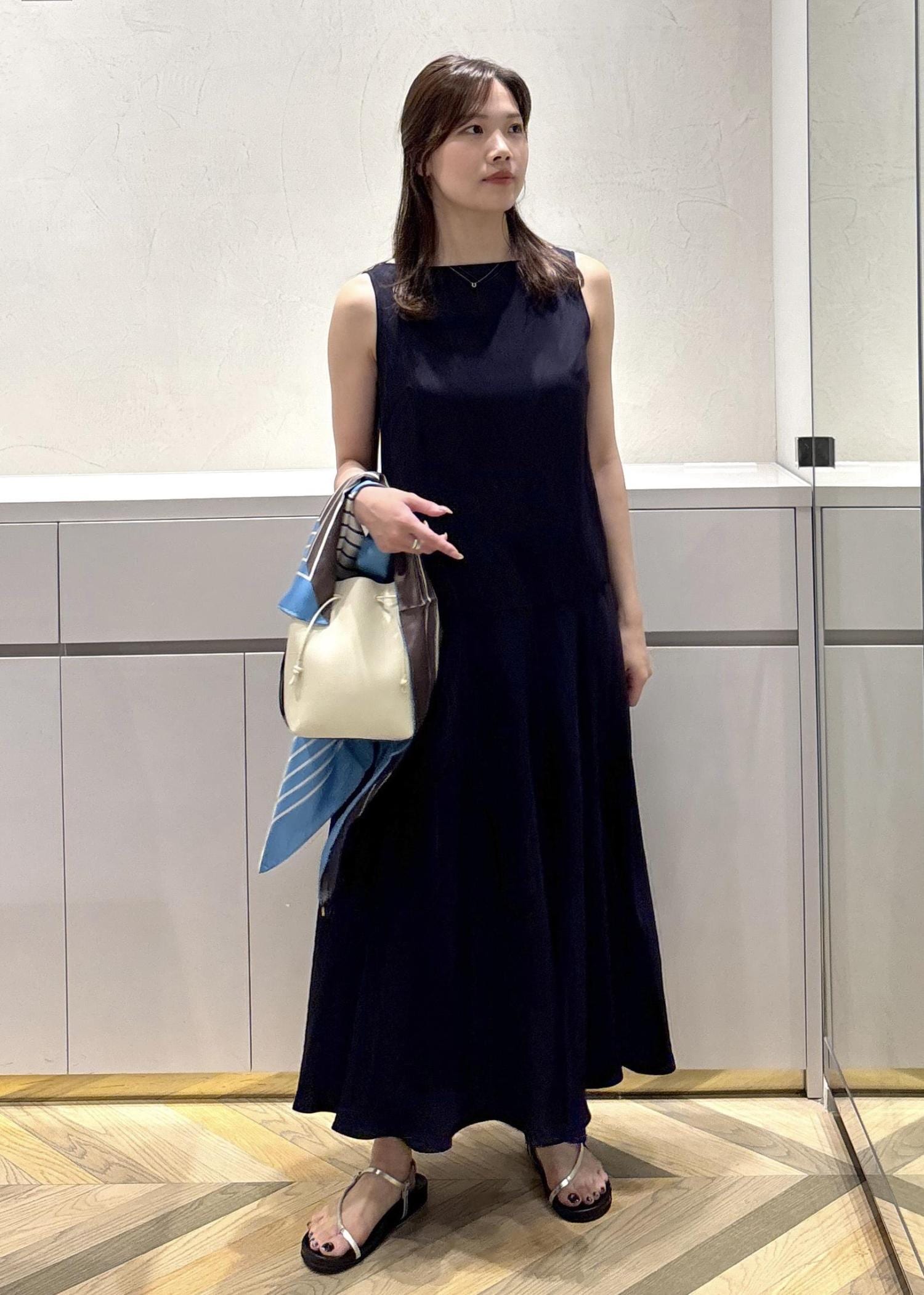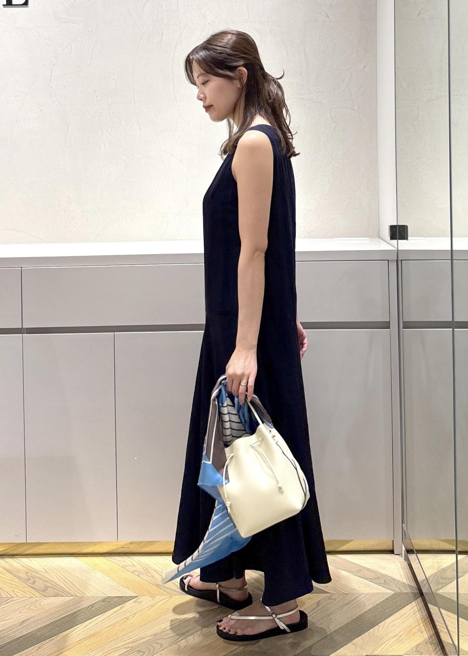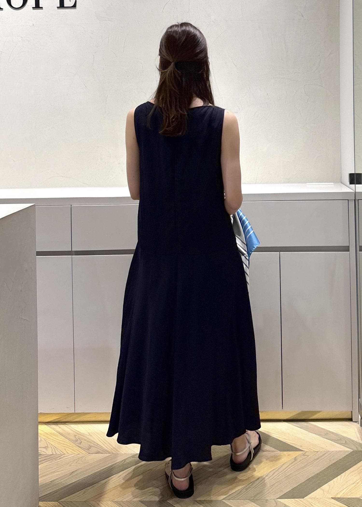 柔らかい生地感でリネンのナチュラルな風合いが特徴。落ち感とほどよく艶もあるので女性らしい印象です。裾にかけてゆるくフレアの動きが出るので足捌きも軽やか、涼しく感じました。全体のサイズ感はややゆったりめ、着丈は私の身長でくるぶしあたり。