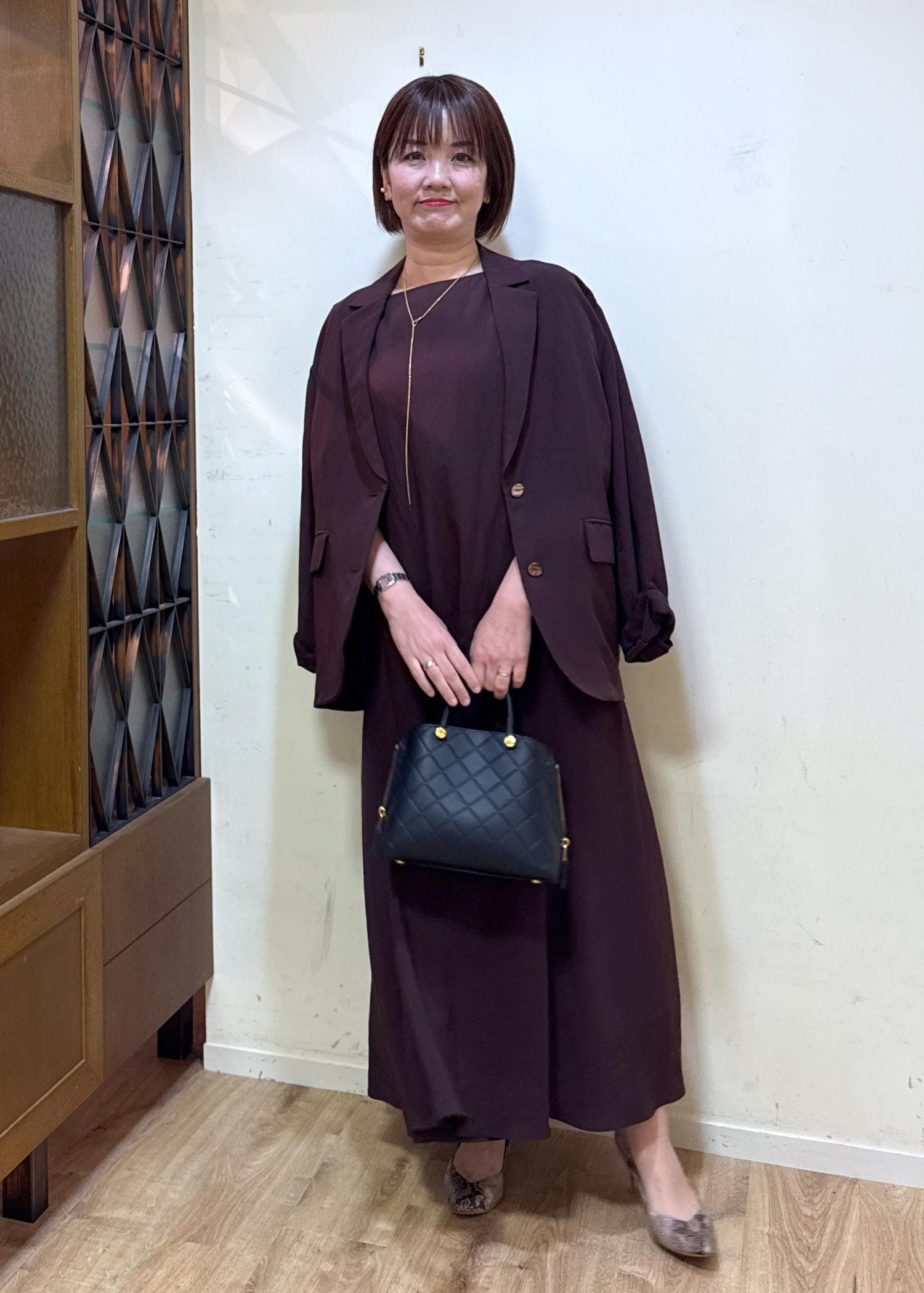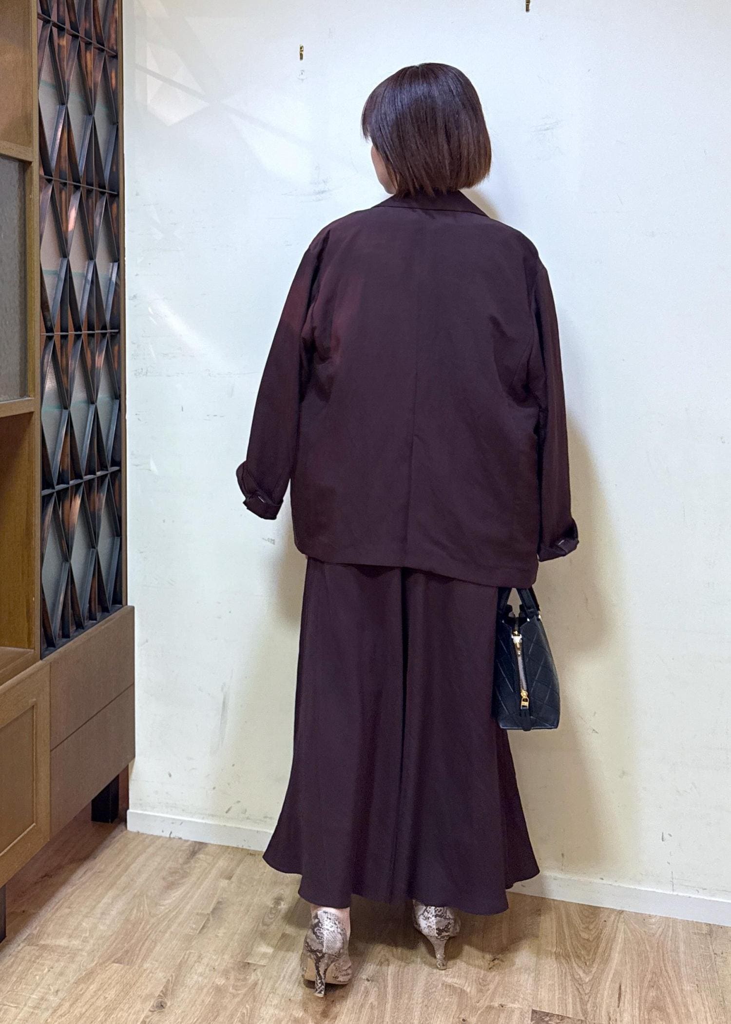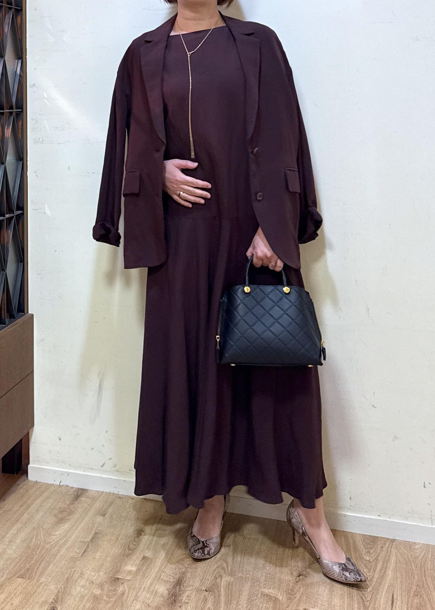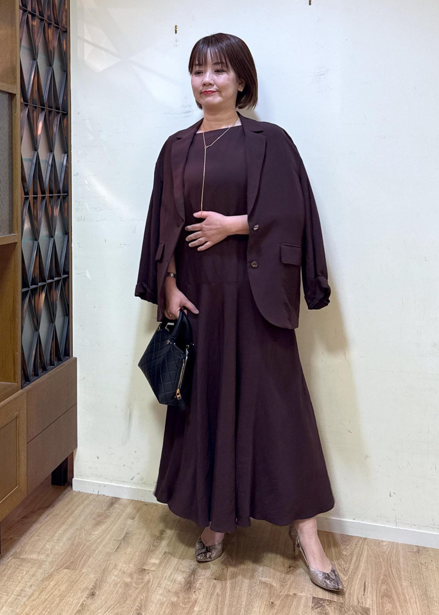 お仕事から初夏のお出かけなシーンに合わしていただけるセットアップです。これからの梅雨の時期にもはレーヨンリネンのお素材なので上品な光沢感の深みのあるブラウンが凄くキレイです。