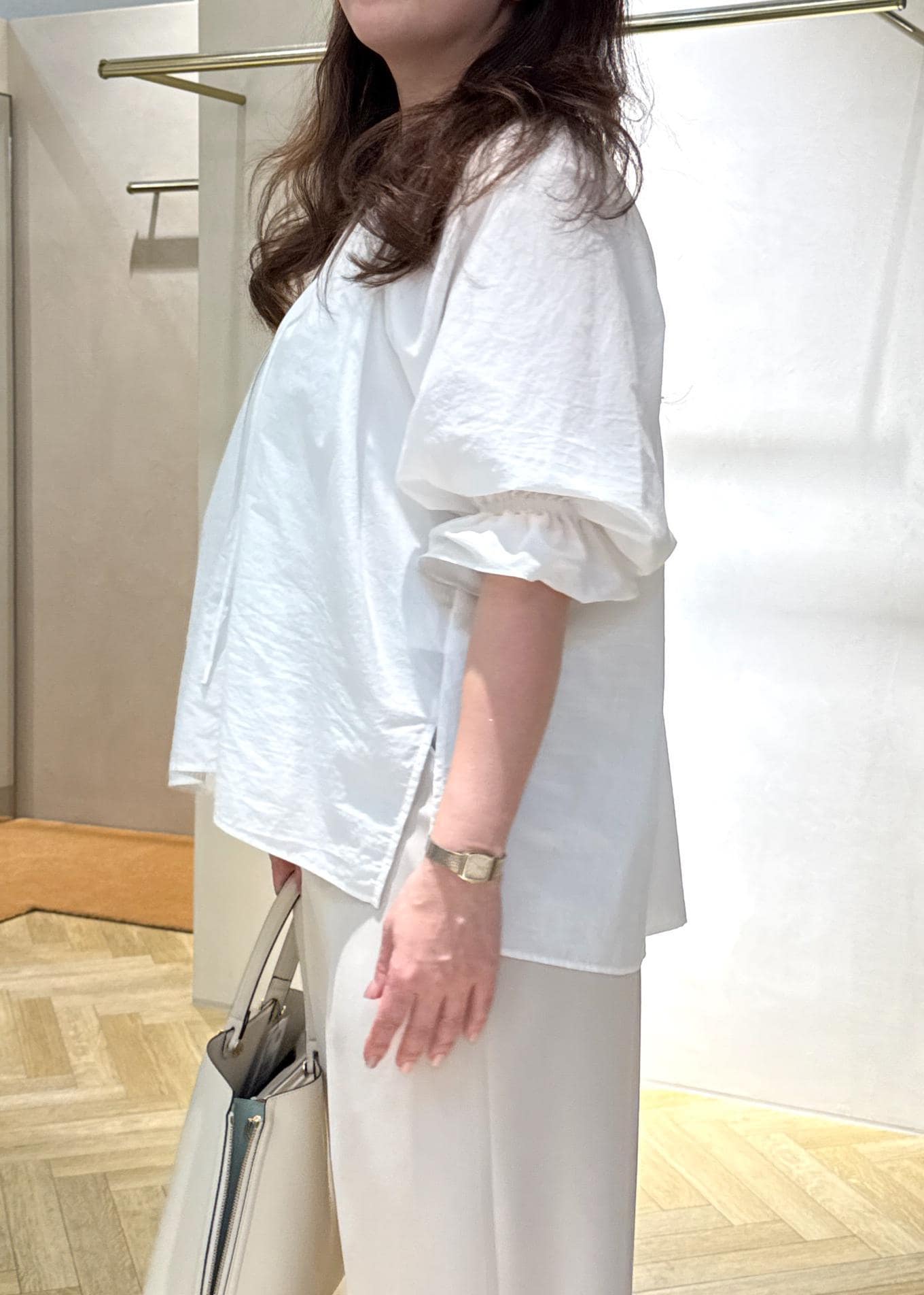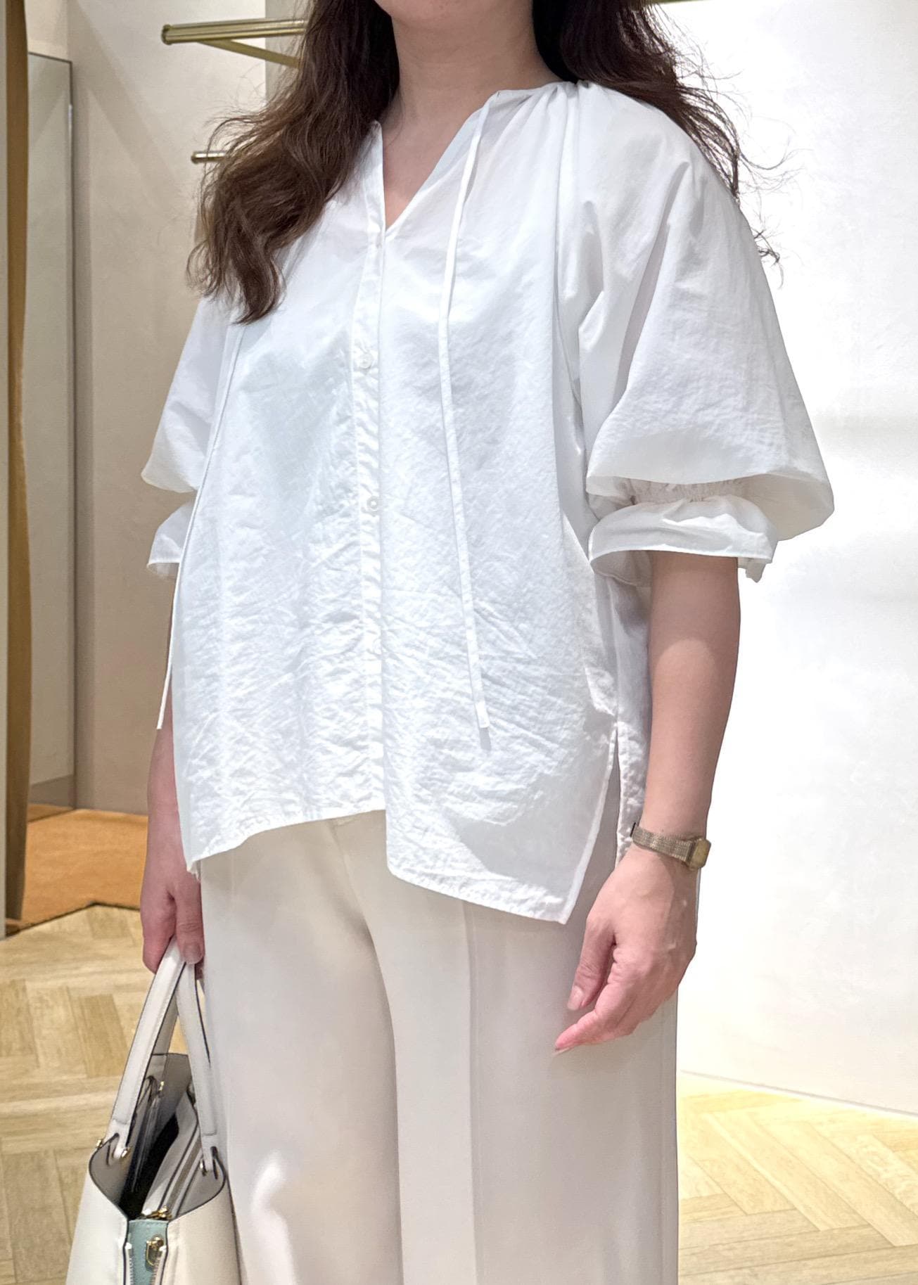 ややボリューミーなシルエットなので首のリボンは結ばずV開きを作ることでスッキリ見えるポイントにしています。 -