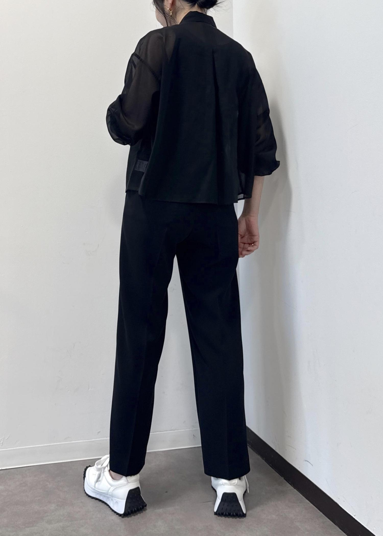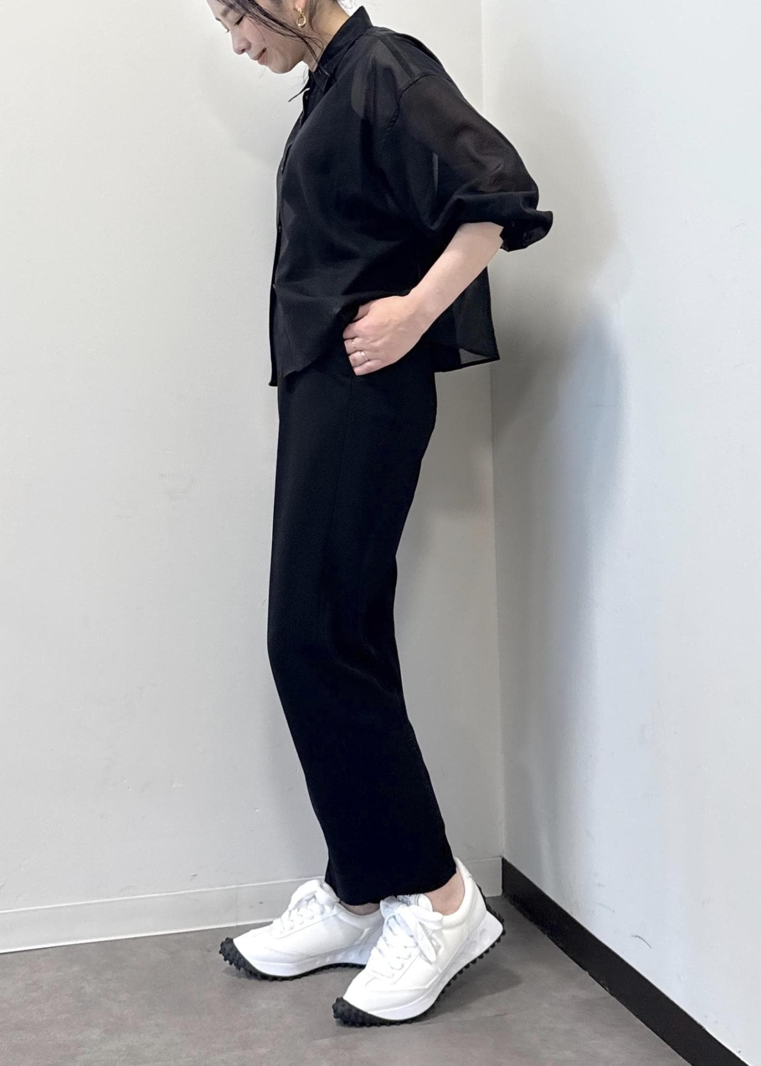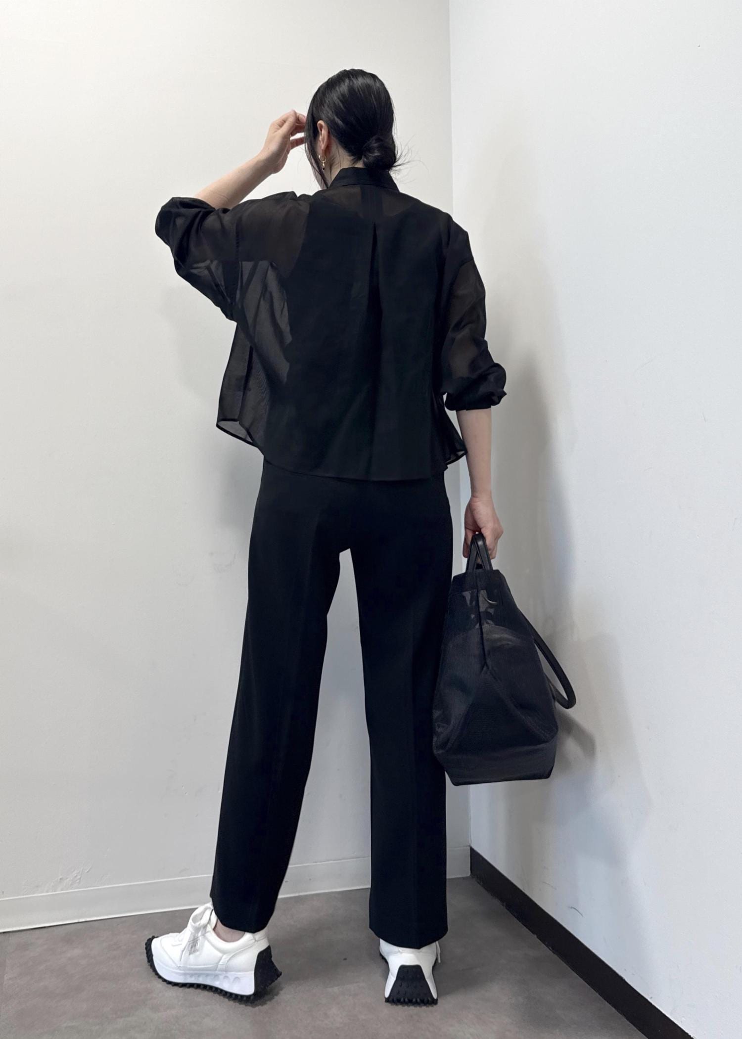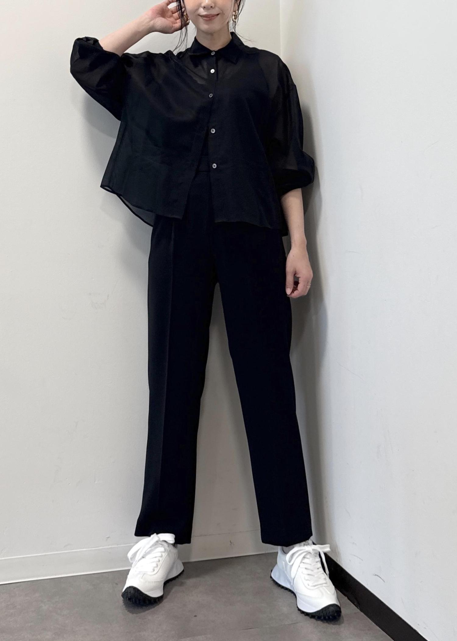 今回はクロップド丈の黒シャツと黒のテーパードパンツを合わせてワントーンコーディネートにしてみました。きちんと感もありながら足元はスニーカーで抜け感をプラス。