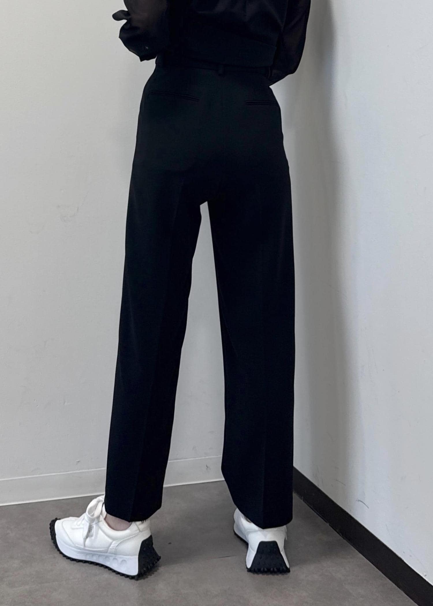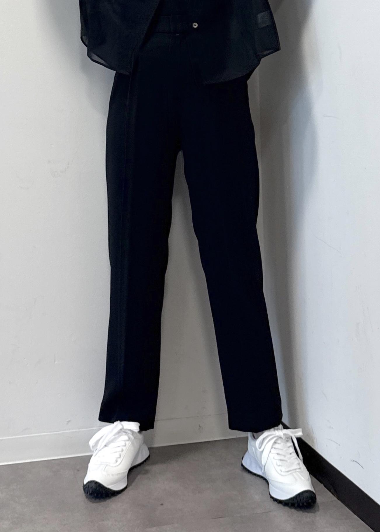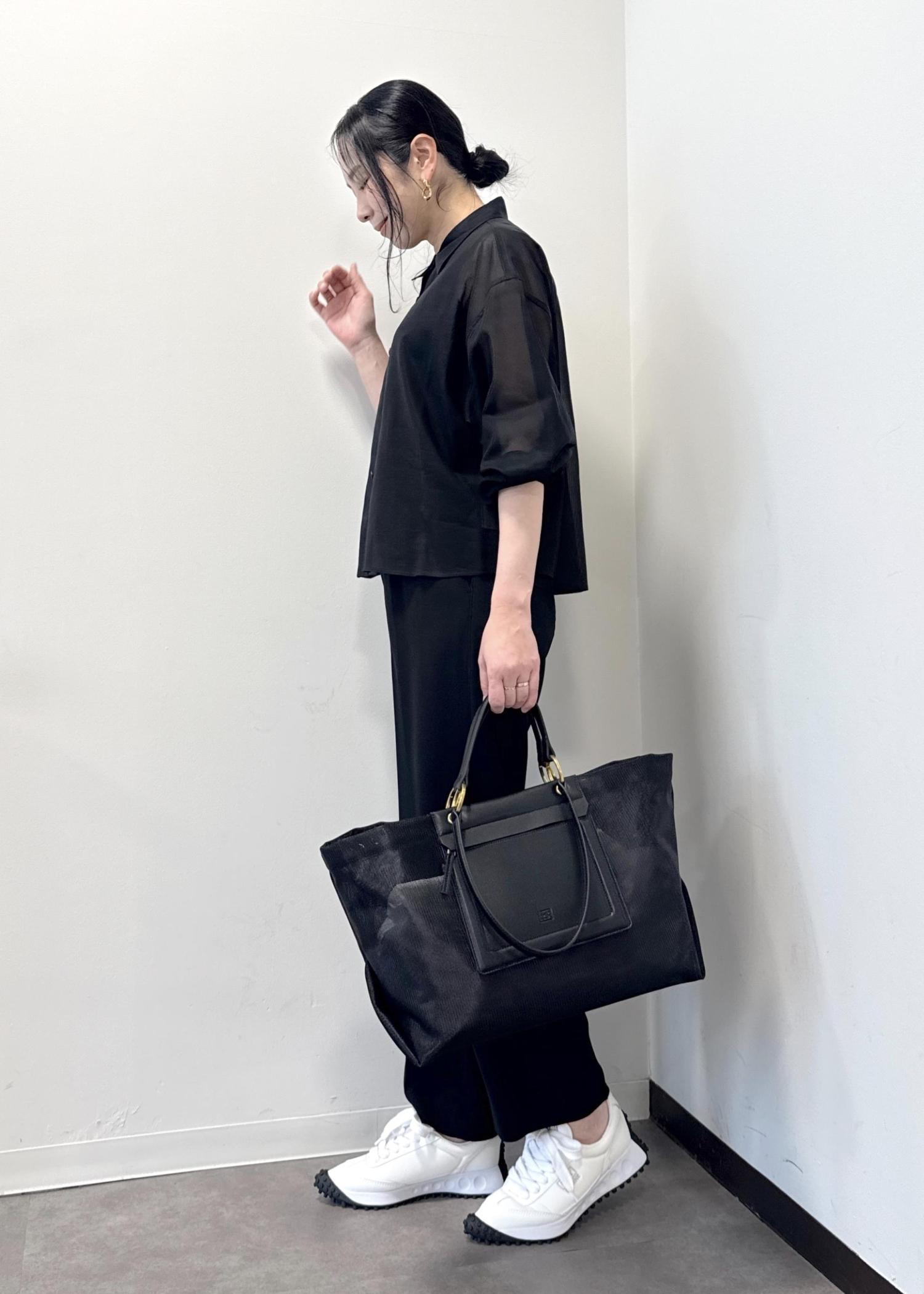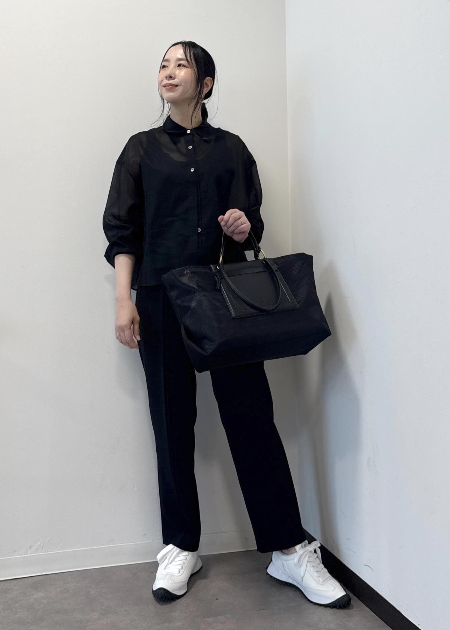 今回はクロップド丈の黒シャツと黒のテーパードパンツを合わせてワントーンコーディネートにしてみました。きちんと感もありながら足元はスニーカーで抜け感をプラス。
