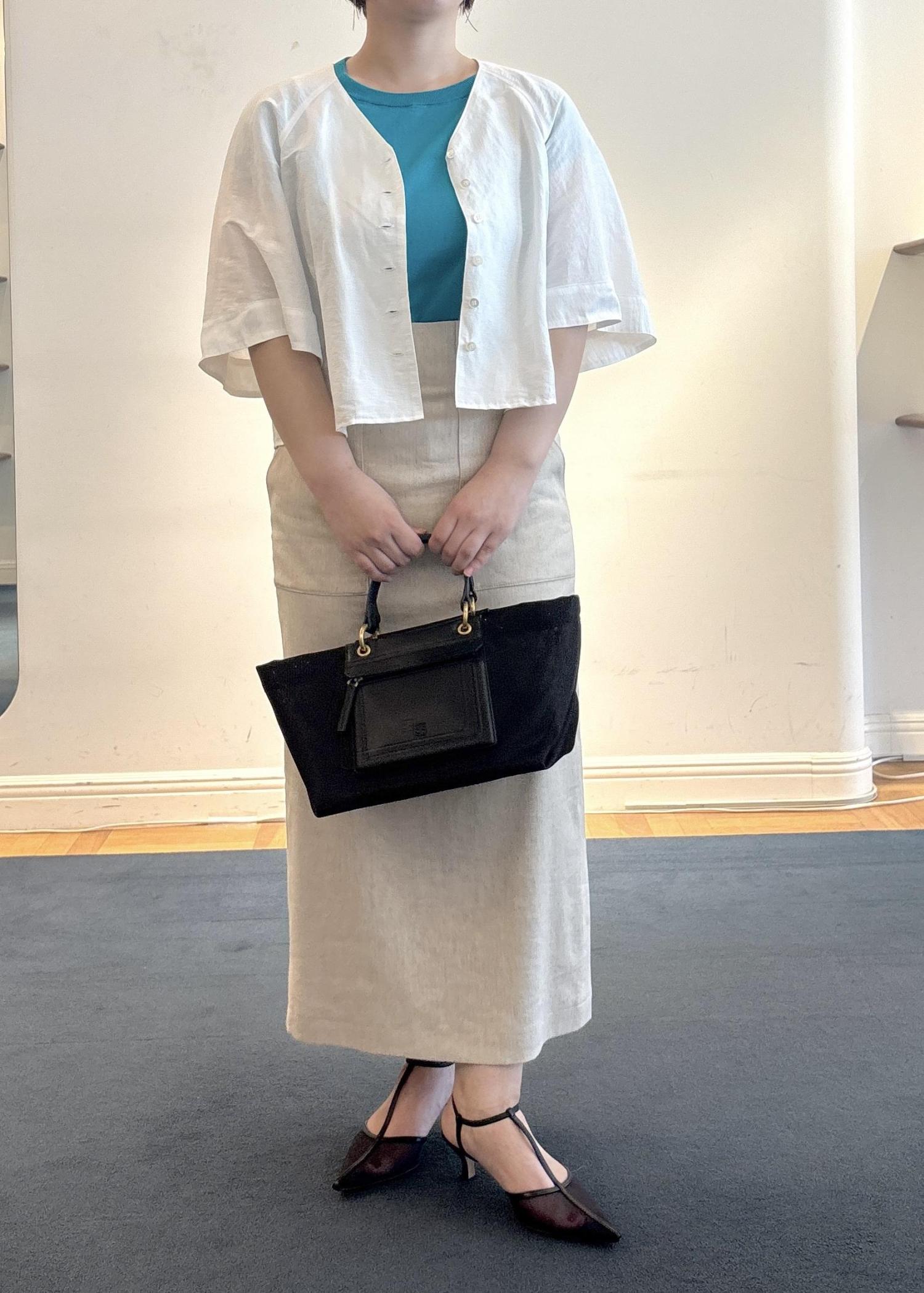 ゆったりシルエットの短丈トップスにすると、ヒップに目が行きにくく着やすくなります。