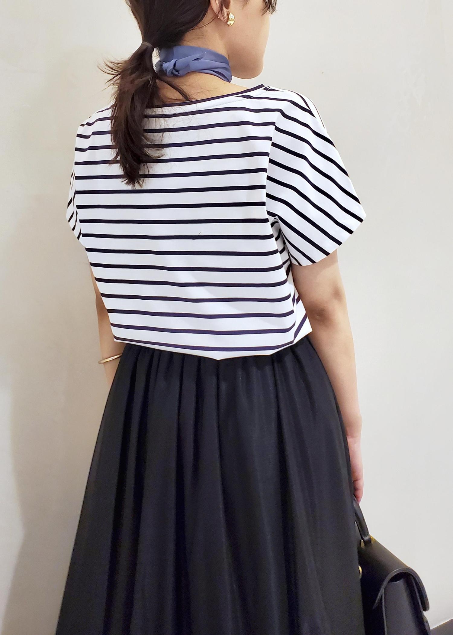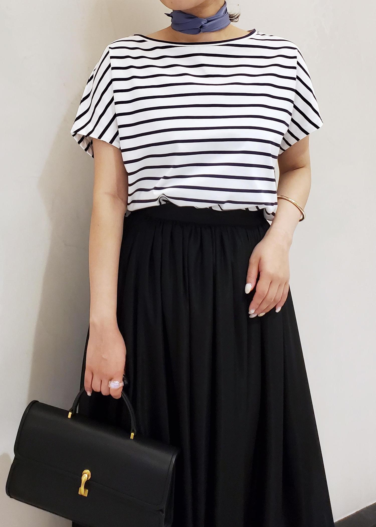 襟元は横に広がる丸首でつまりすぎず、すっきりとした印象で着られます。