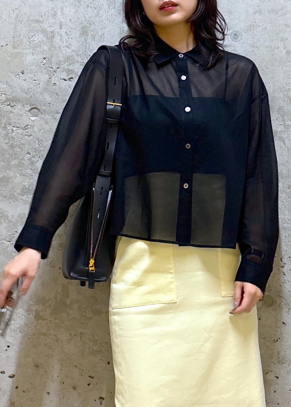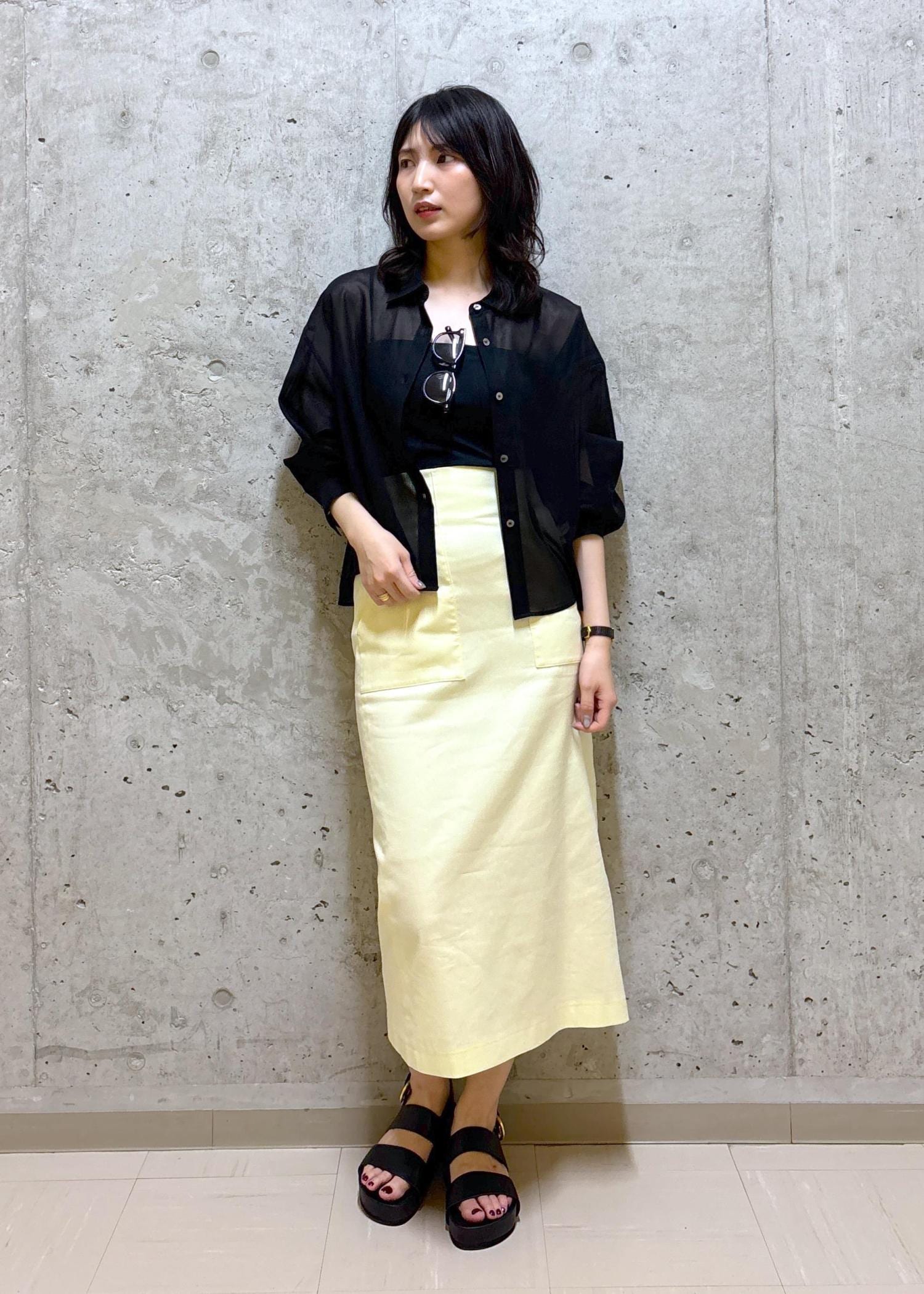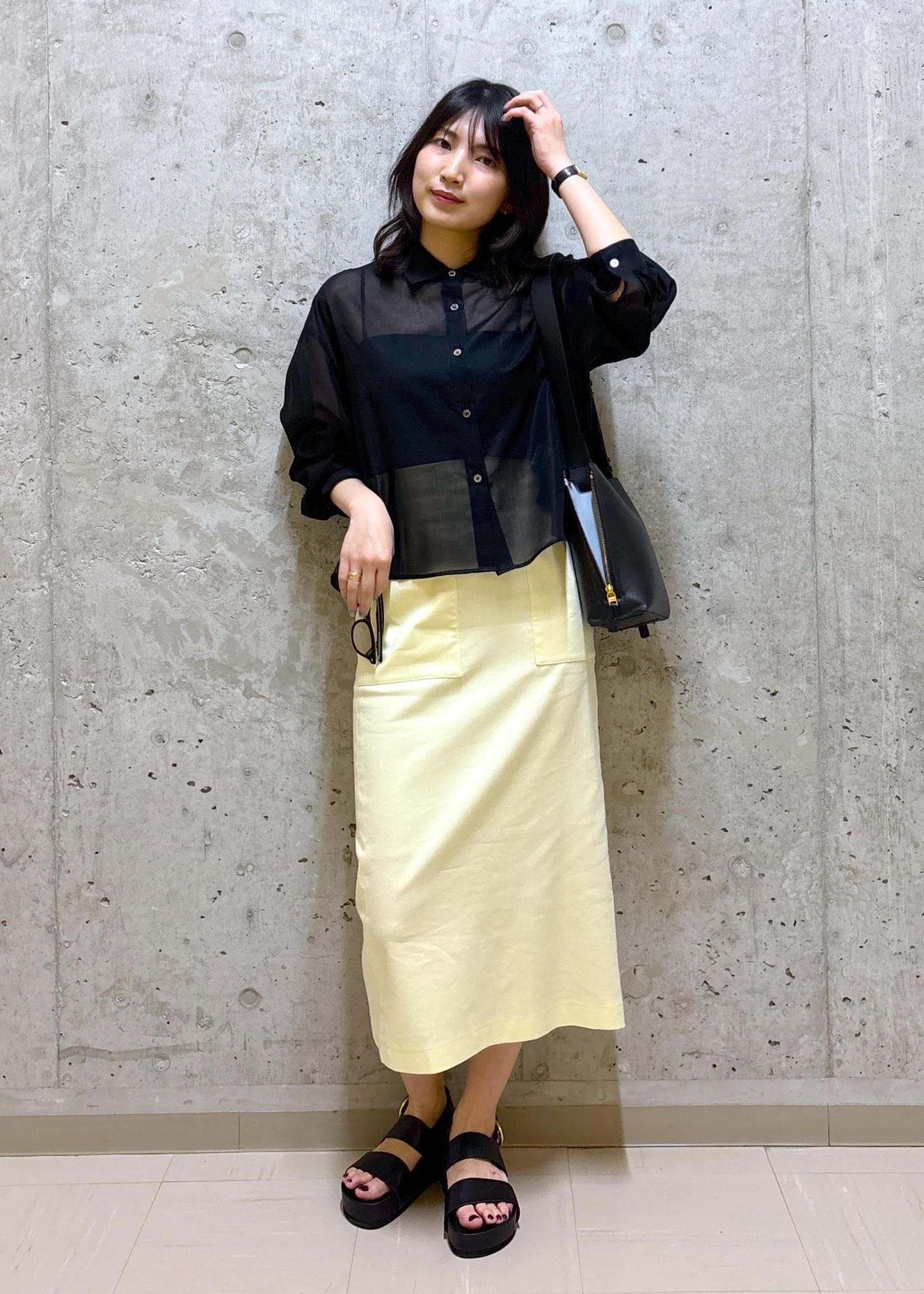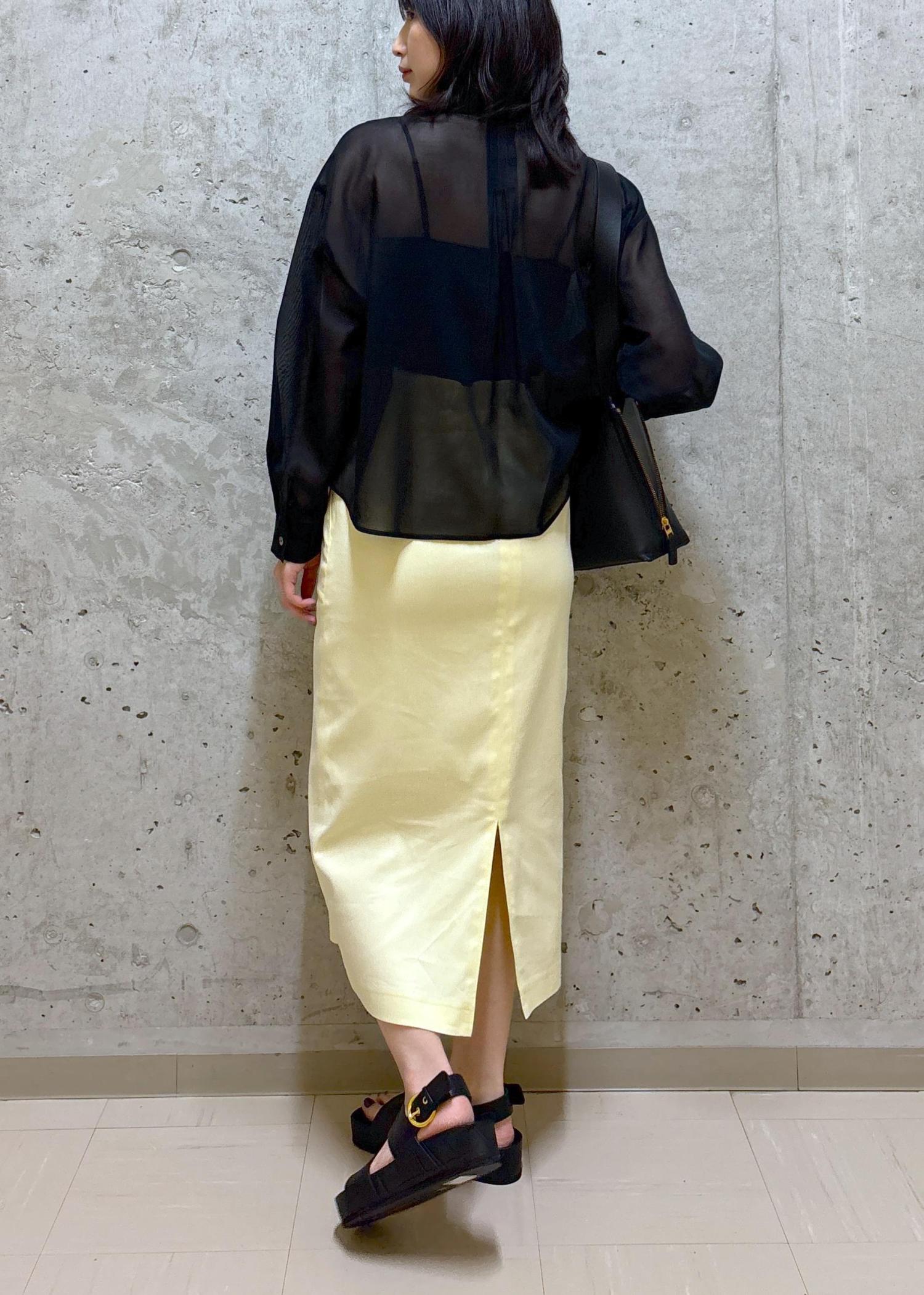 ショート丈のシャツと柔らかいイエローのタイトスカートで