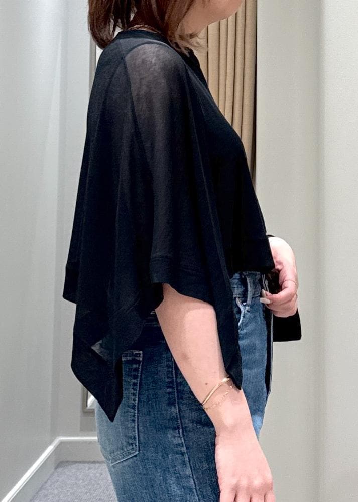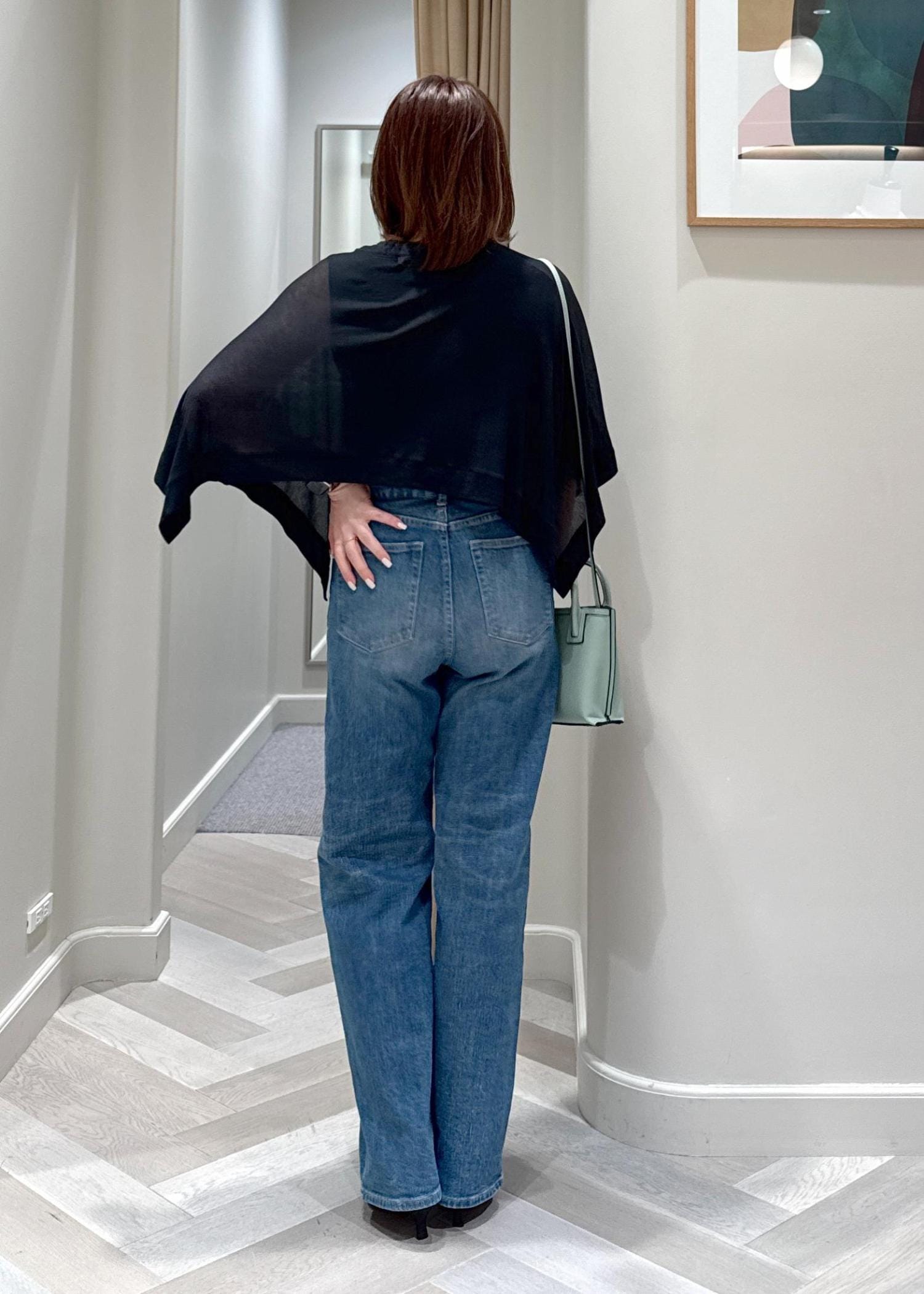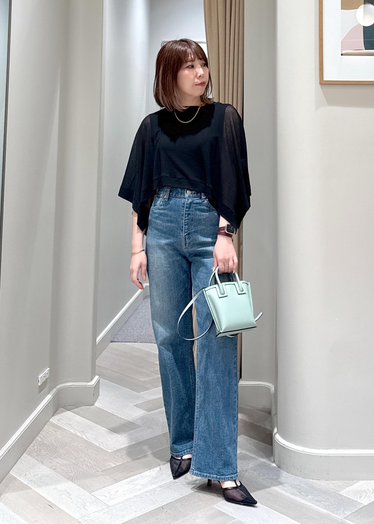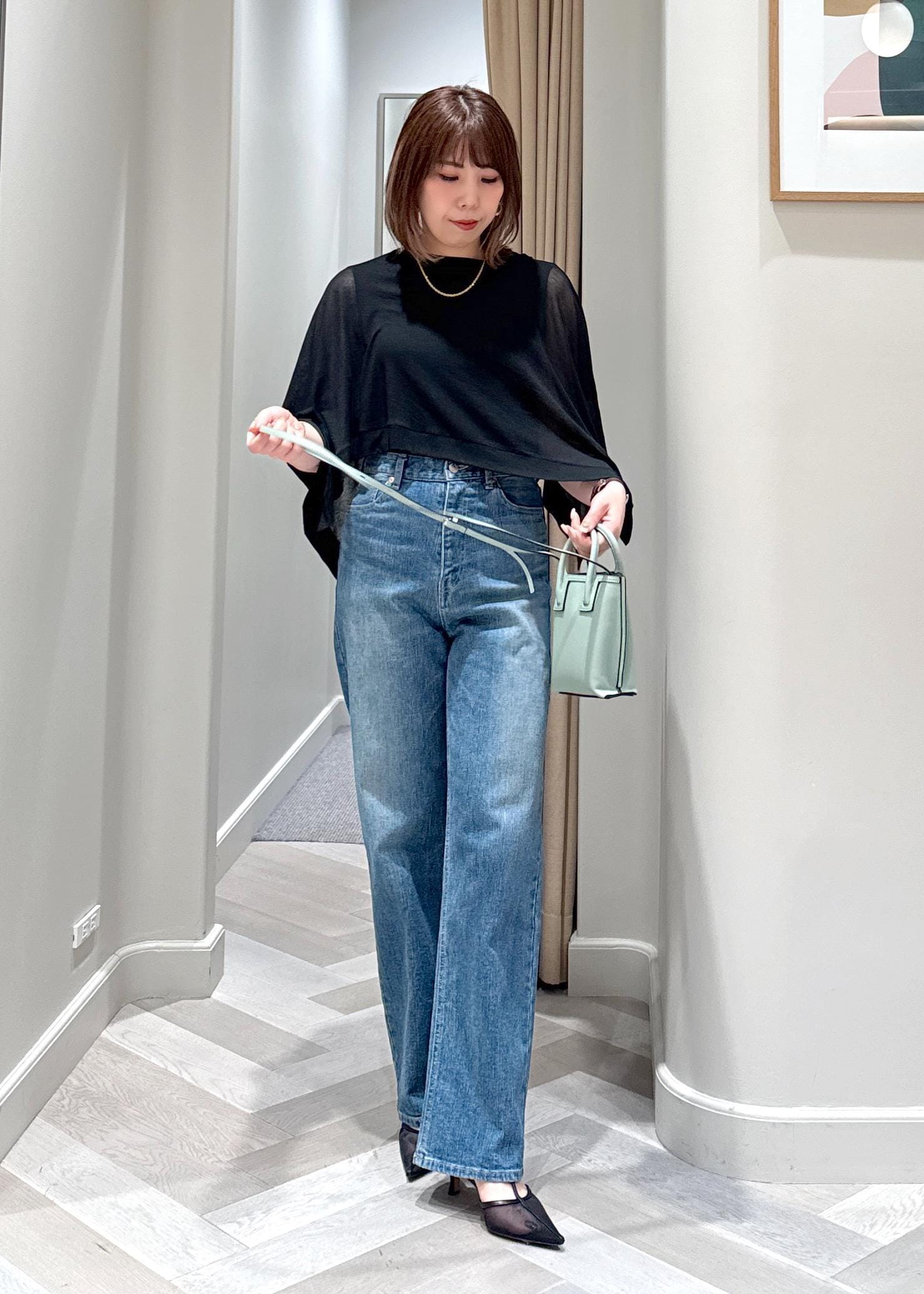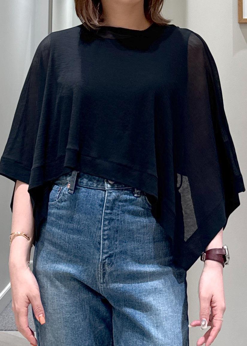 エレガントなイメージのケープをデニムでカジュアルダウンしたスタイリング!カットソー素材なのでカジュアルなアイテムにも合わせやすくてお勧めです。
