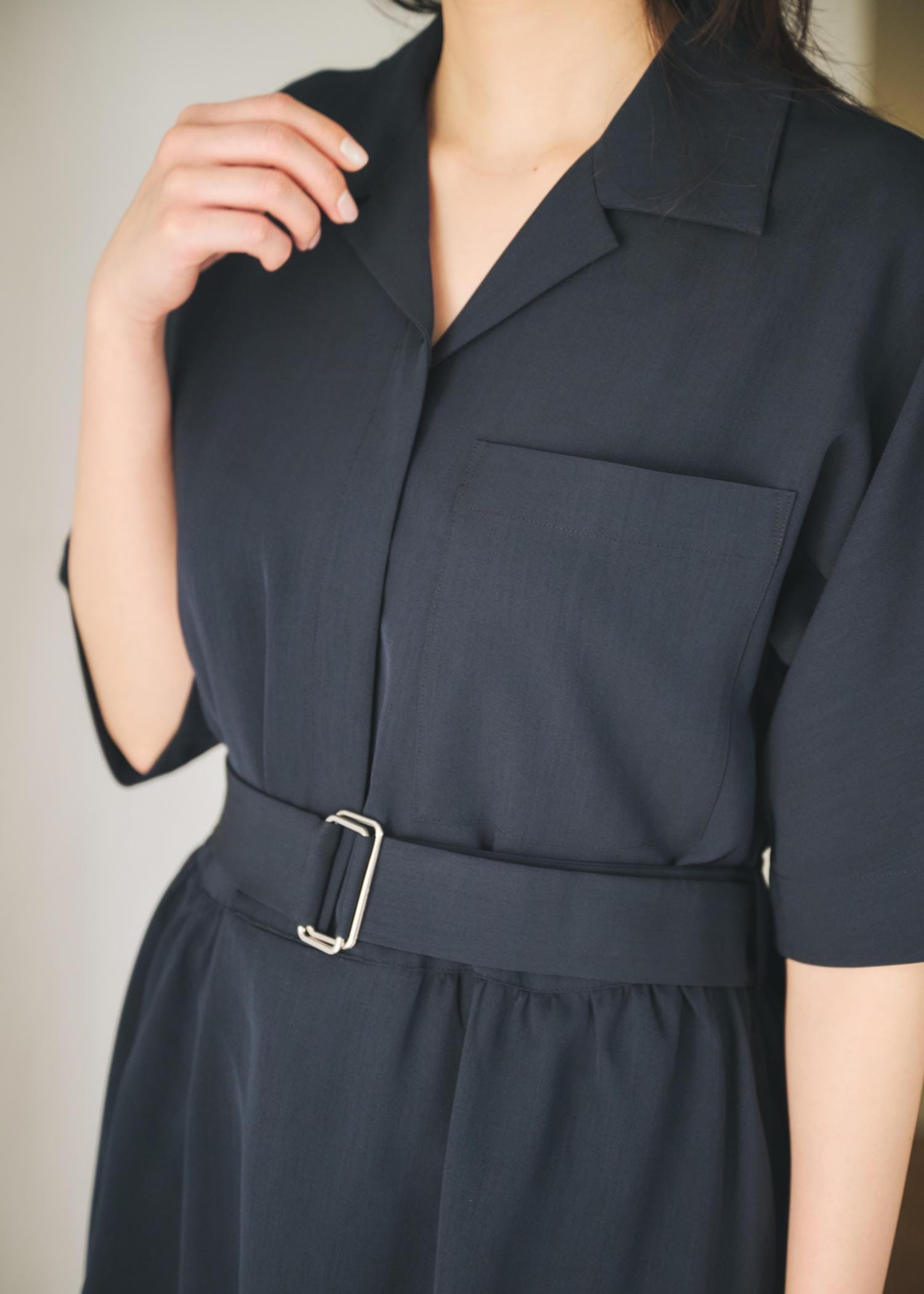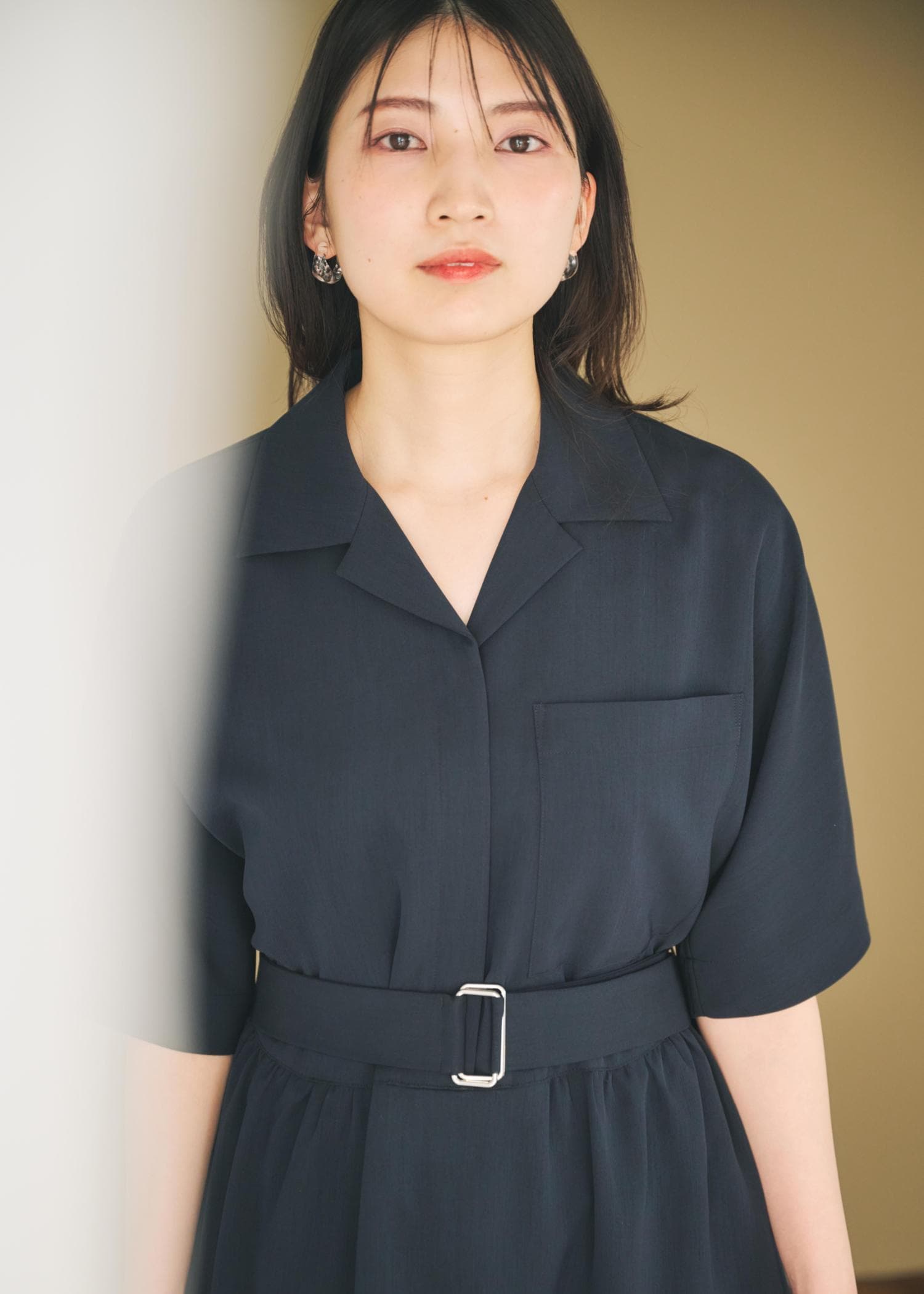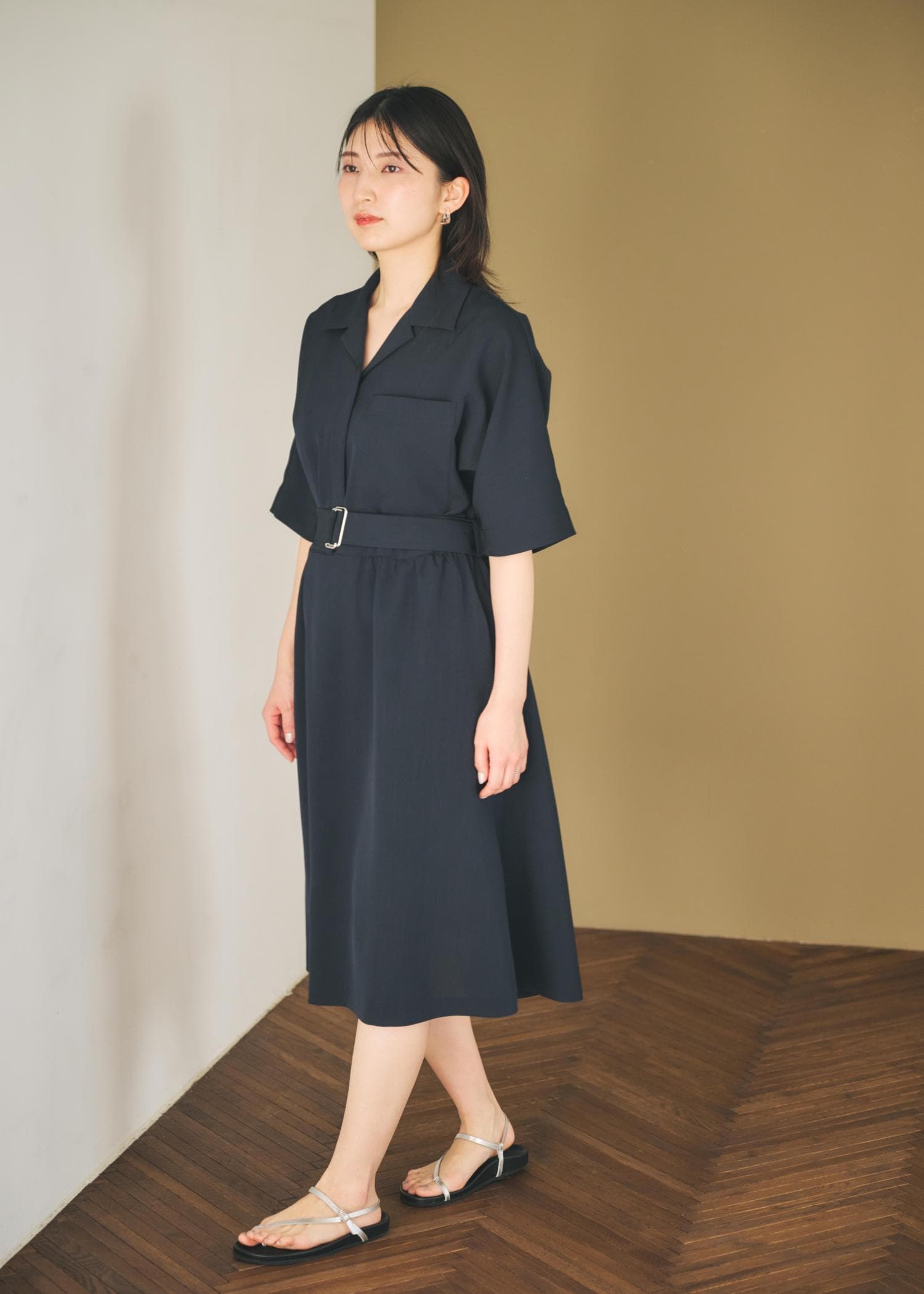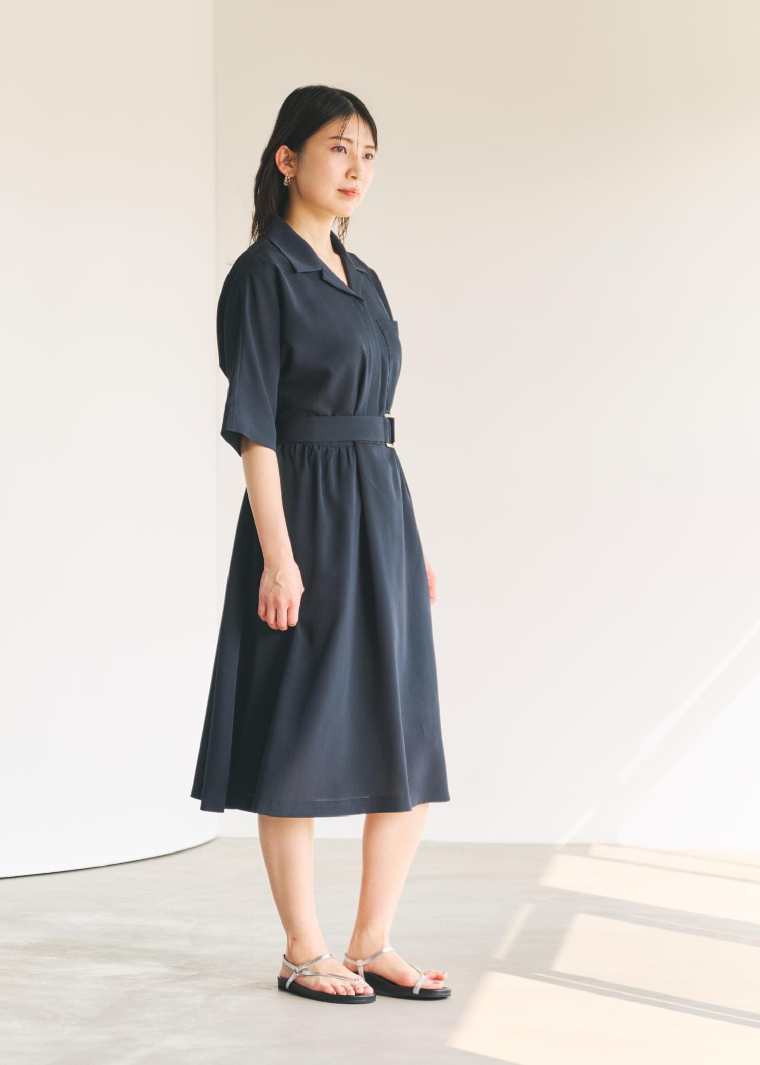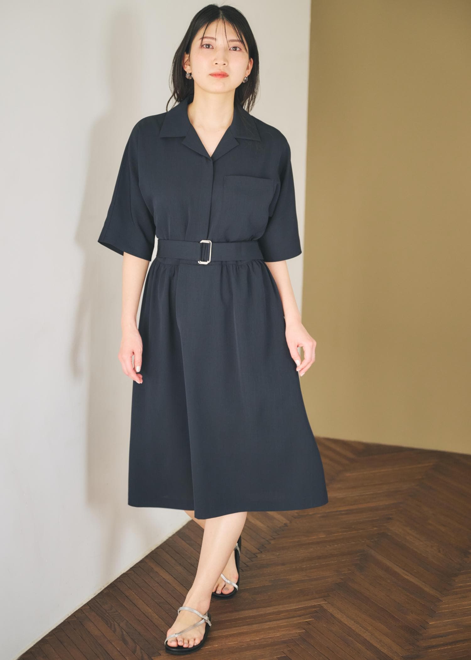 胸元がスッキリとした、ベーシックな開襟シャツワンピースです。