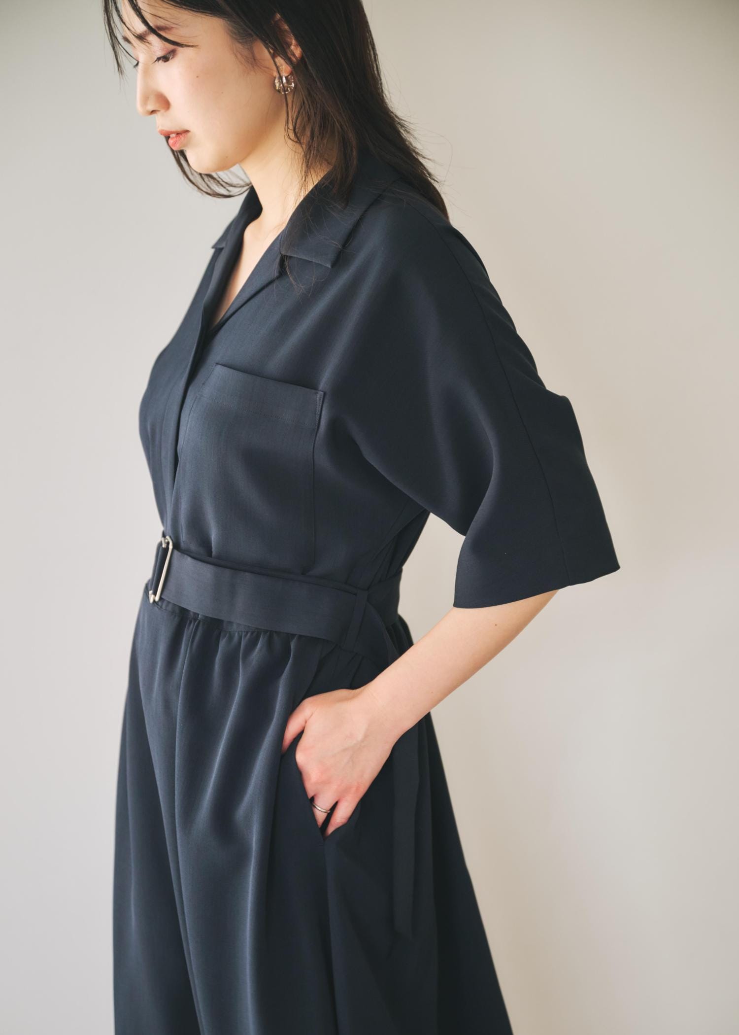 シックなネイビーとウエストベルトがつくる美シルエット。