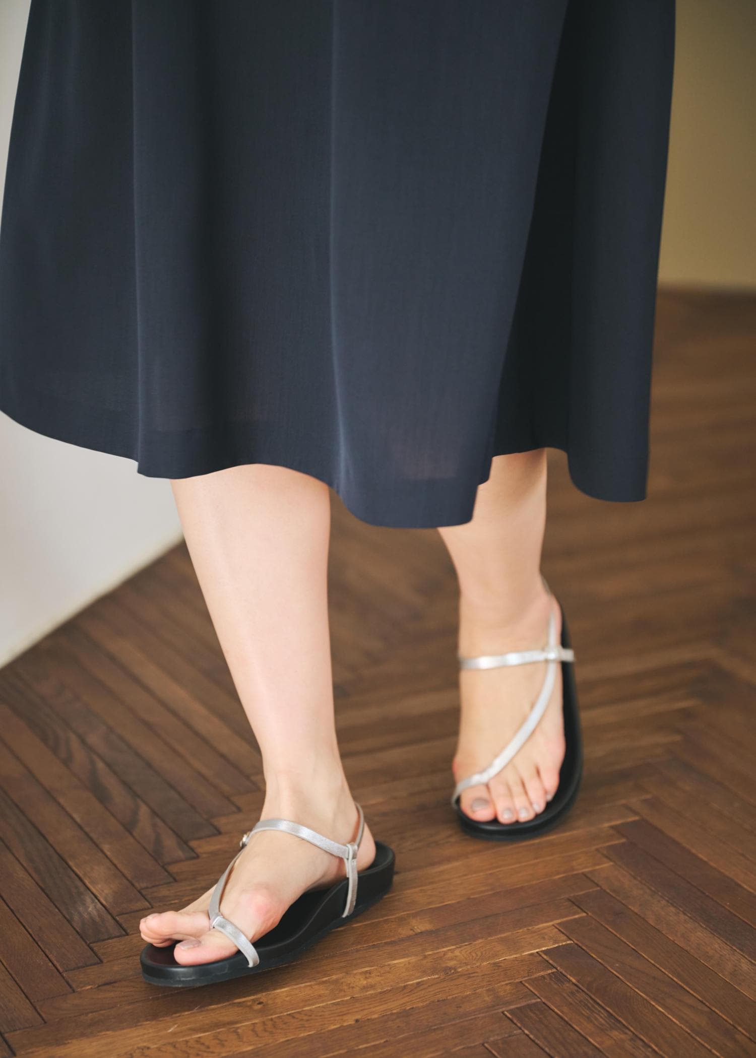 華奢感がありながら、クッション性のあるフットベットで素足で履き心地の良い、ナローストラップサンダルです。
