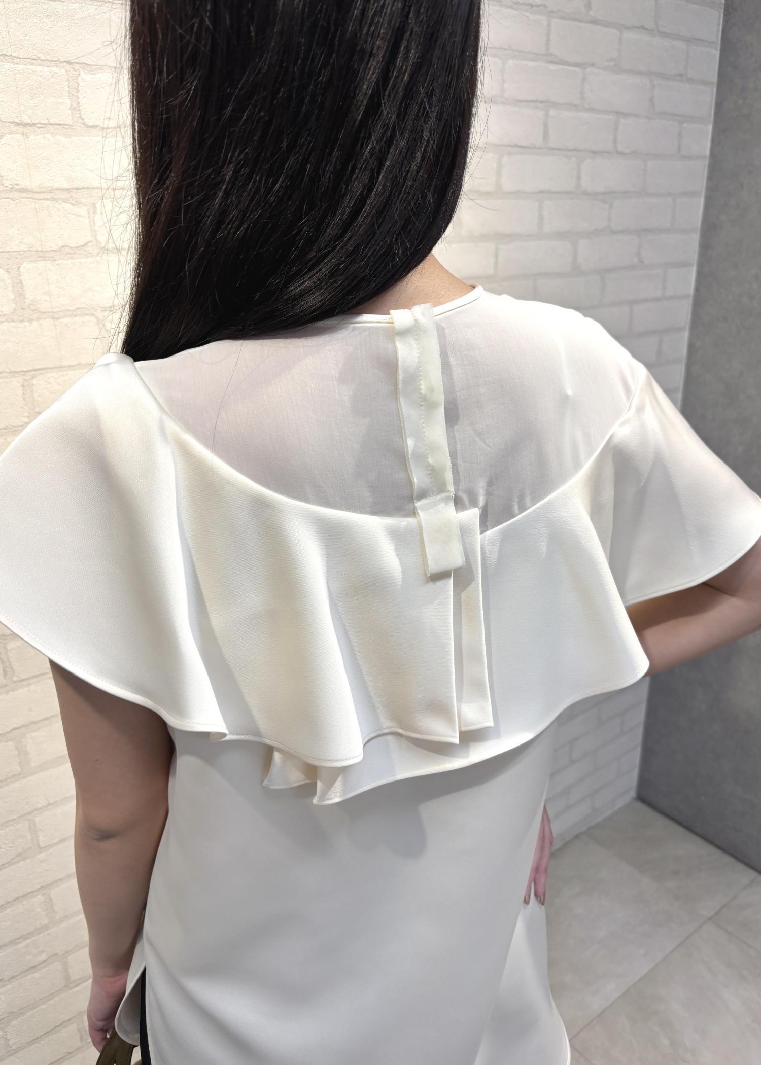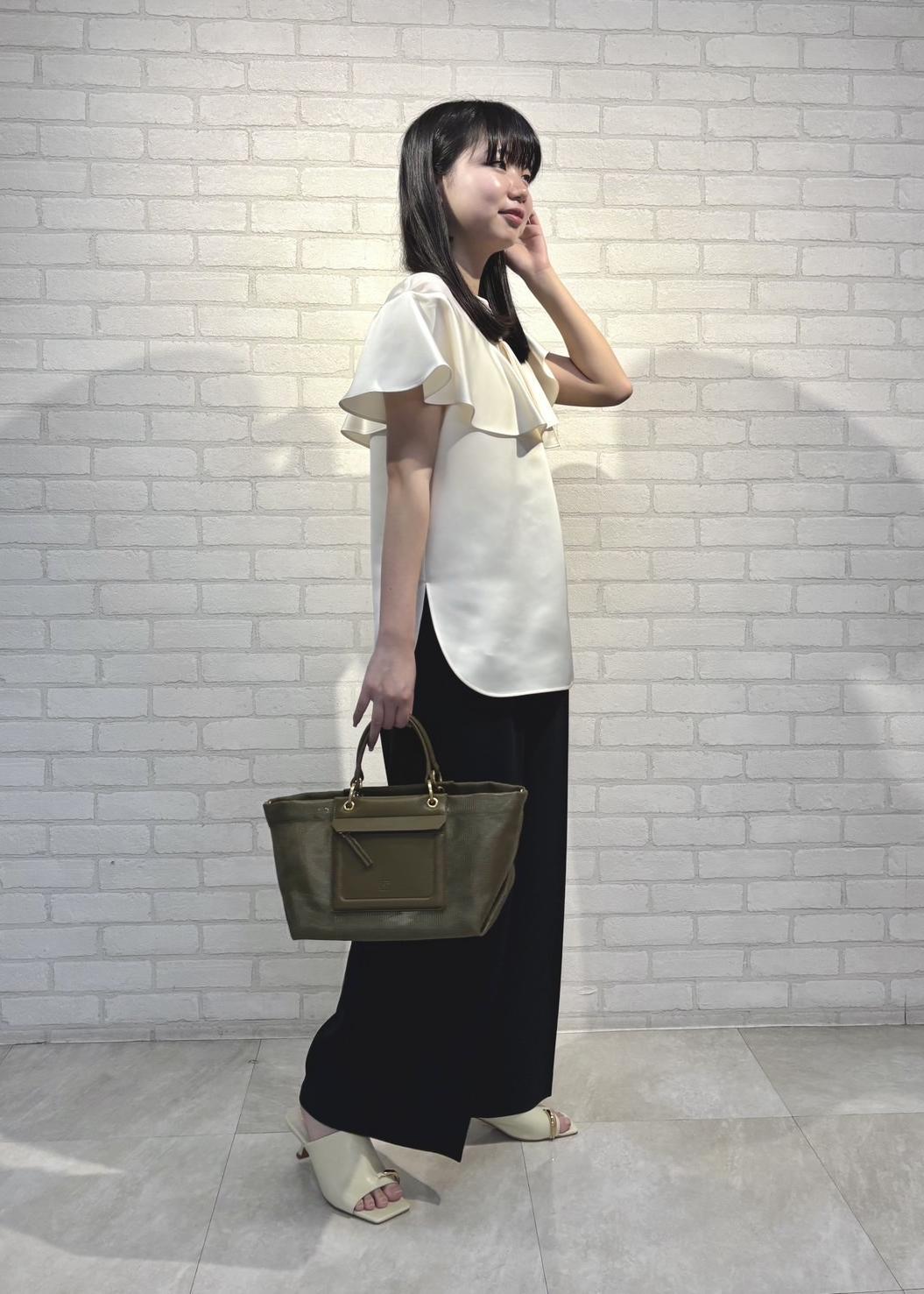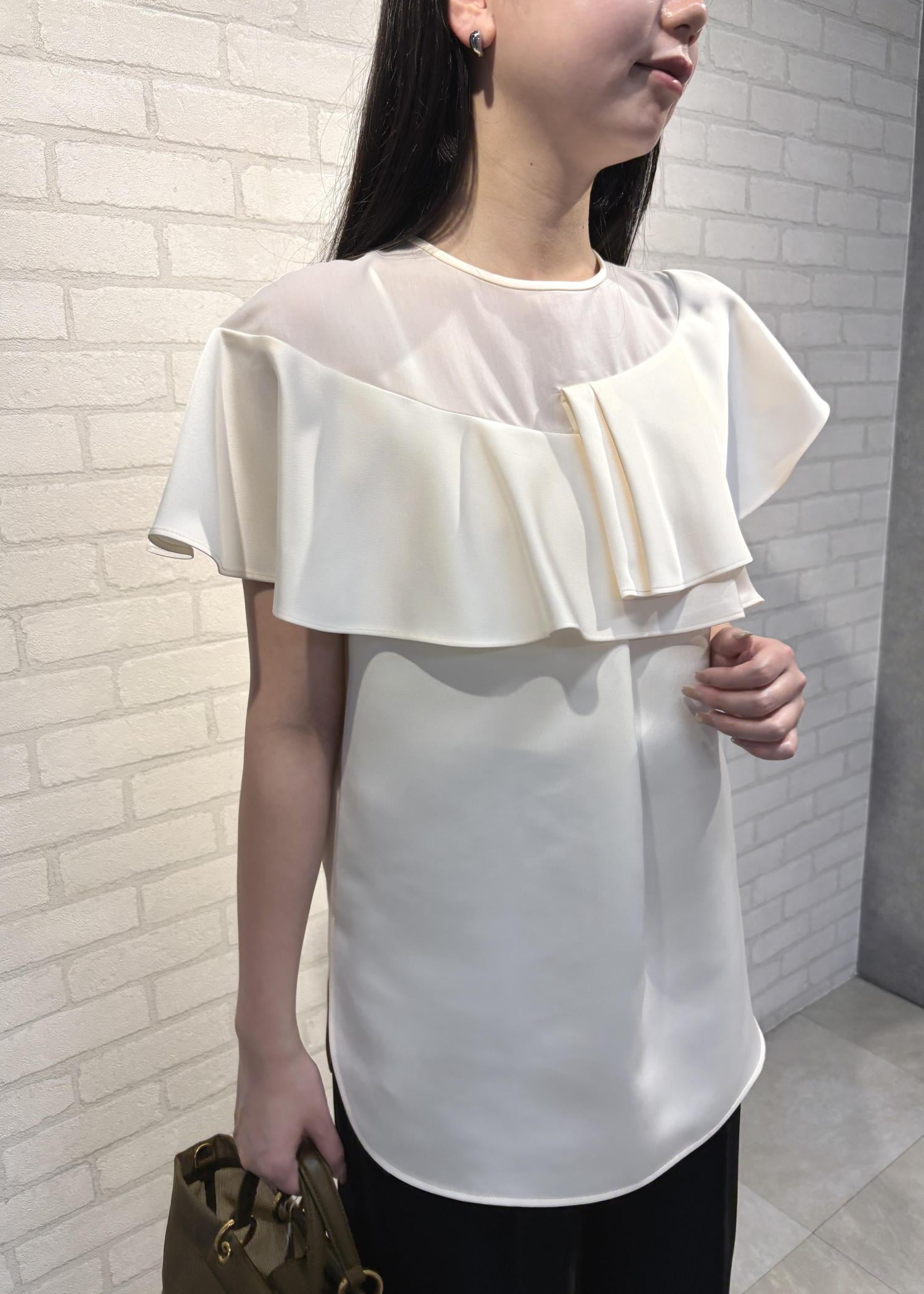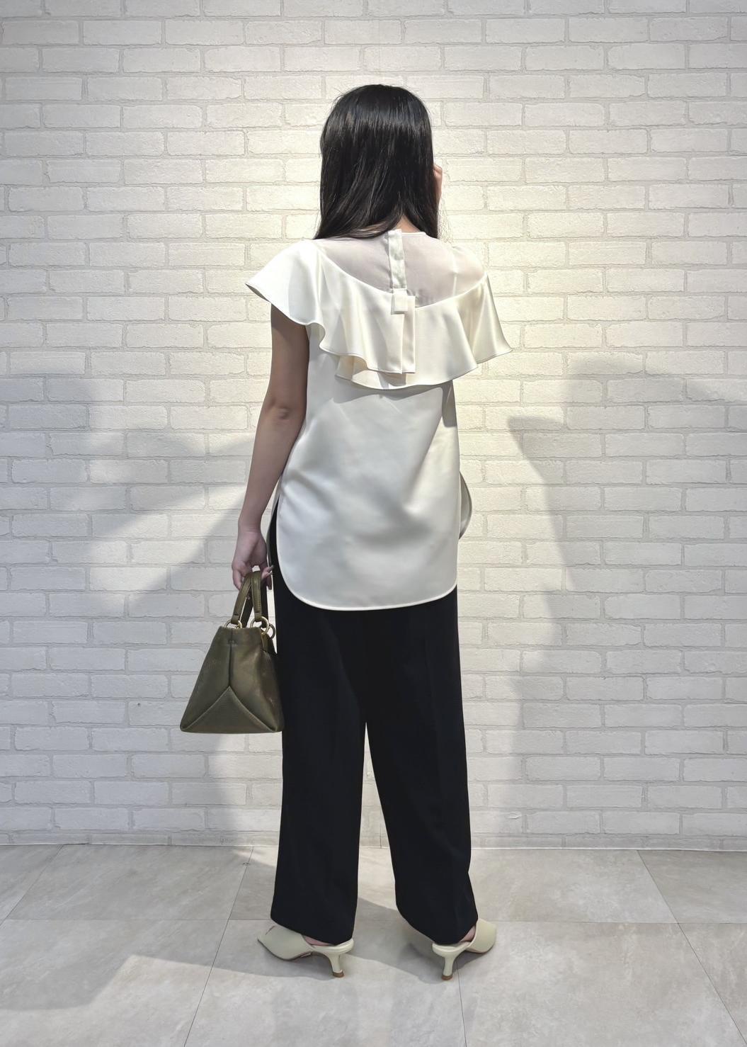 サテンのトップスはキレイめな印象ながらも、デコルテの透け感とラッフルの動きが夏の涼しげな雰囲気をプラス♪
