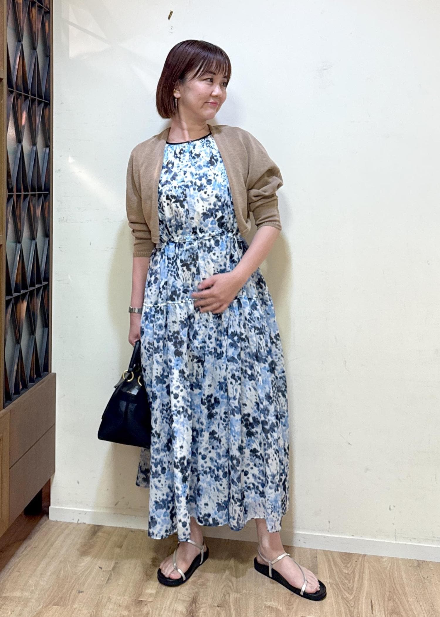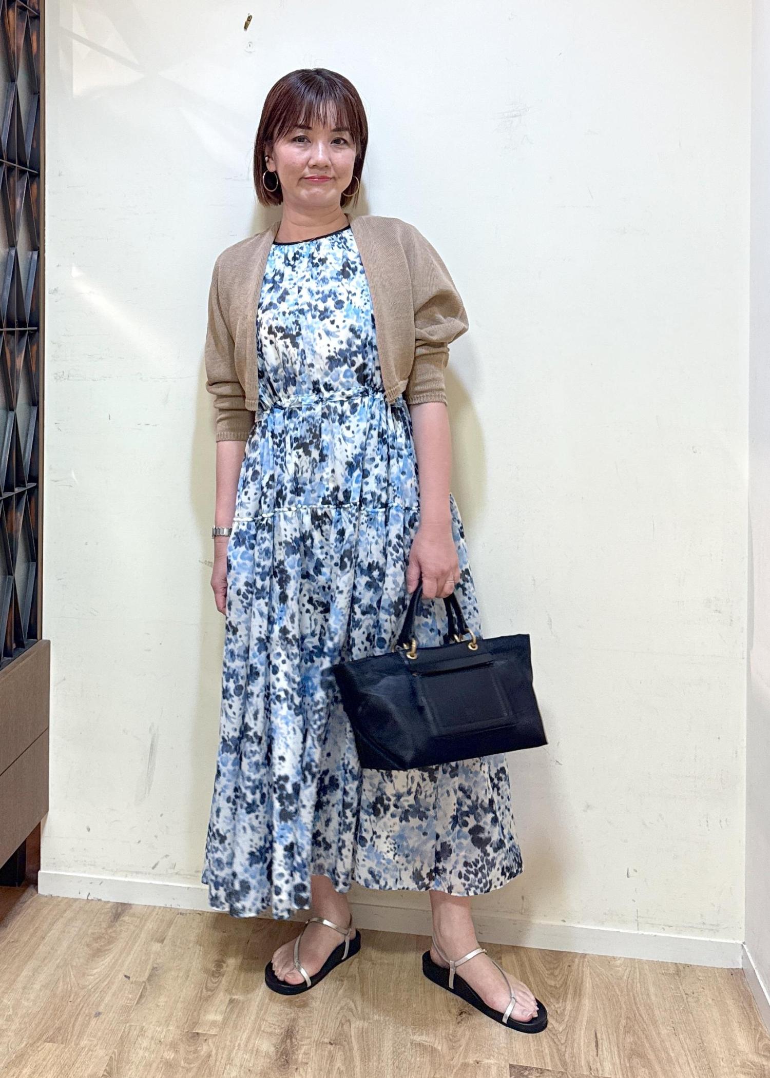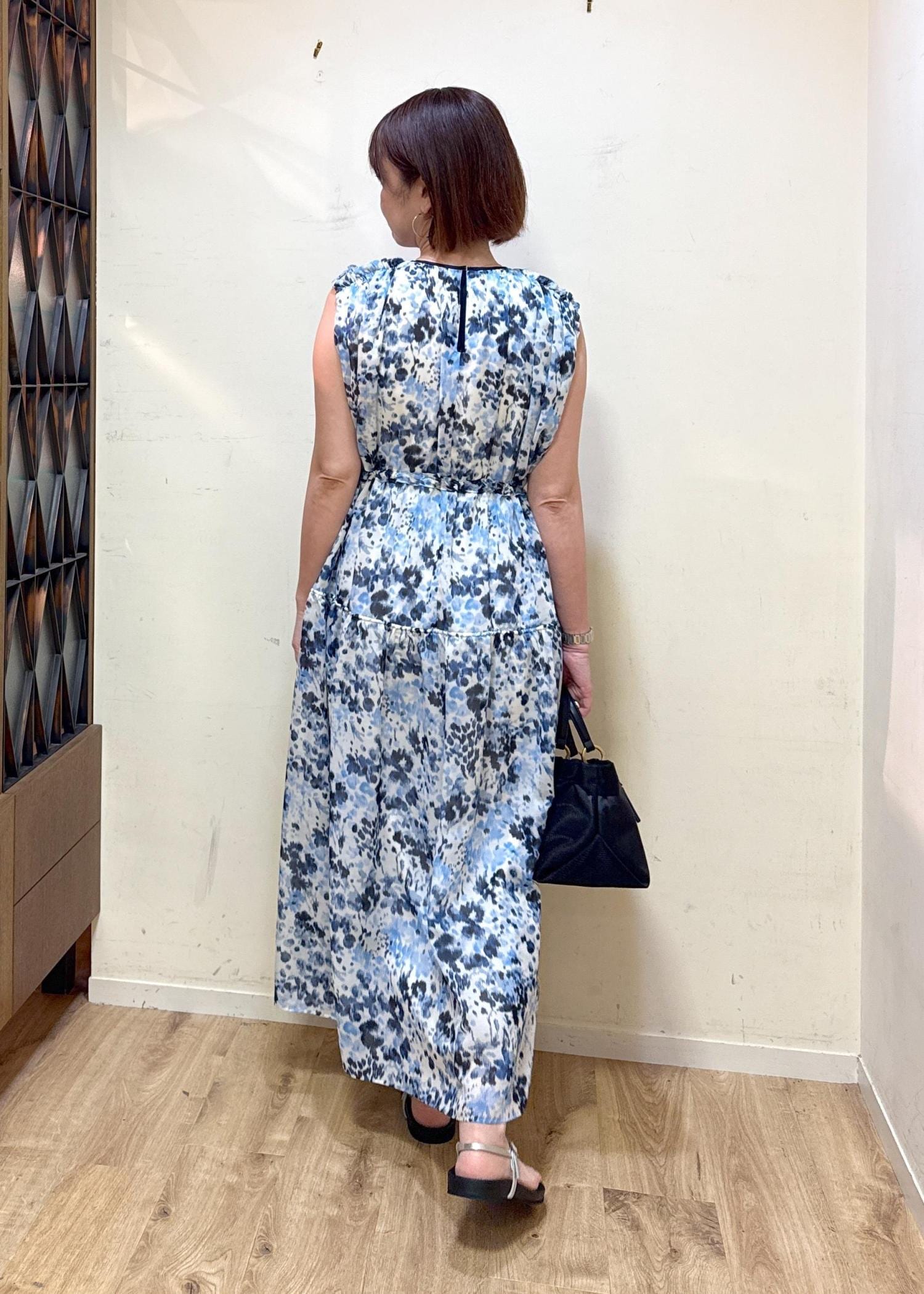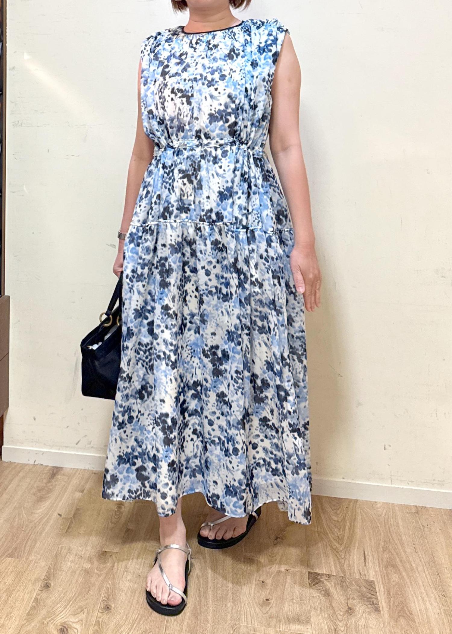 かすれた様なブルーの水彩画のフラワープリントがとても涼しく見えてこれから暑い夏に着たくなるワンピースです。