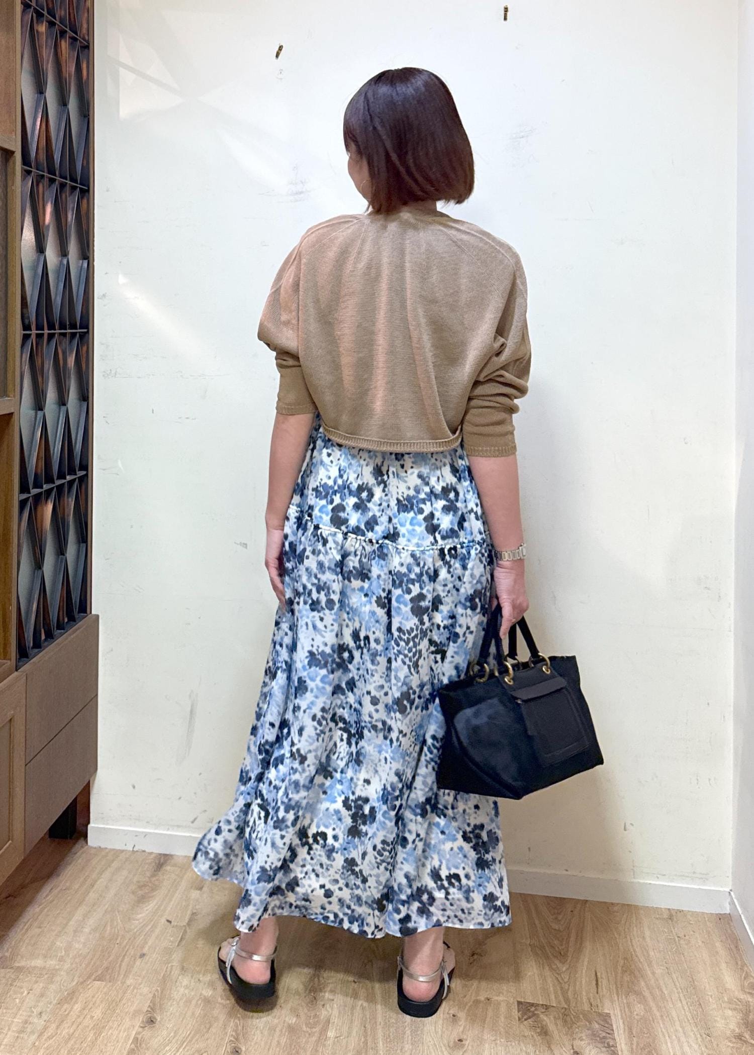 着丈はかなり短めなのでロングワンピースやノースリーブなトップスにスタイリングしやすいカーディガンです。ペーパーヤーン特有のシャリ感と軽さがあって真夏の羽織にも清涼感が出せます。