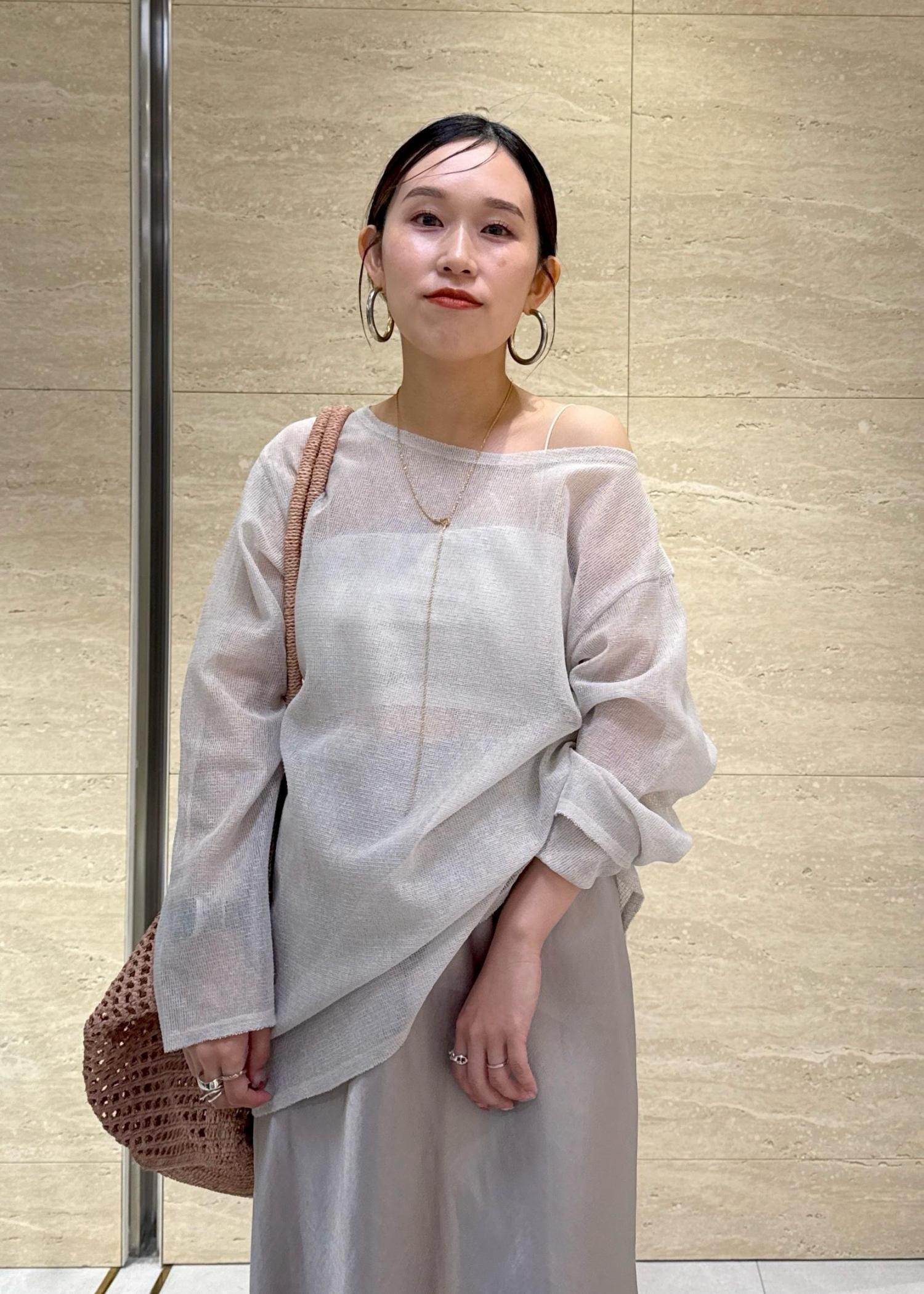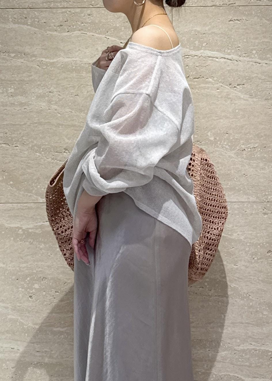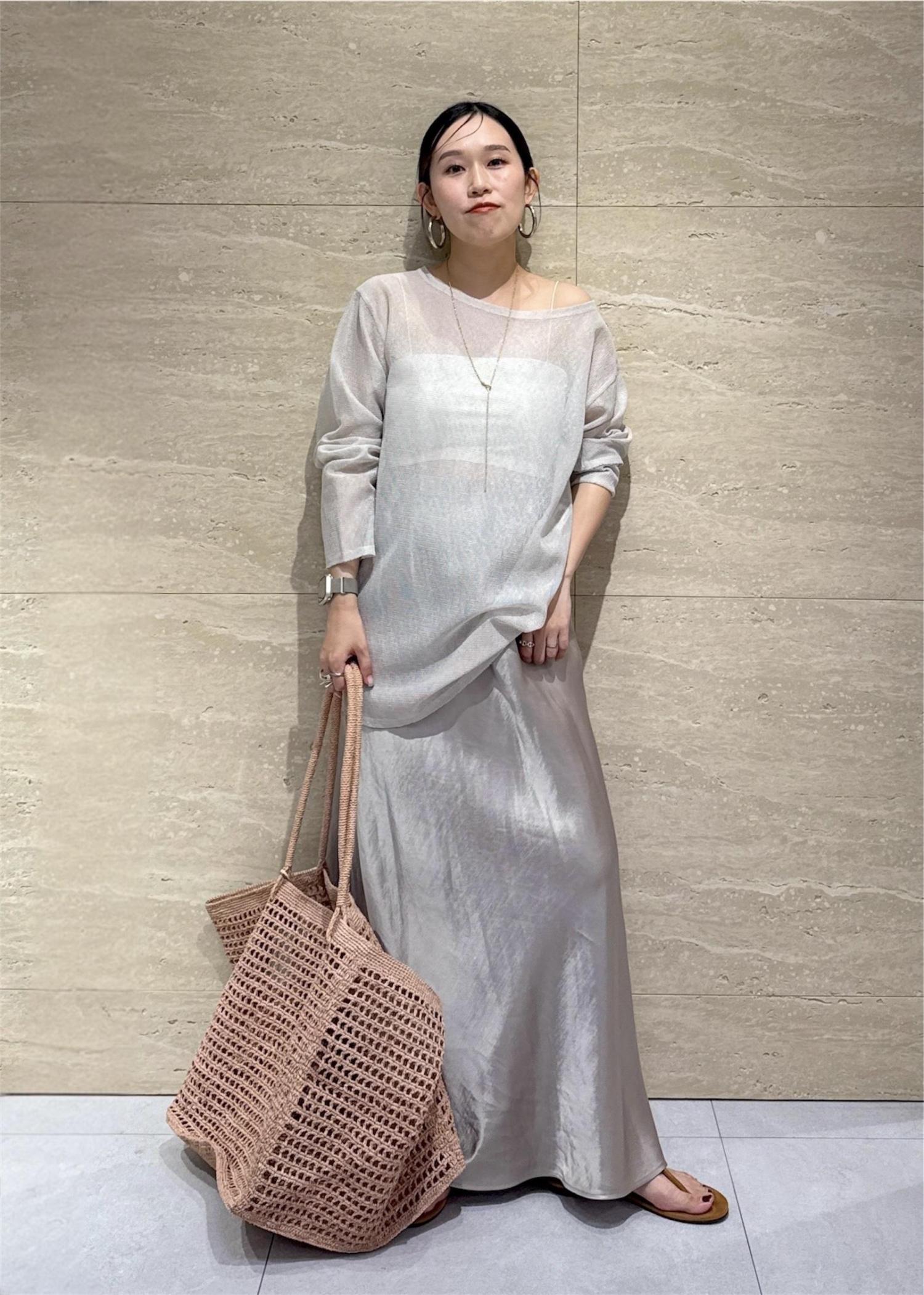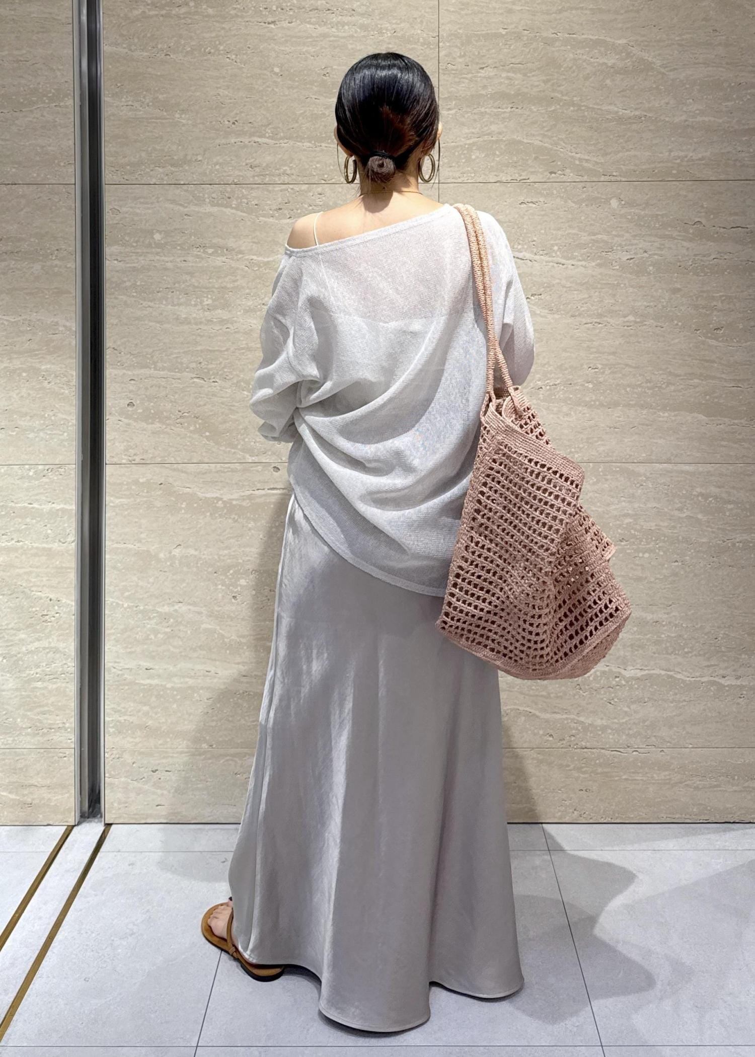 カジュアルになりがちなドライタッチな麻素材のトップスに、光沢のあるスカートを合わせ、女性らしい印象に◎