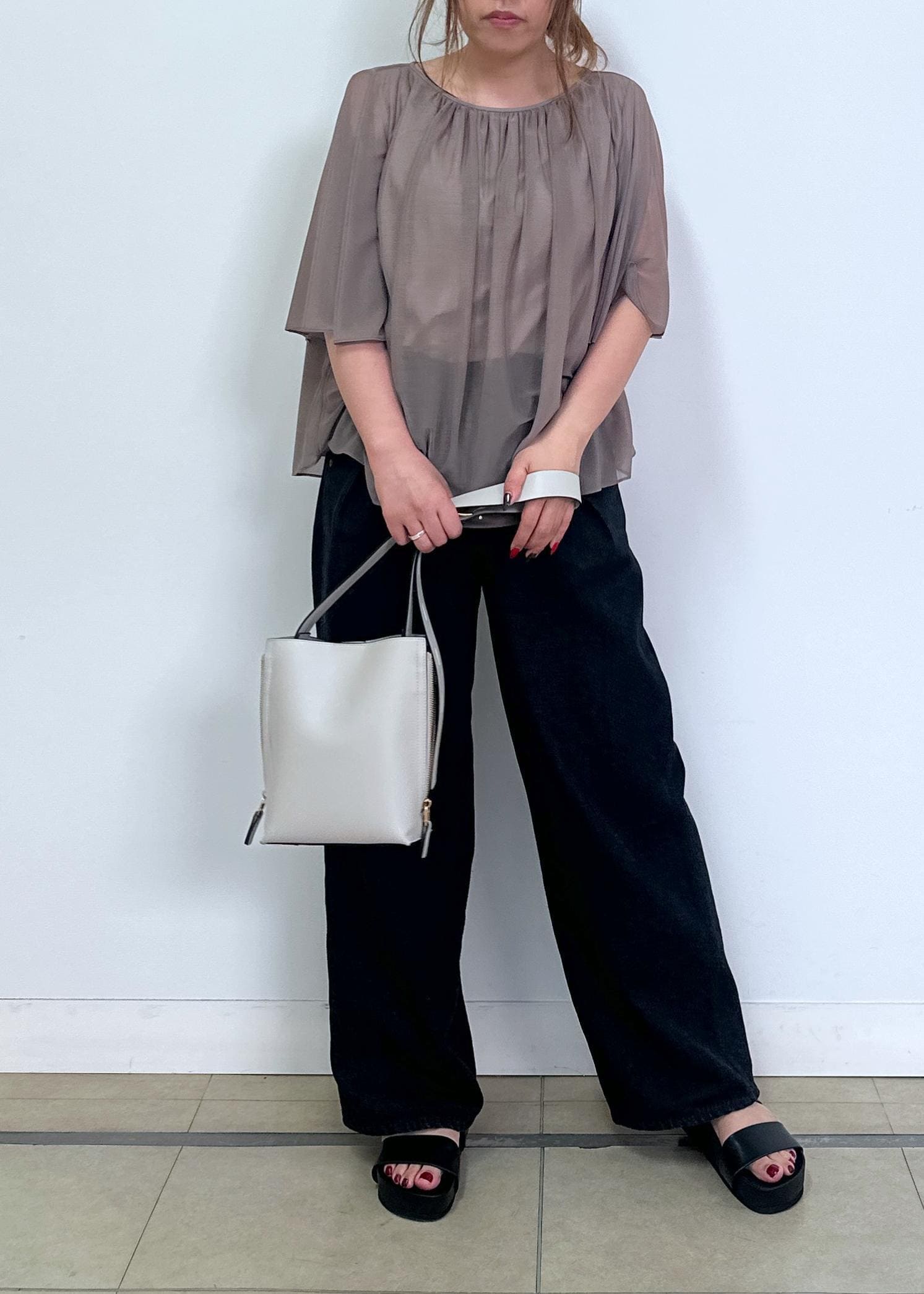 アウトレットROPÉ【洗える】ブライトネスヤーンギャザーブラウス/セットアップ対応ベージュ / F¥12,320レビュー身ごろは裏地が付いていて透けにくいです。サラッとしていて涼しいです♪ツヤがあるので、オンオフお使いいただけます◎