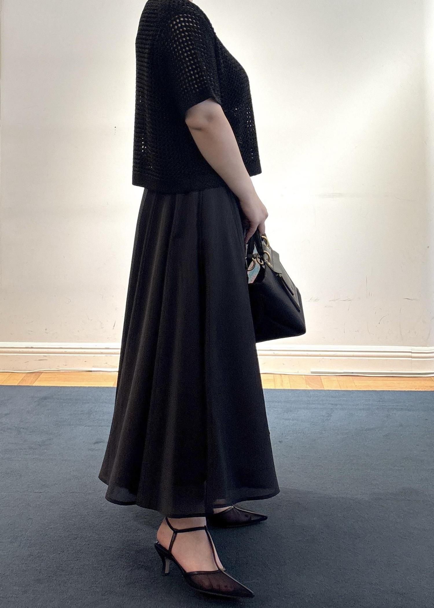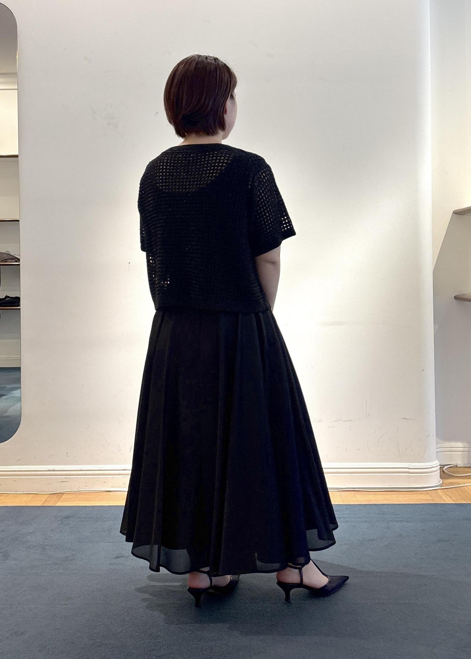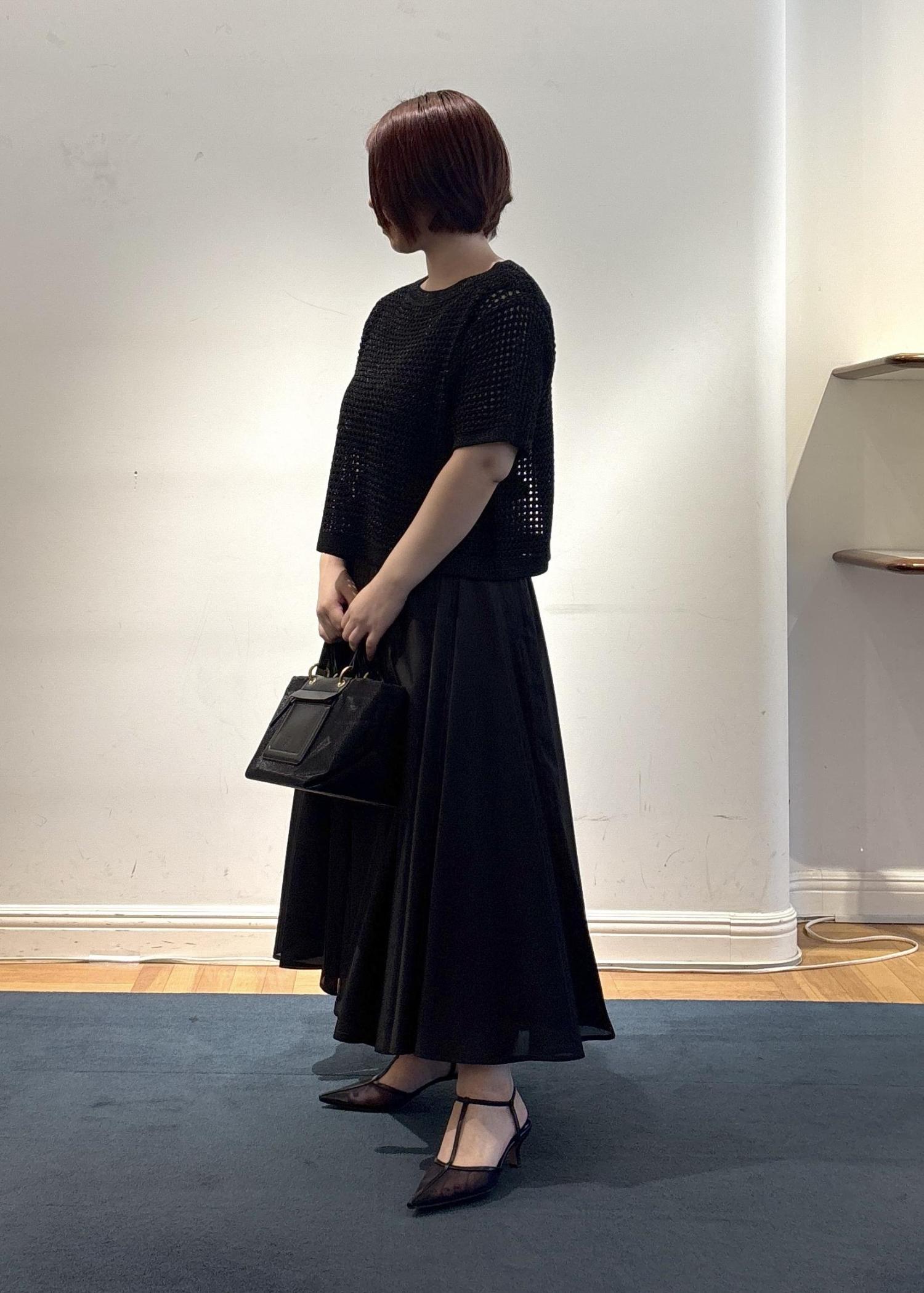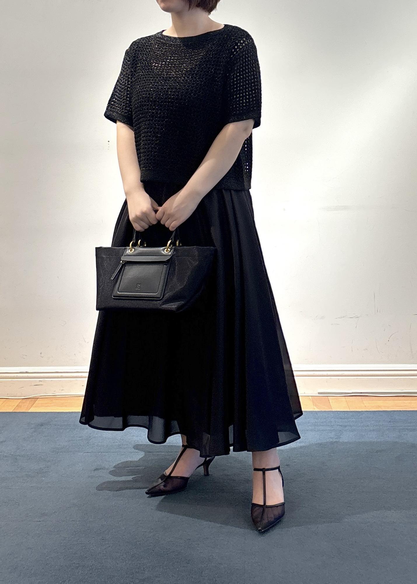 シンプルなワントーンコーデになりますが、トップスのラメ感やスカートの裾の透け感があるので華やかさがあります♪