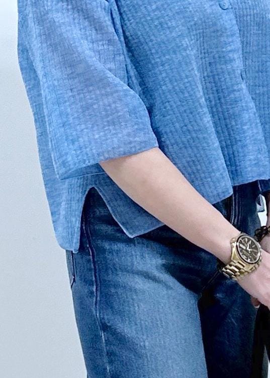 お袖もしっかりと長めなので、半袖デザインではありますが、腕周りを全体的にカバーしてスッキリ見せてくれます。