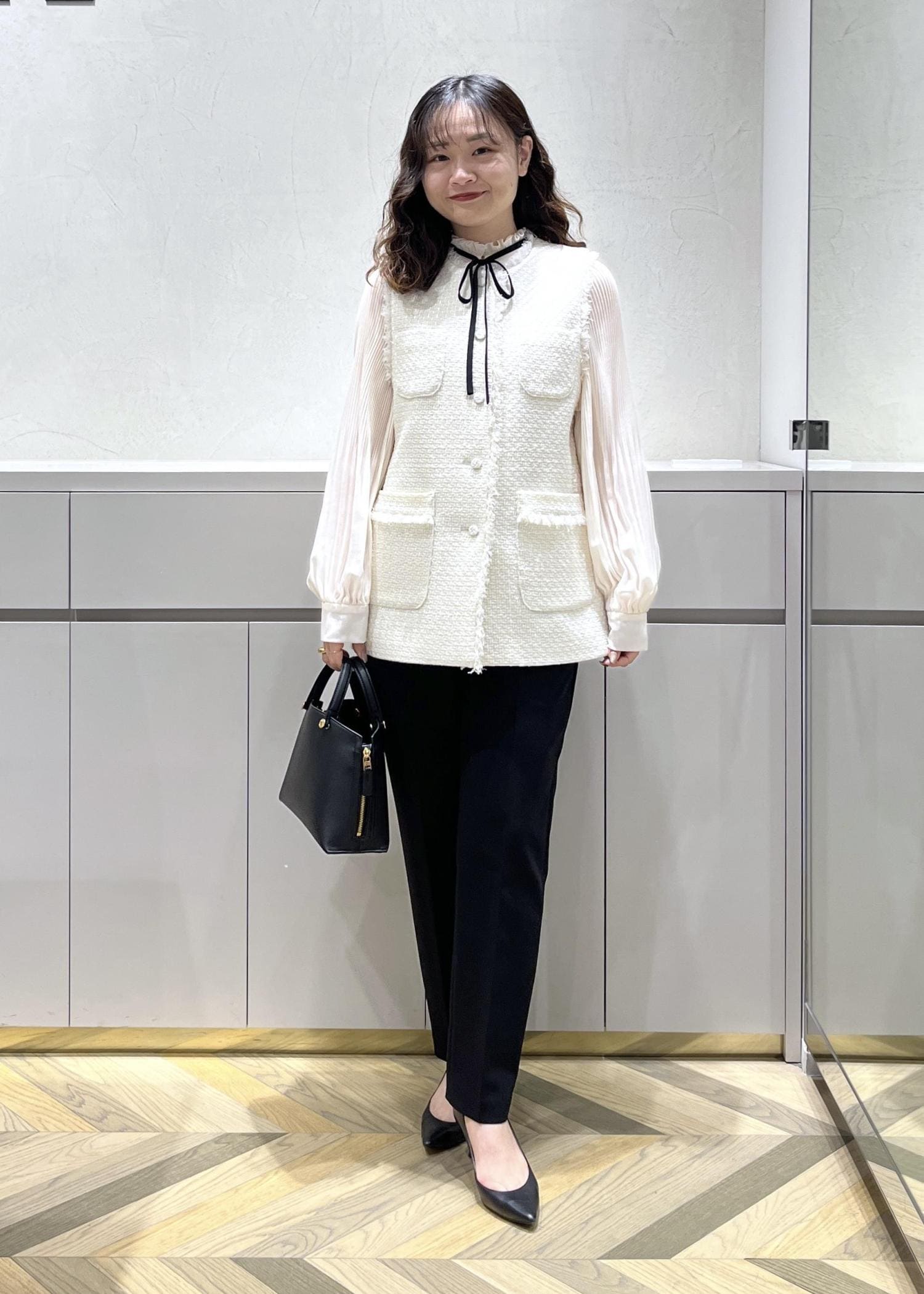 ドレープ感がエレガントなスカートと合わせ、