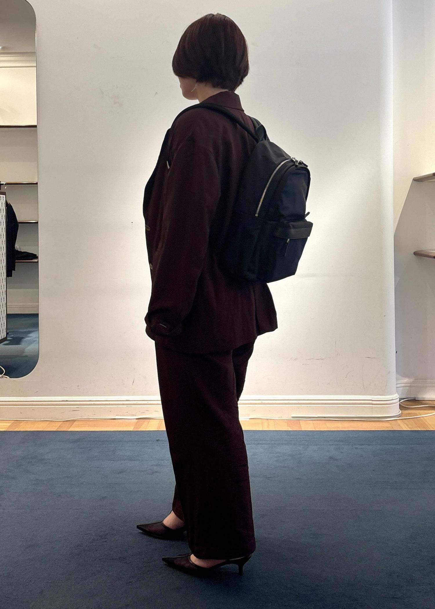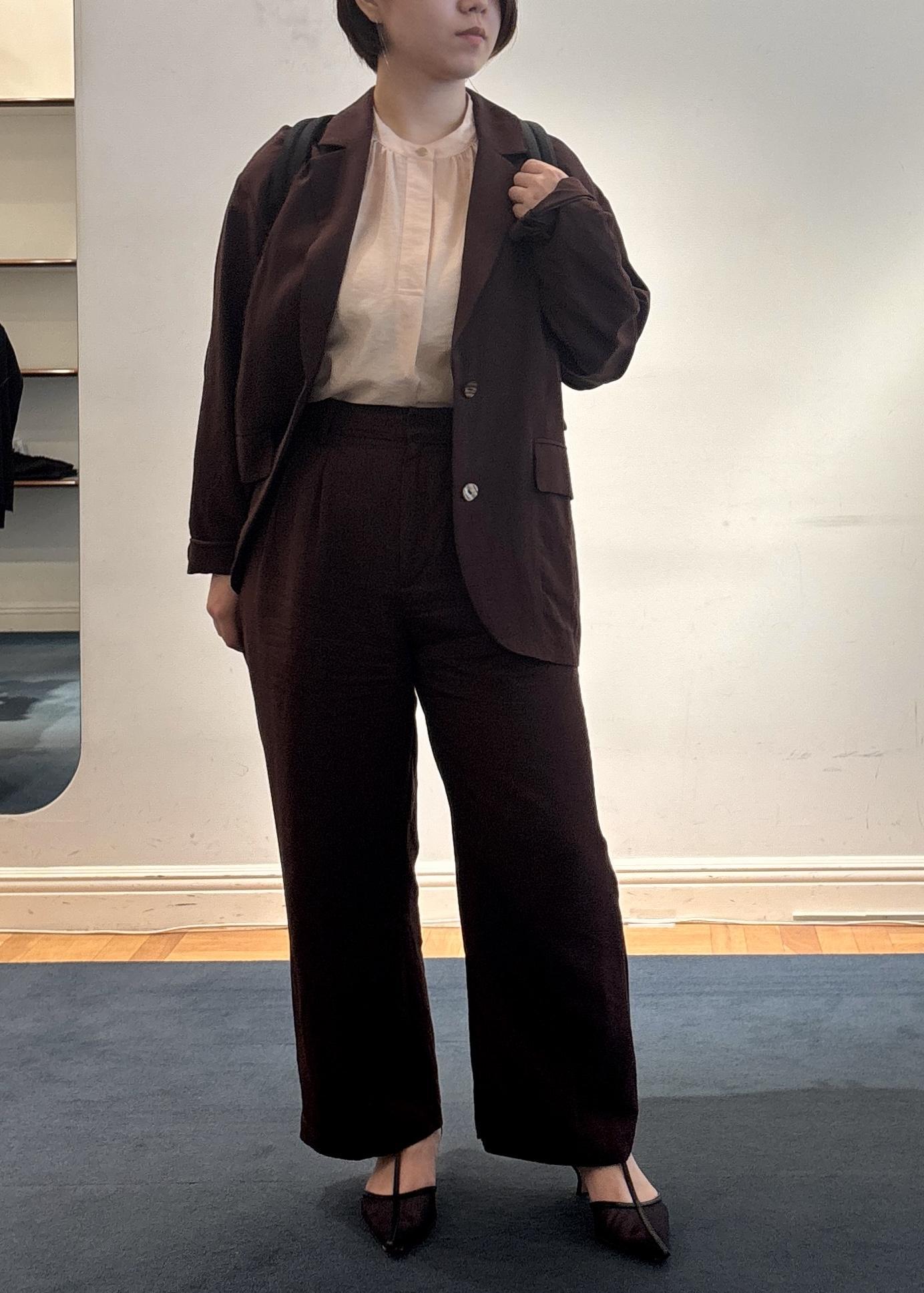 無地のセットアップに光沢のあるブラウスを入れることで華やかさもありカッコよく仕上がります♪