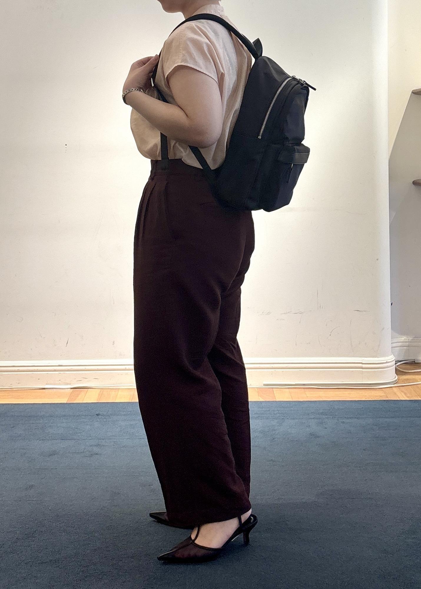 後ろのポケットにスマホ(iPhone16)を入れていただくと頭が少し見えます。前のポケットは深くシルエットに響かないものになっておりますので小物を入れていただいても大丈夫です!