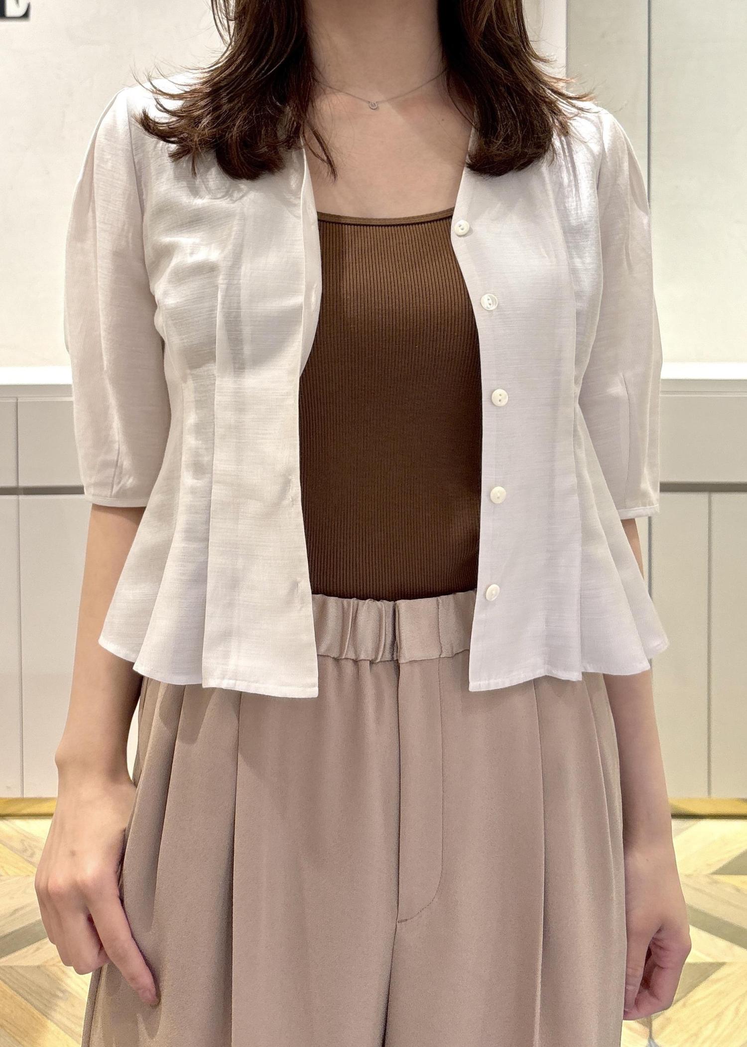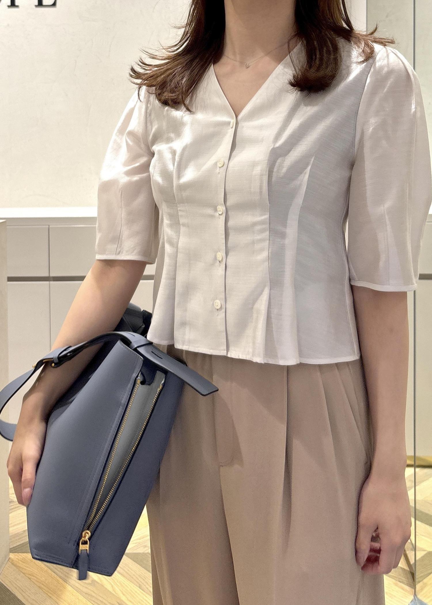 ROPÉ【洗える・羽織にもなる】Vネック5分袖パフスリーブブラウスホワイト系 / F¥18,700レビューウエストに少し絞りが入りスタイルアップ効果のあるデザイン。1枚着としても前を開けて羽織としても着用いただけます。程よく艶のある素材感。全体のサイズ感はややゆったり、着丈は腰骨上あたり。